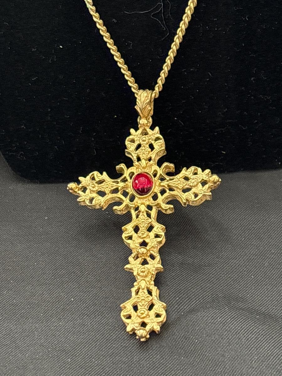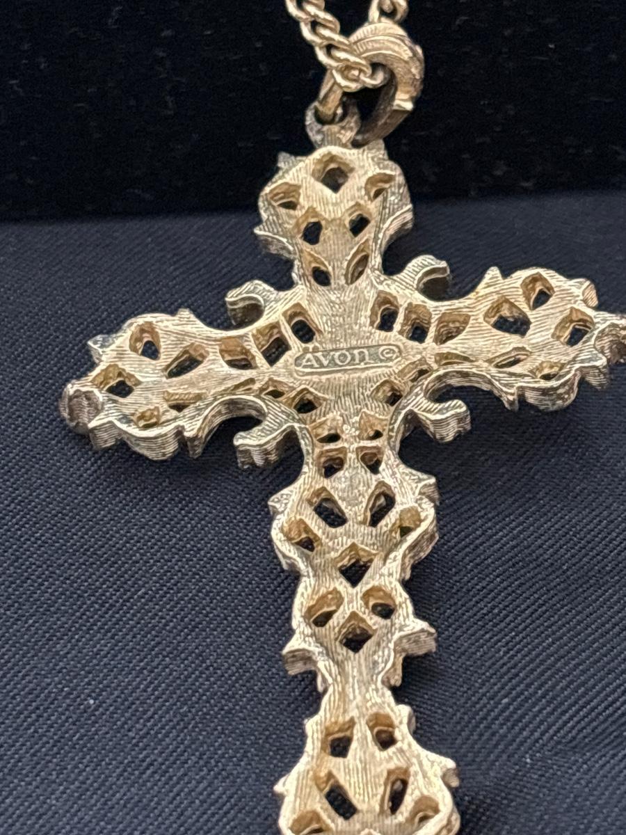 Avon 1974 "Romanesque" filigree gold tone cross pendant necklace
