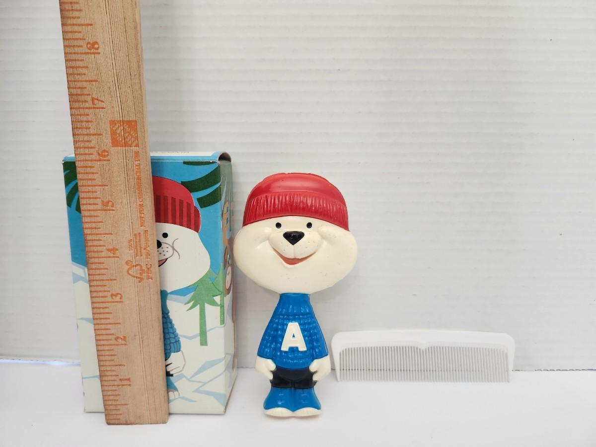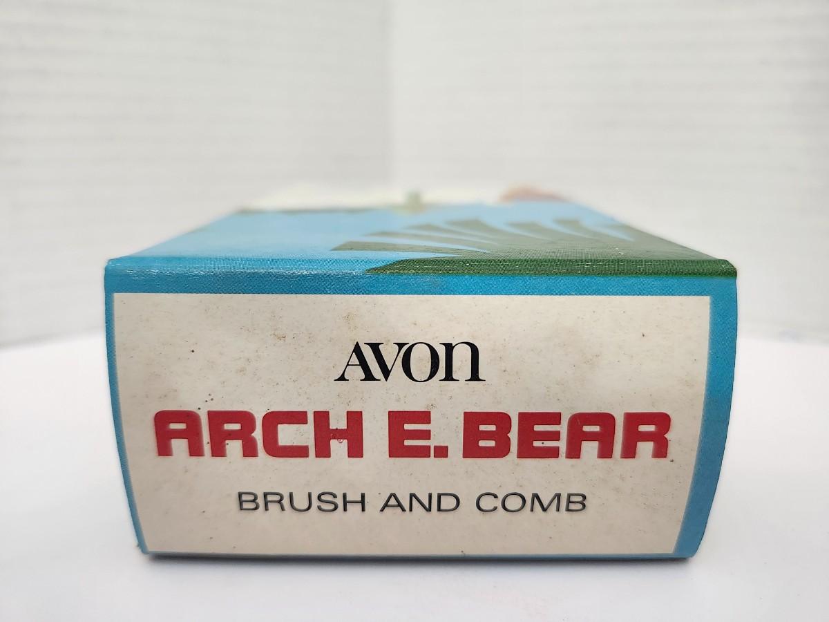 Avon Arch E. Bear brush and comb set featuring bear character figure wearing winter hat and sweater with letter A. Includes original illustrated Avon box labeled Arch E. Bear Brush and Comb. Plastic novelty grooming set designed for children. Listing reflects only what is shown in the photos with no assumptions about age, use, or condition beyond visible details.