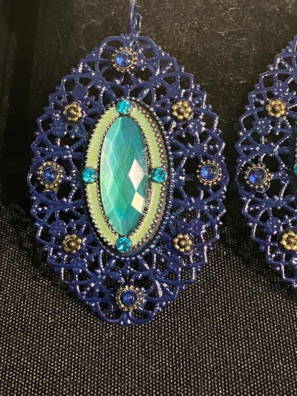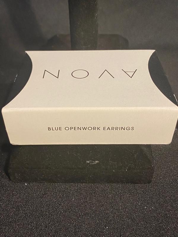 AVON Blue Openwork Earrings. Dark blue with bright blue center. For pierced ears. Come in original Avon box, believe to be never used.