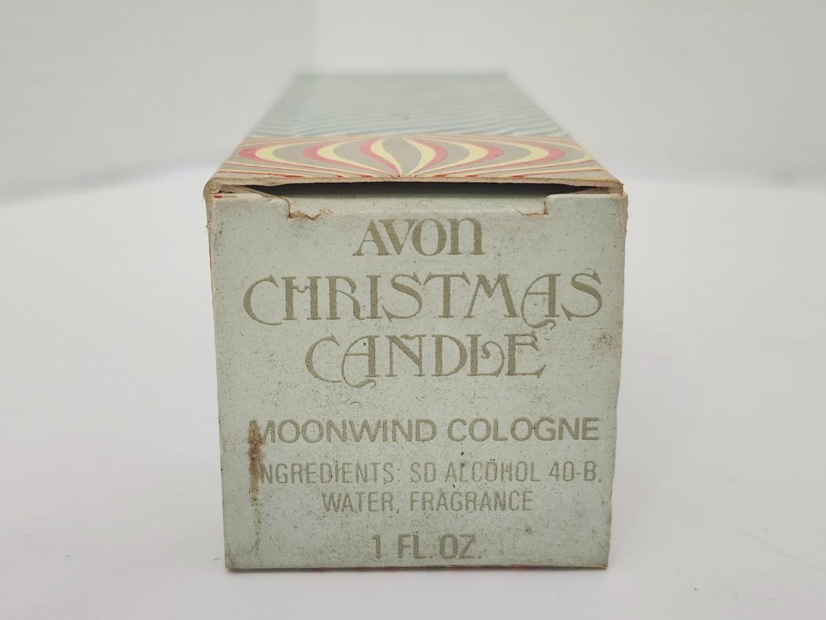 Avon Christmas Candle Moonwind cologne labeled 1 fl oz. Green textured glass bottle designed in a candle form with a copper tone flame style cap. Original Avon Christmas Candle box included, with decorative striped design and Moonwind cologne labeling and ingredient text visible. Listing reflects only details shown in the images, with no assumptions beyond labeled and visible features.
