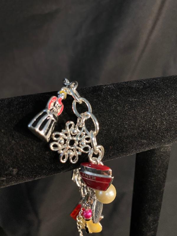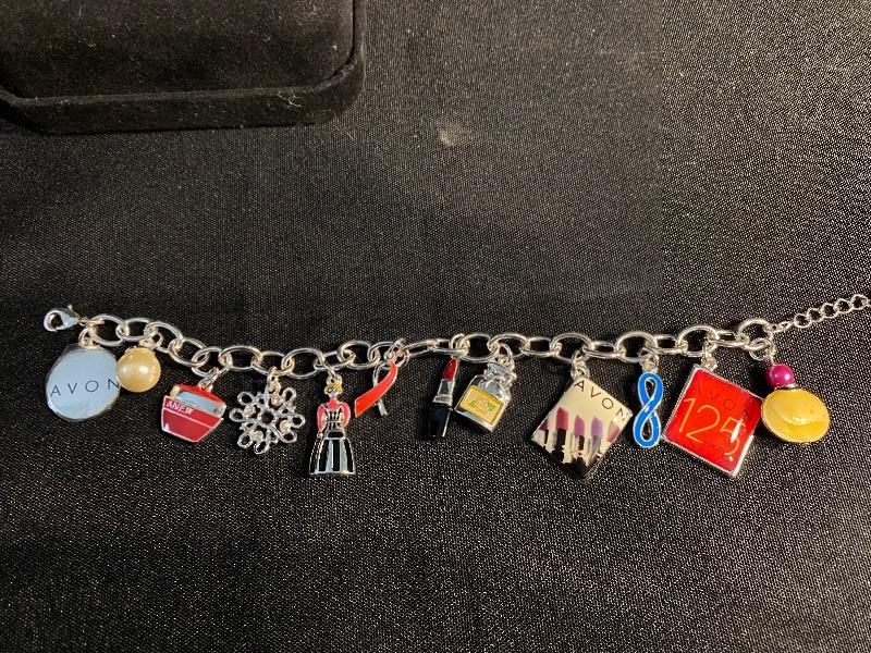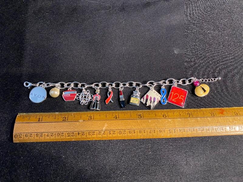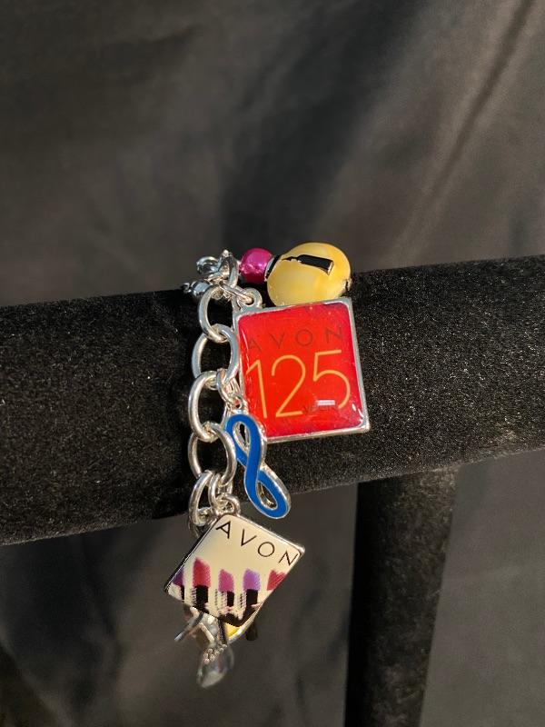 AVON Collectors Charm Bracelet. 125 year anniversary bracelet. Different Avon inspired charms. Silvertone. 8" length.