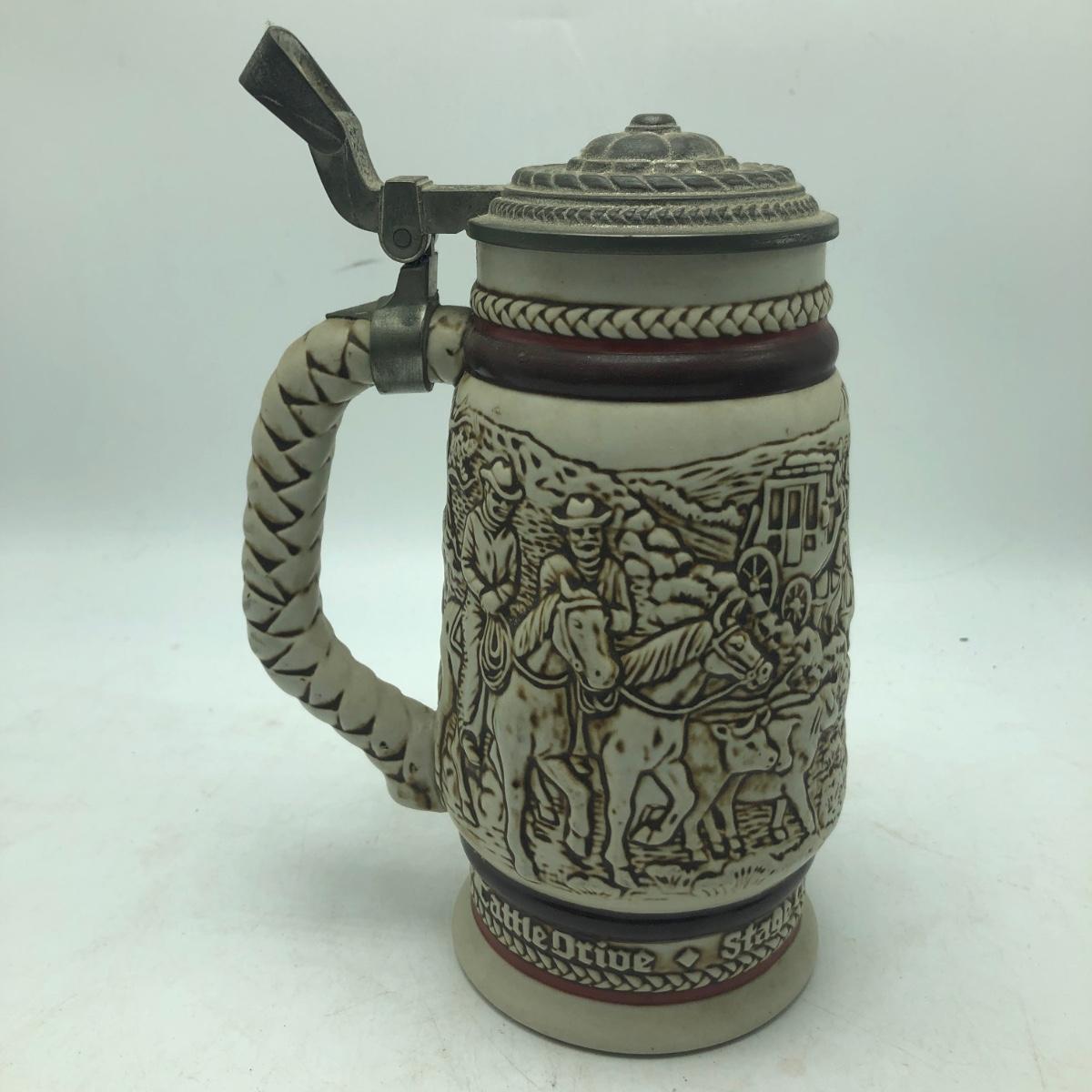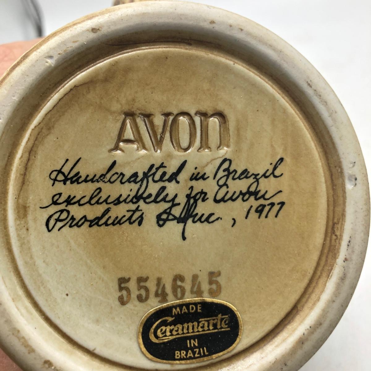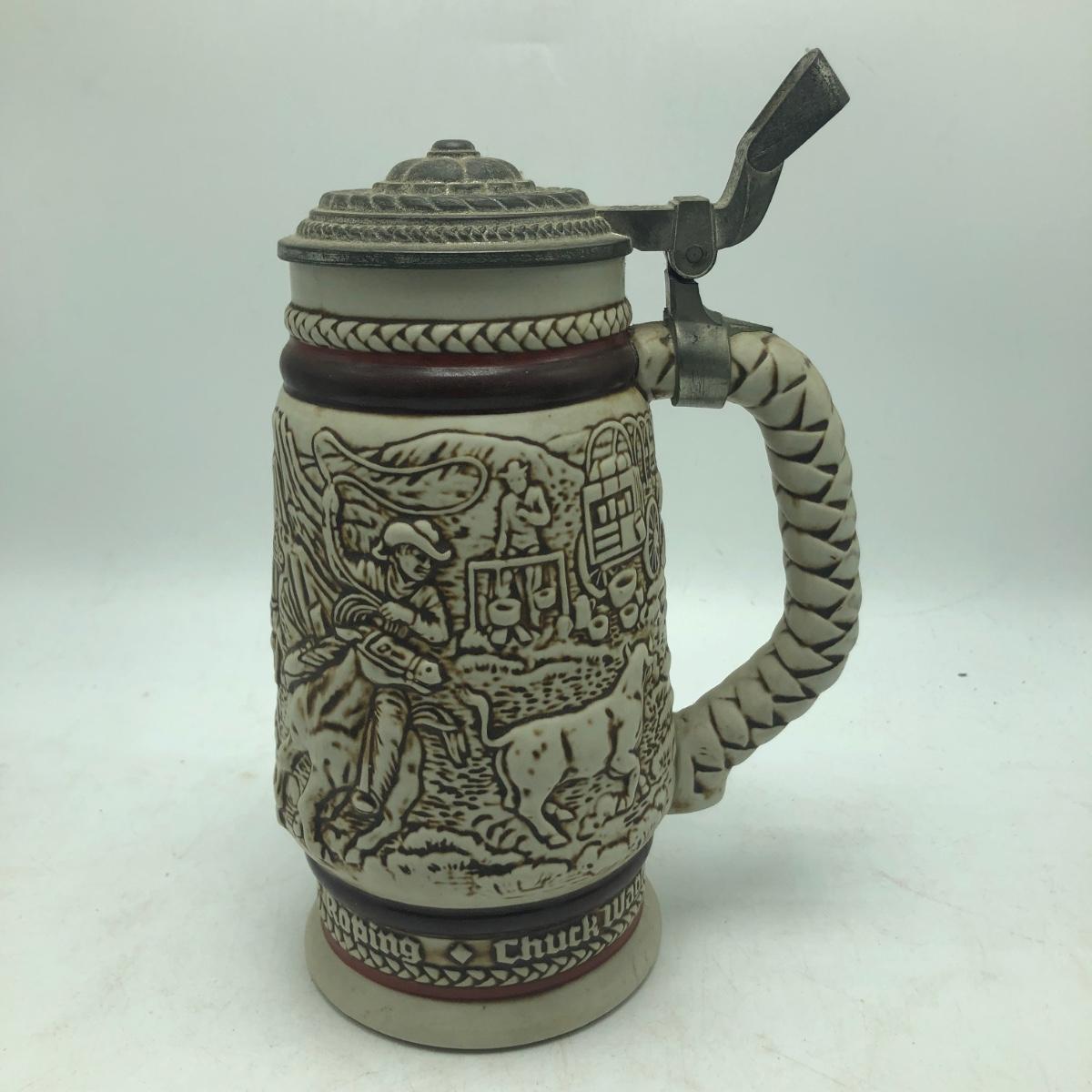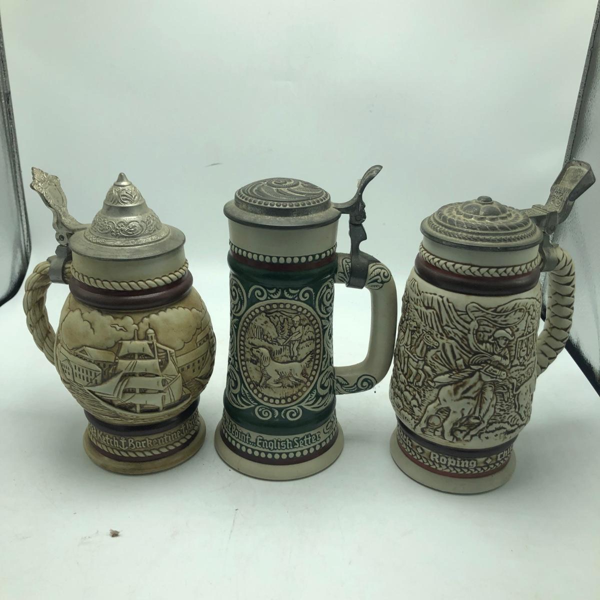 Lot includes Avon English Setter stein with small crack at bottom, Roping and Barkentine steins. Steins are from 1977, 1978 and 1980. Largest stein measures 4” x 5” x 9”.
