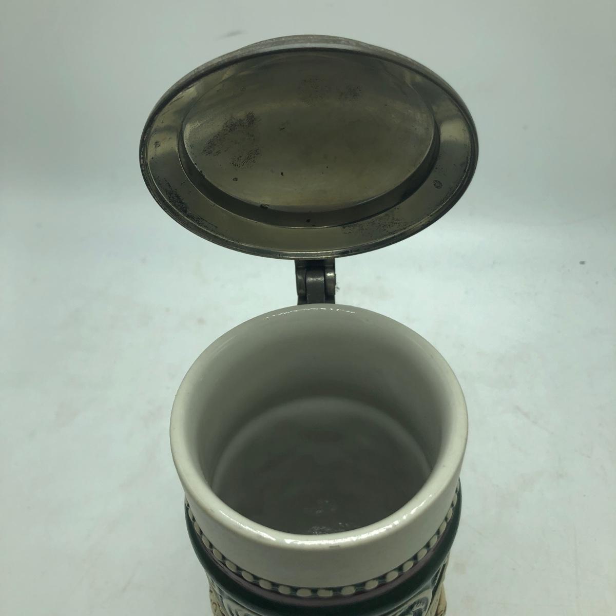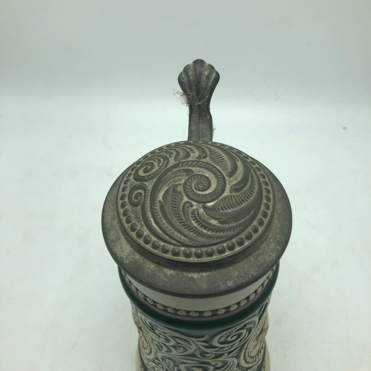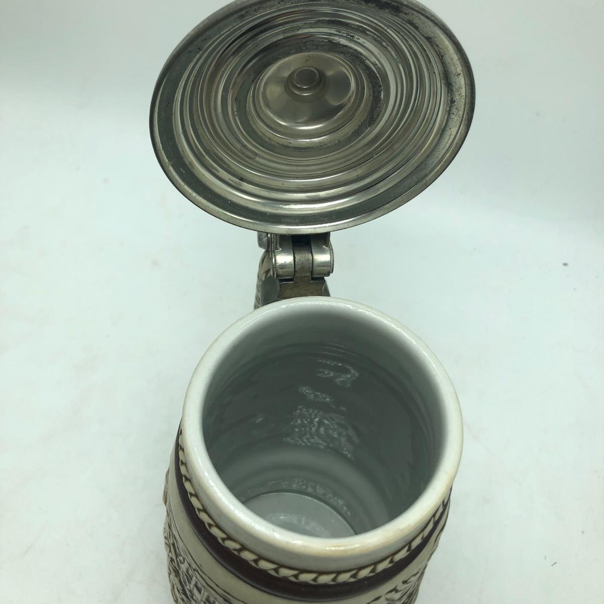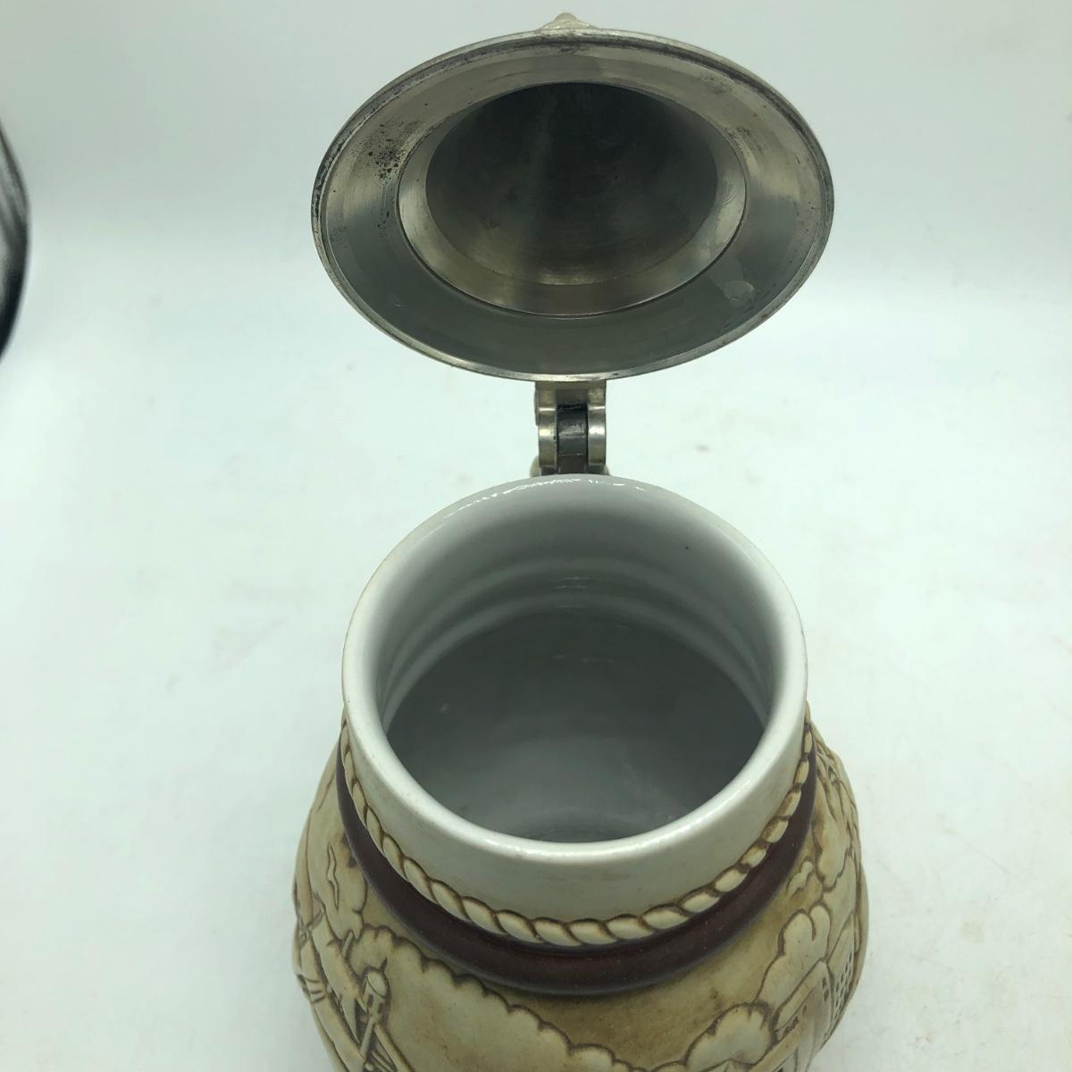 Lot includes Avon English Setter stein with small crack at bottom, Roping and Barkentine steins. Steins are from 1977, 1978 and 1980. Largest stein measures 4” x 5” x 9”.
