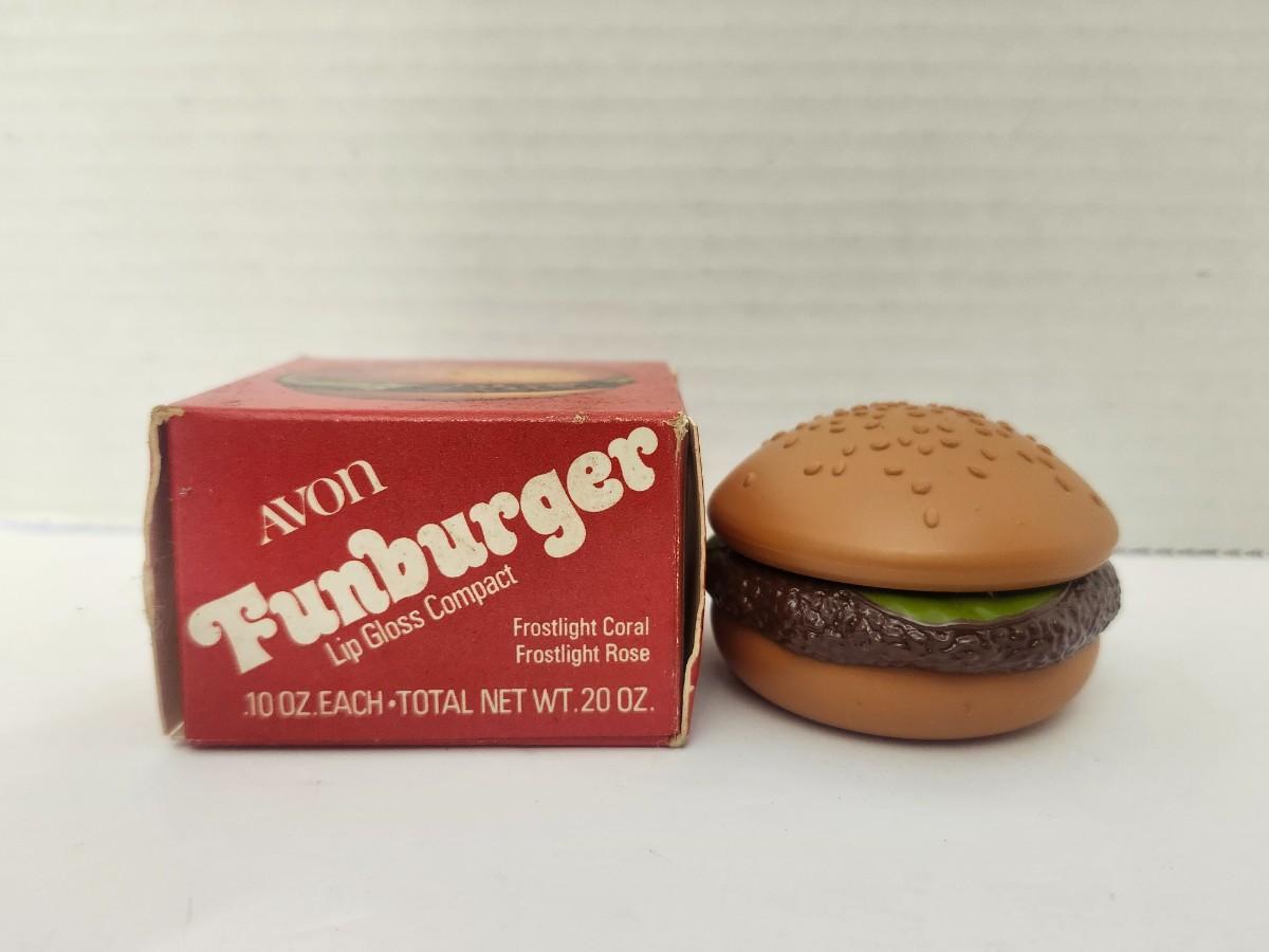 Avon Funburger, Avon hamburger compact, vintage Avon makeup, novelty lip gloss compact, retro cosmetics, Avon collectibles, kitsch makeup, burger compact