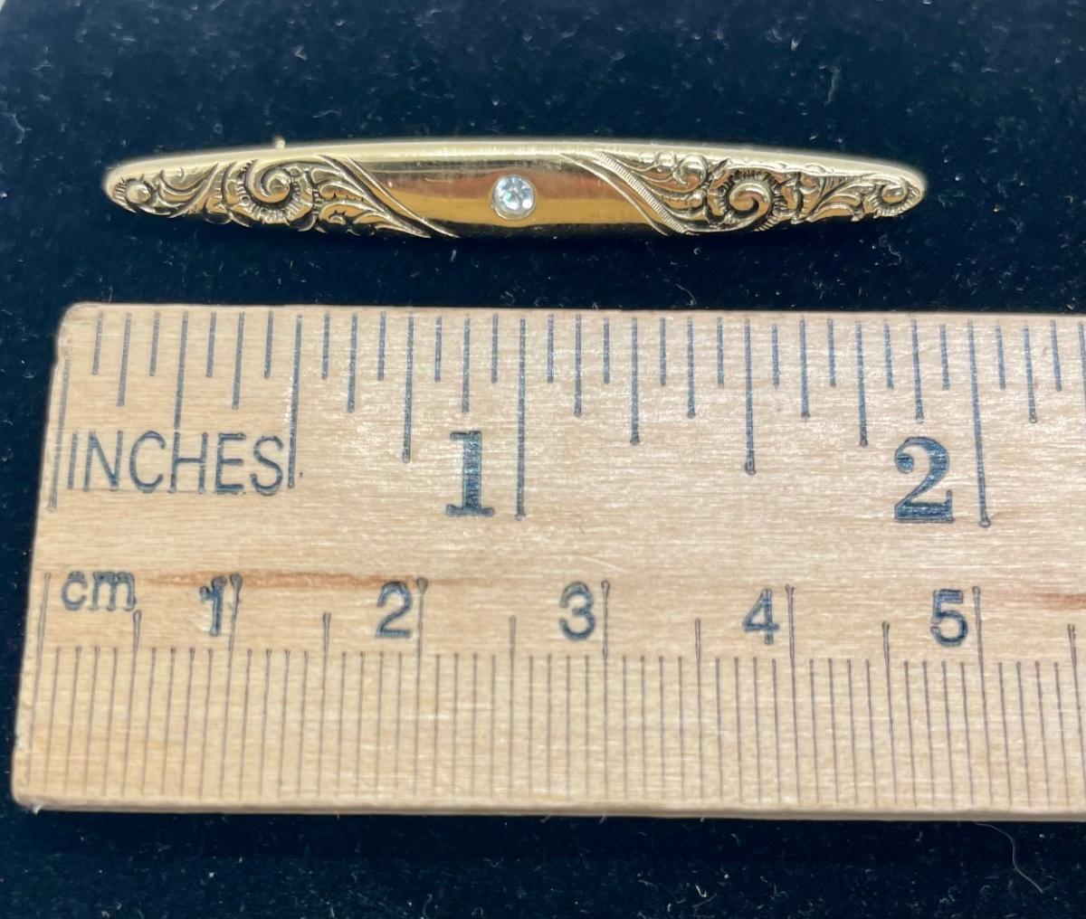Just under 2" long. Nice scroll pattern on top, along with a single faux diamond.