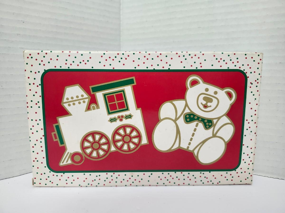 Vintage Avon Holiday Cookie Kit with original box featuring festive train and teddy bear graphics. Box text states kit includes two cookie cutters, five poly lined bags, sugar cookie recipe, special icing recipe, and decorating tips. Marked Avon Products Inc New York NY with 1983 copyright. Complete contents are not verified beyond what is shown on the packaging. Classic Avon holiday kitchen collectible and seasonal baking gift set, and it is never too early to shop for Christmas at these prices.