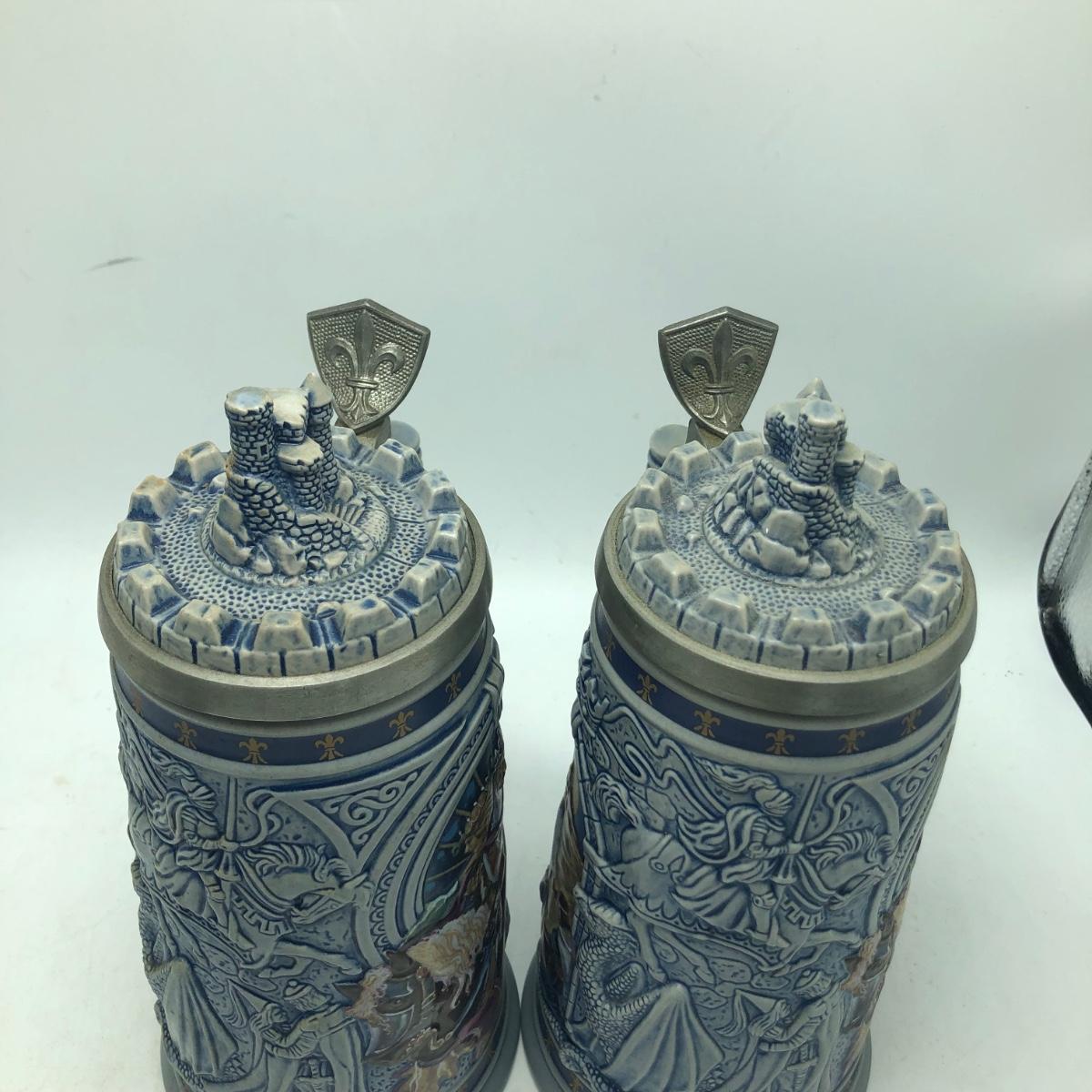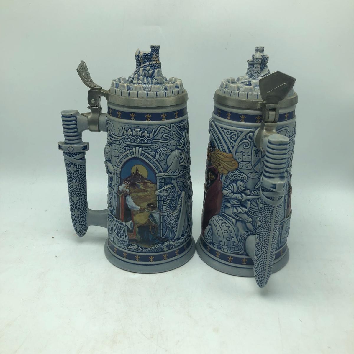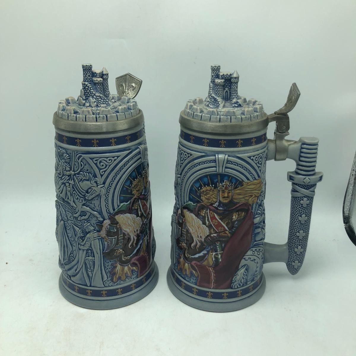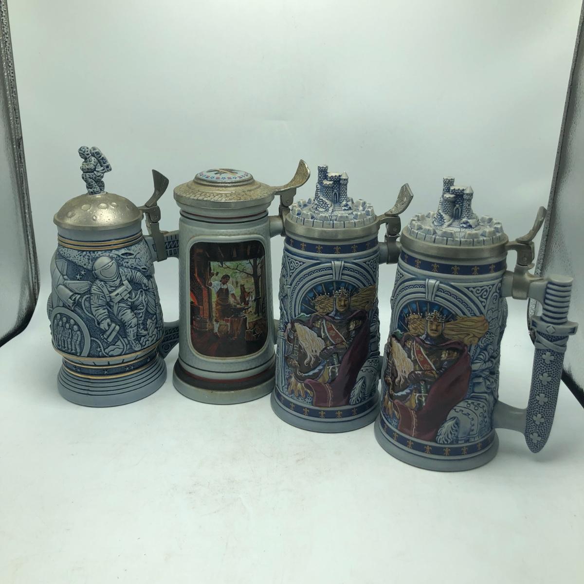 Lot includes two Knights of the Realm steins, Conquest of Space and The Blacksmith steins. Largest stein measures 4.25” x 6” x 9.5”.