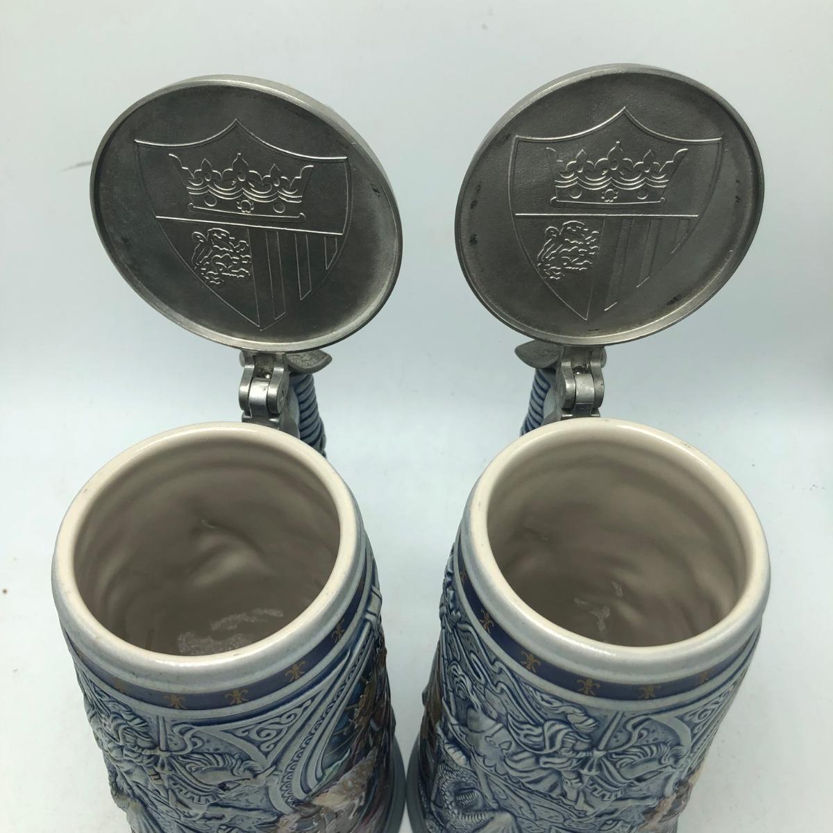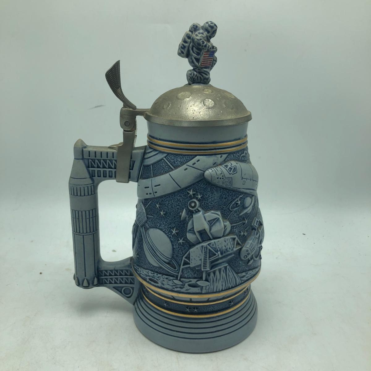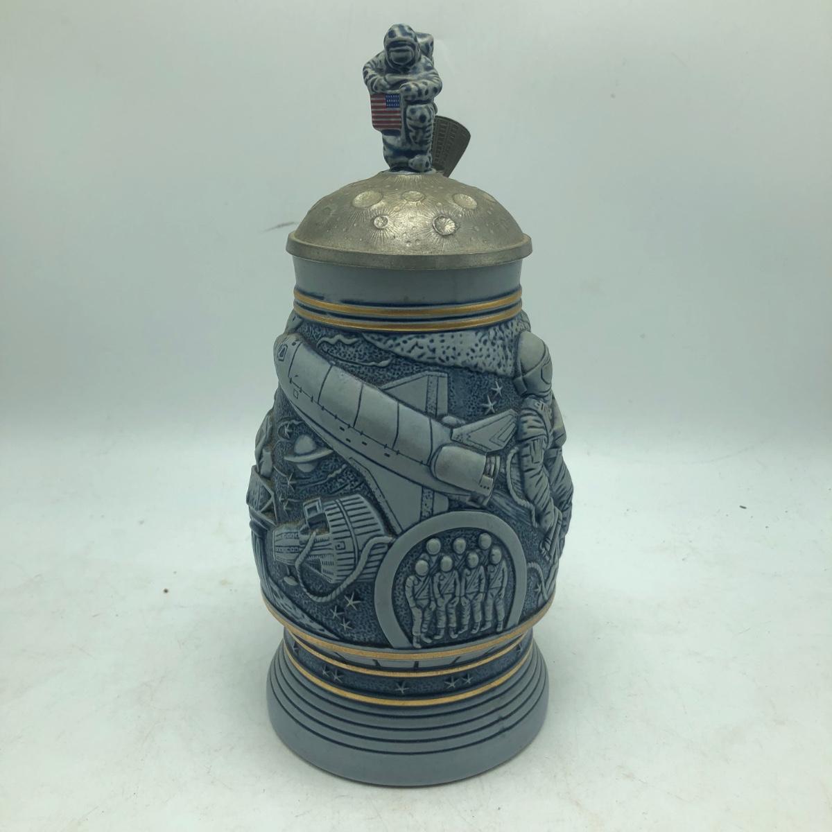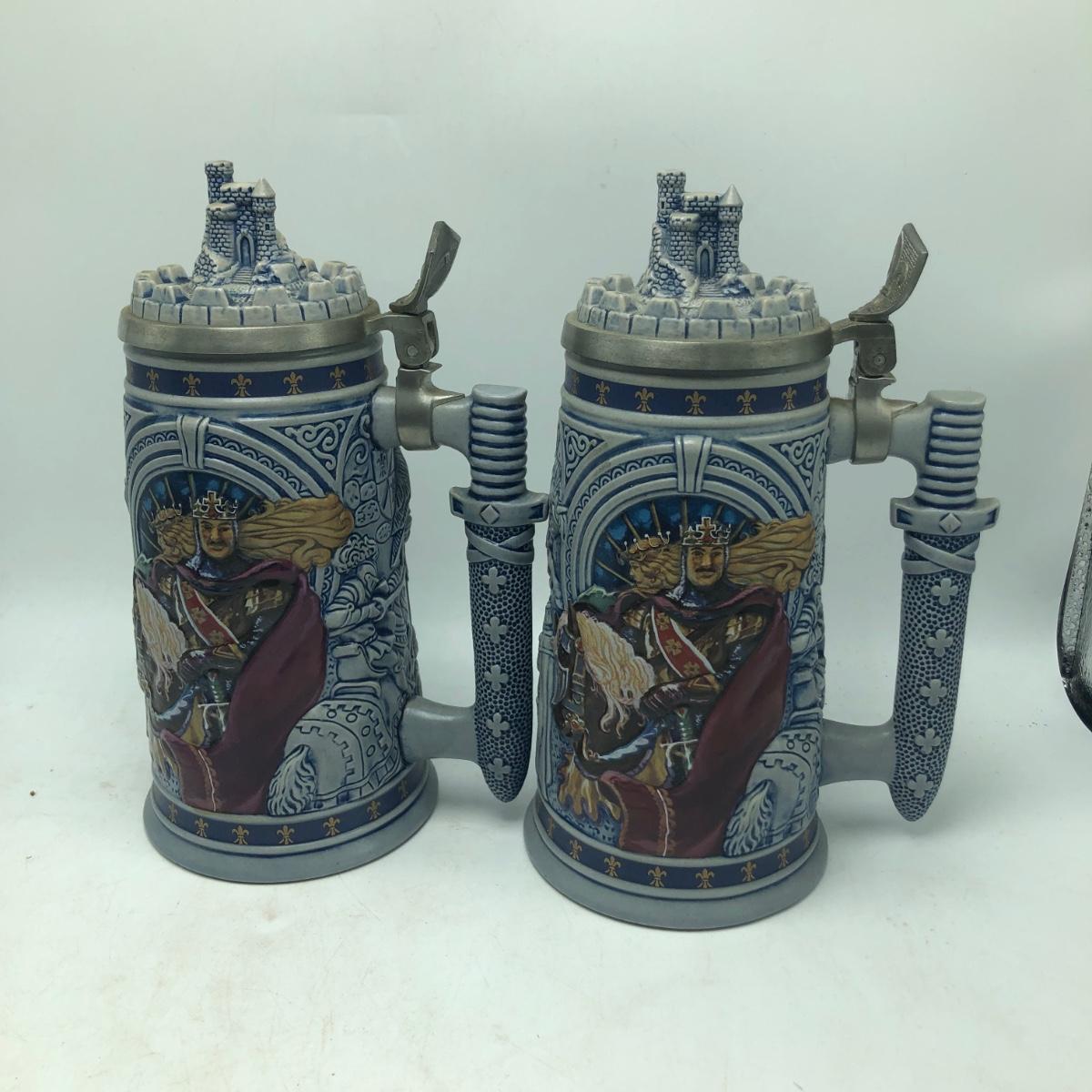 Lot includes two Knights of the Realm steins, Conquest of Space and The Blacksmith steins. Largest stein measures 4.25” x 6” x 9.5”.
