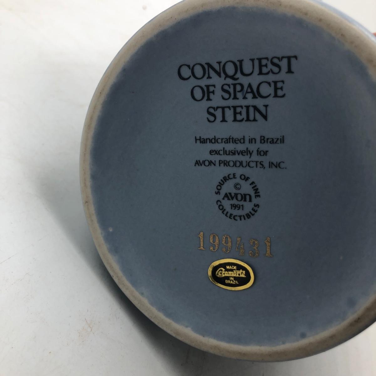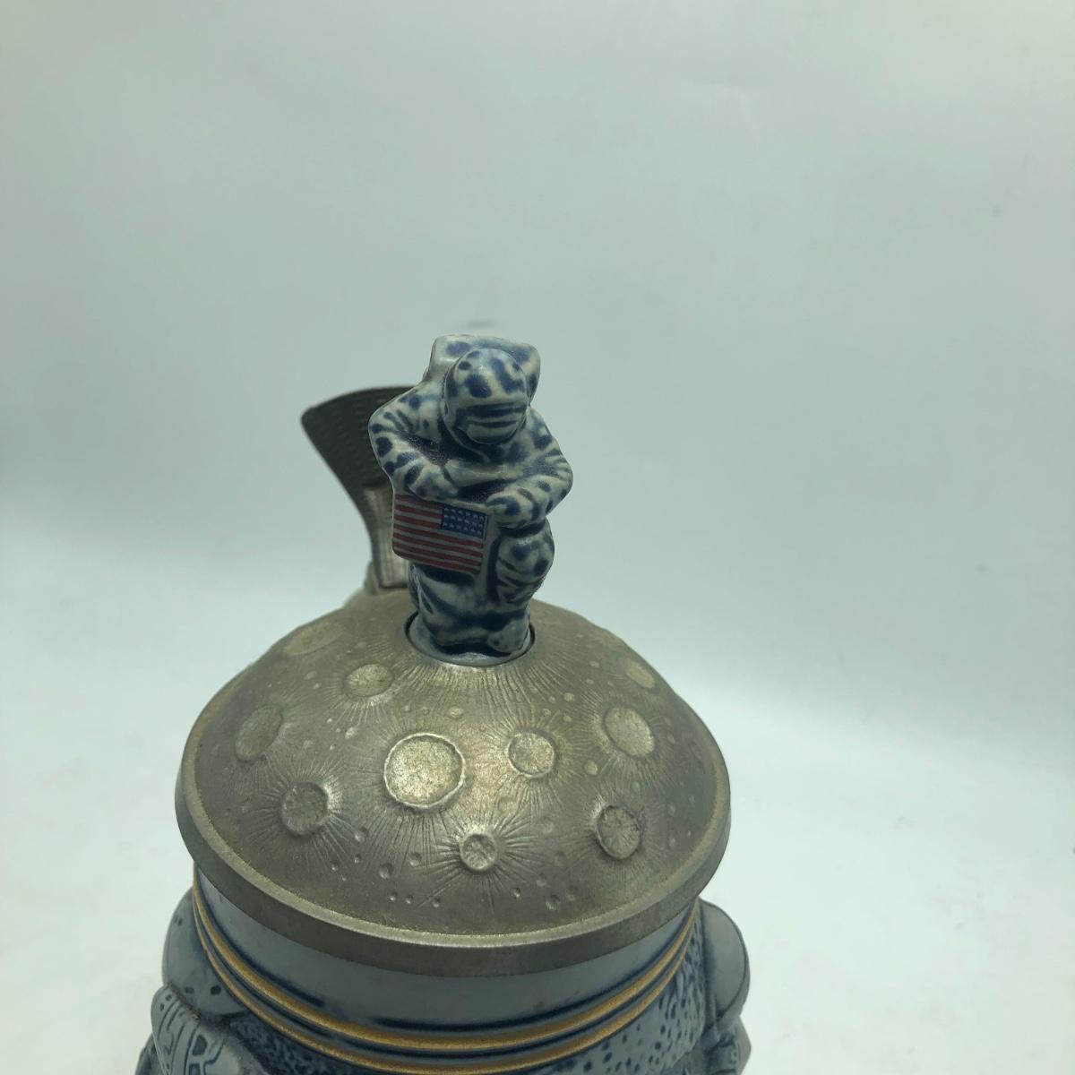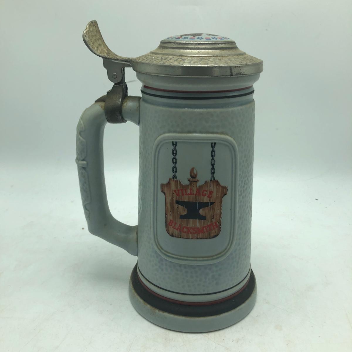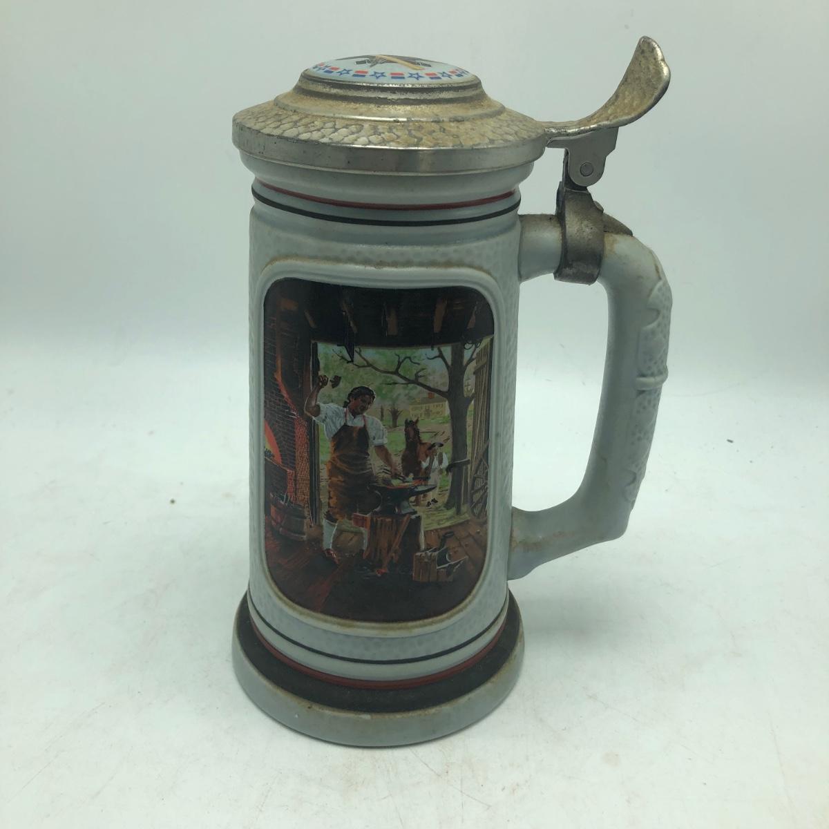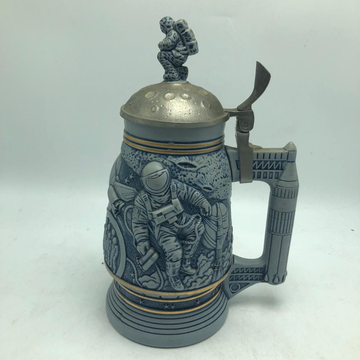 Lot includes two Knights of the Realm steins, Conquest of Space and The Blacksmith steins. Largest stein measures 4.25” x 6” x 9.5”.