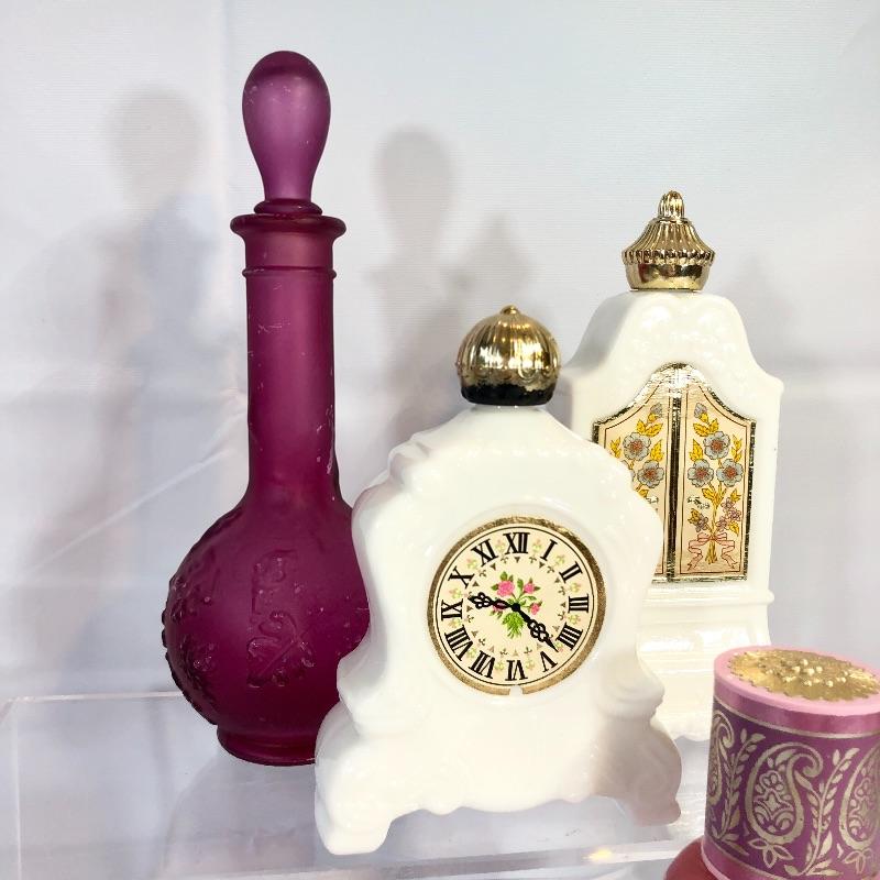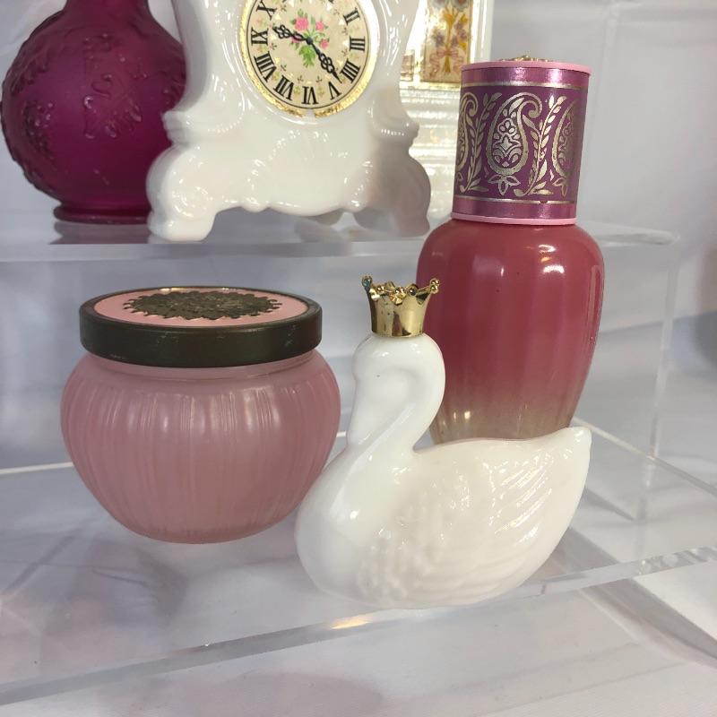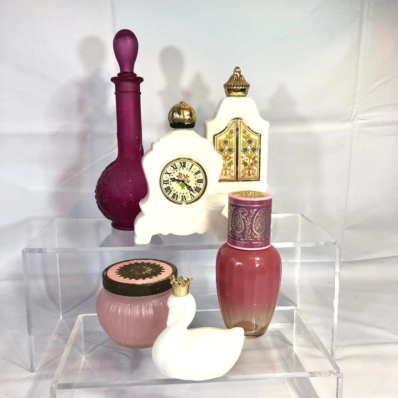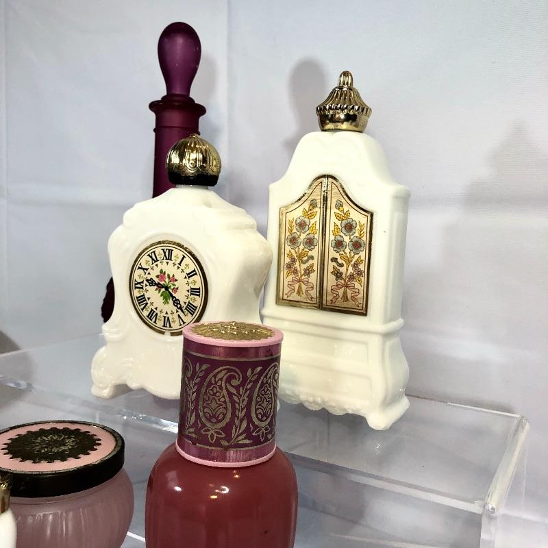 "Elusive" milk glass wardrobe & mantle clock decanters, and gold crowned swan bottle