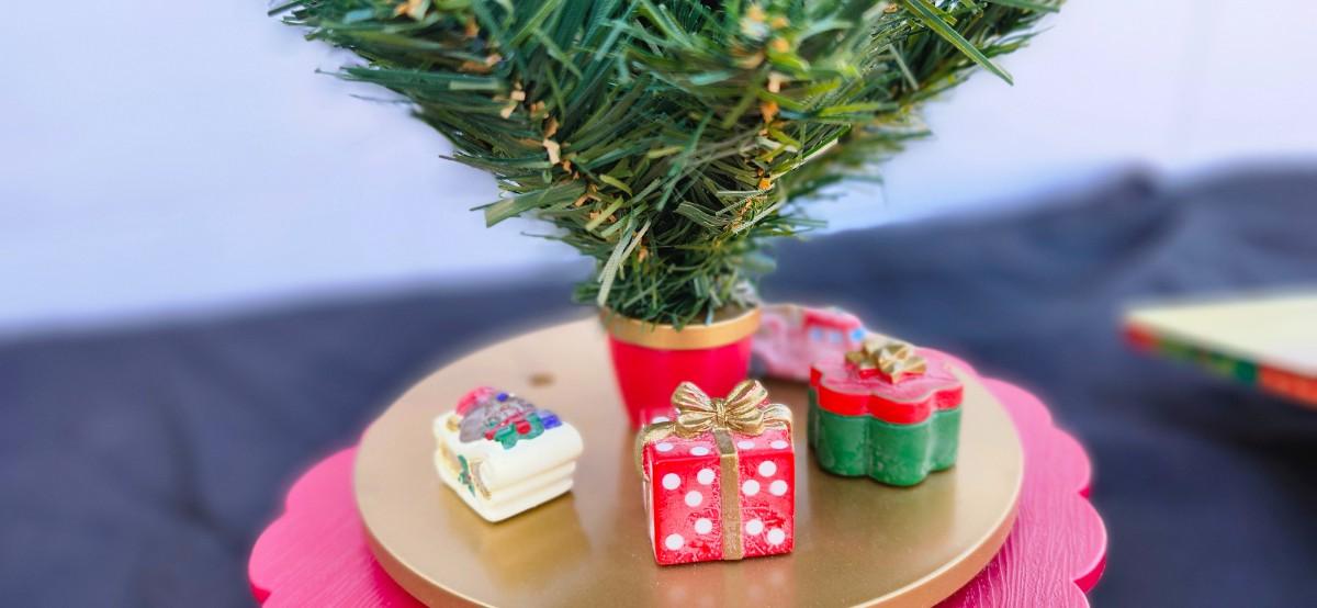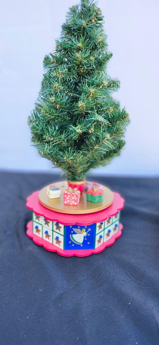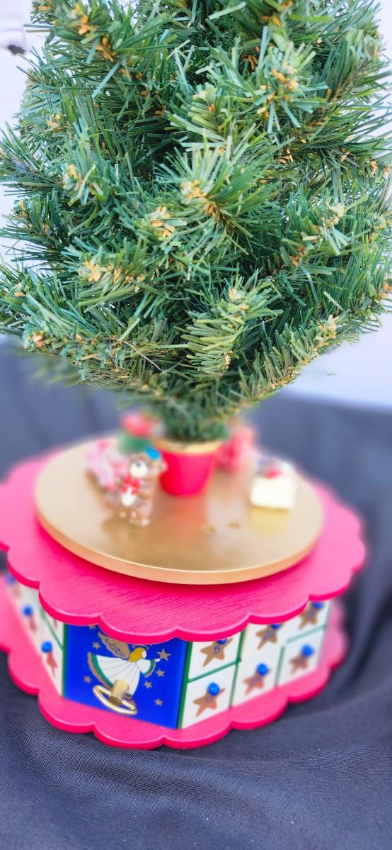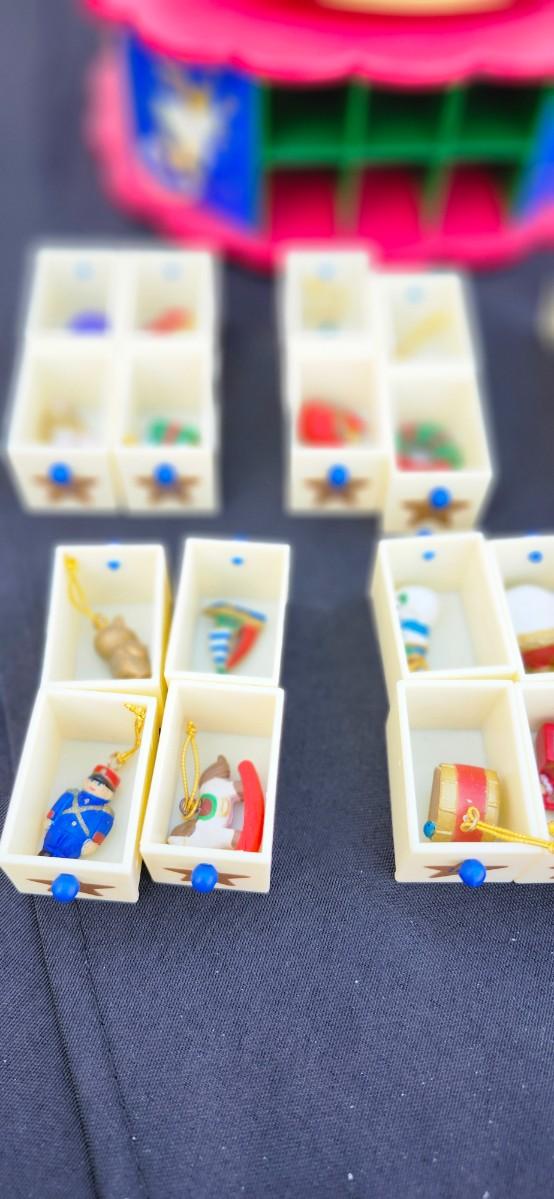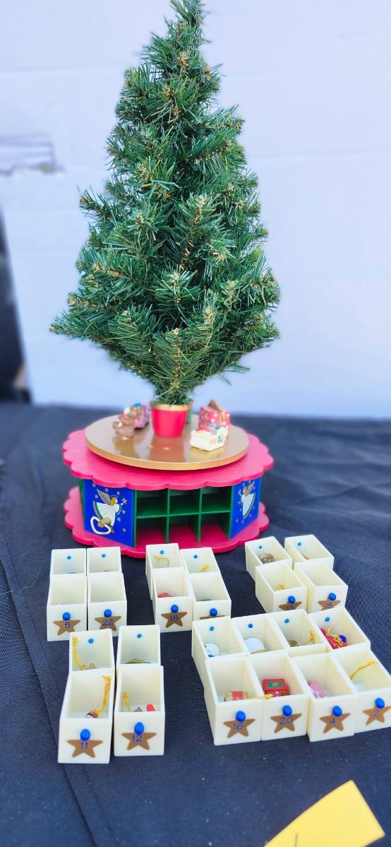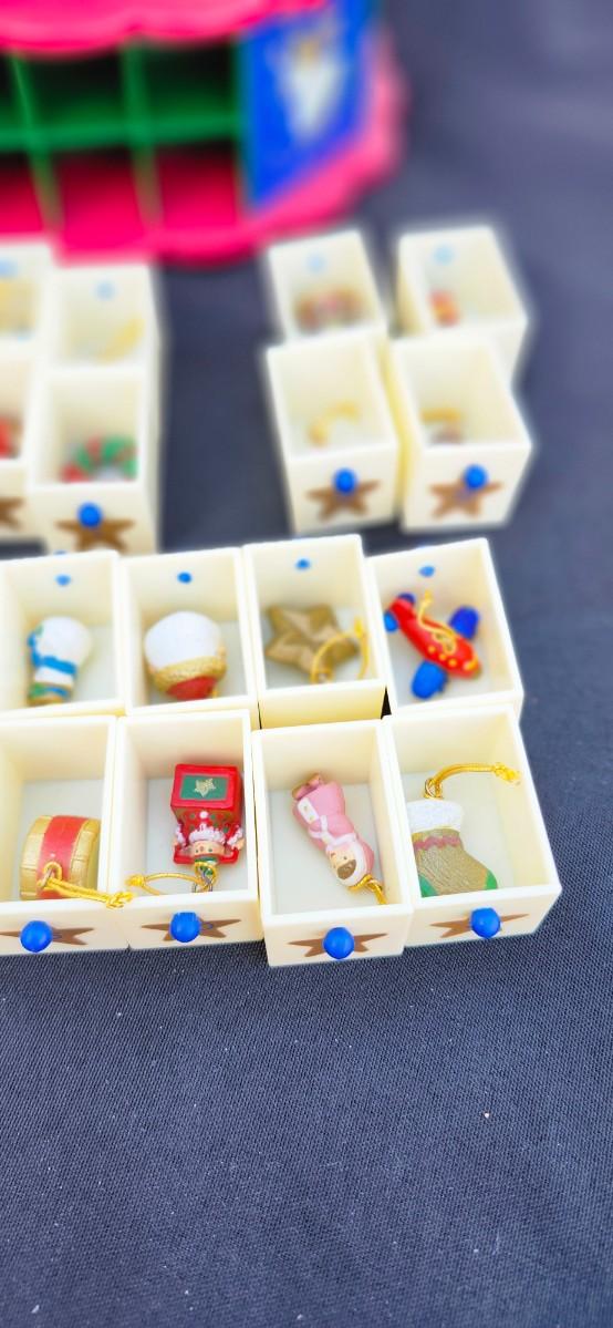 This adorable table top tree comes with 24 ornaments in each of the 24 drawers located in the base of the tree.