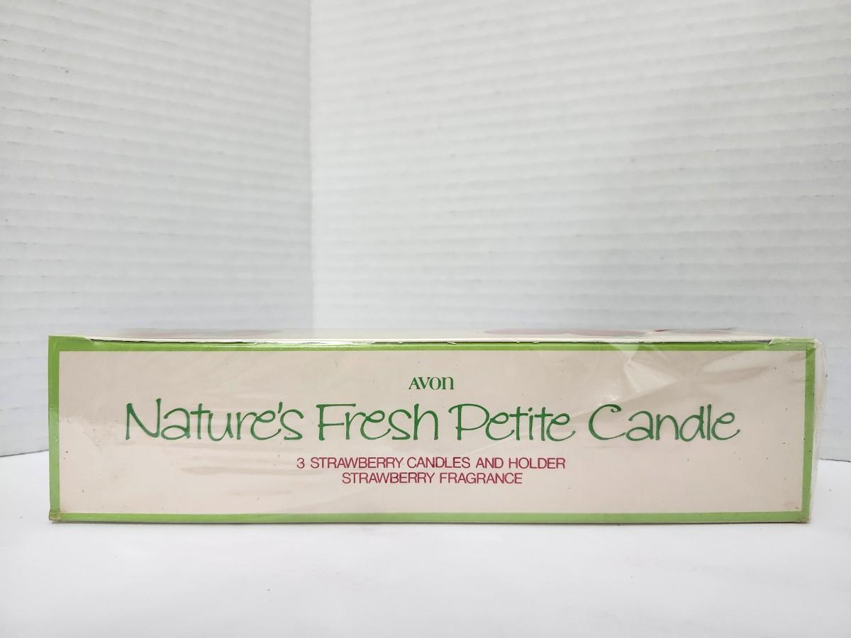 Avon Nature’s Fresh Petite Candle set featuring three strawberry candles with holder, strawberry fragrance as stated on the box. Original Avon packaging included. Decorative candle set identified strictly from visible labeling and packaging only.