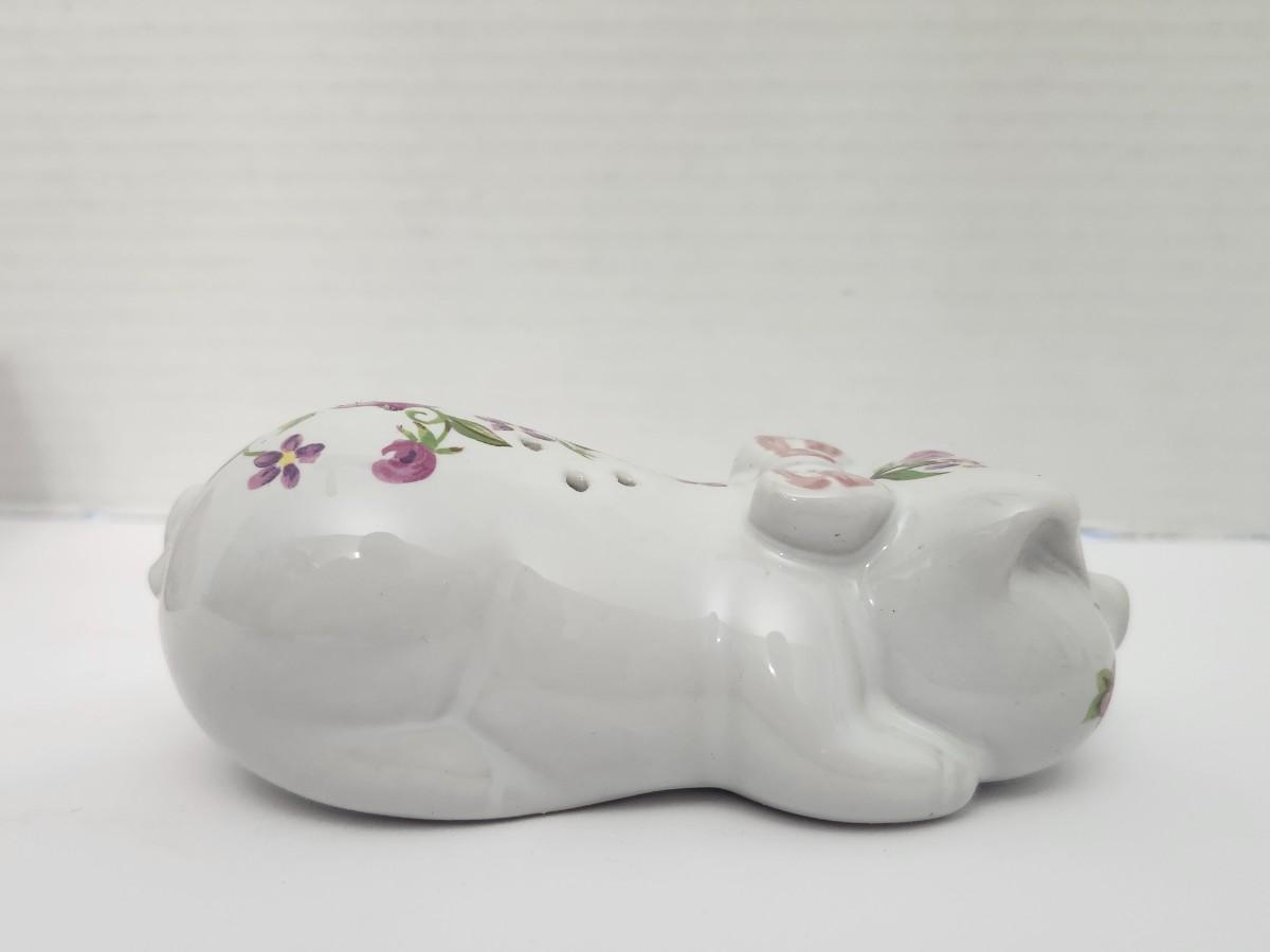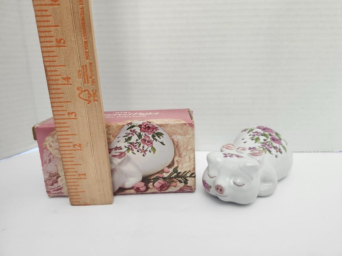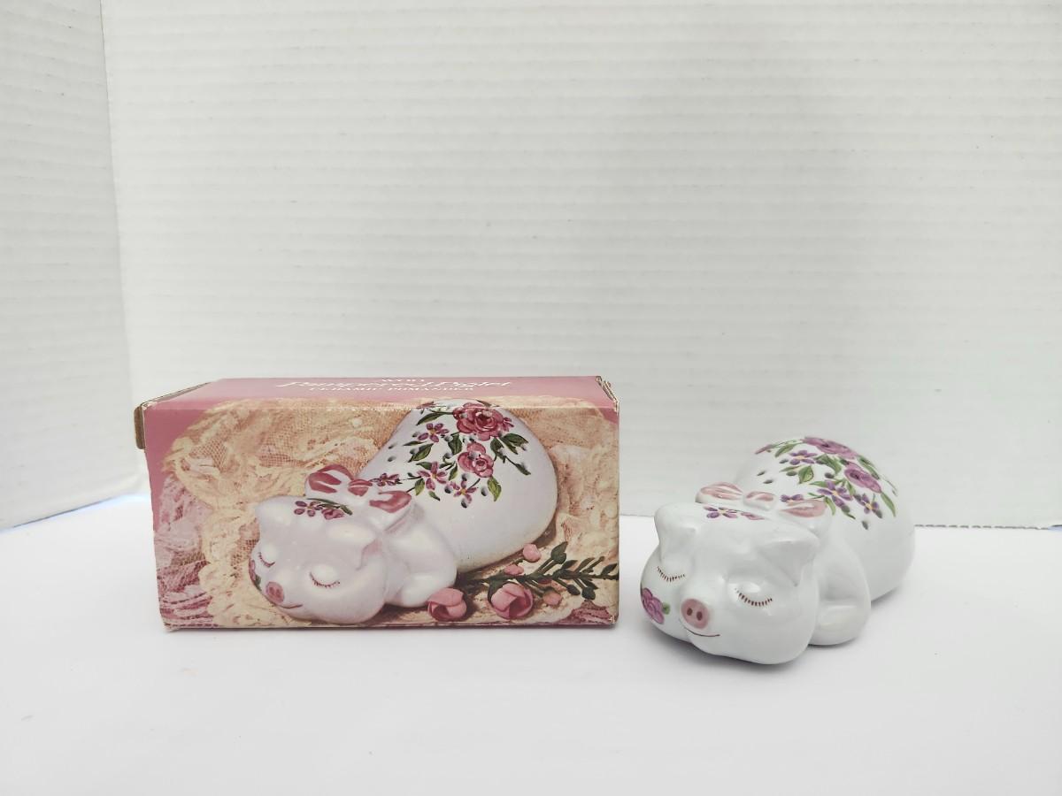 Avon Pampered Piglet ceramic pomander featuring a sleeping piglet with floral rose decoration. Includes original Avon box labeled Pampered Piglet Ceramic Pomander. Decorative ceramic fragrance holder identified strictly from visible text and photos only.