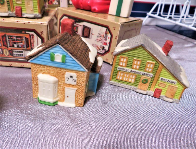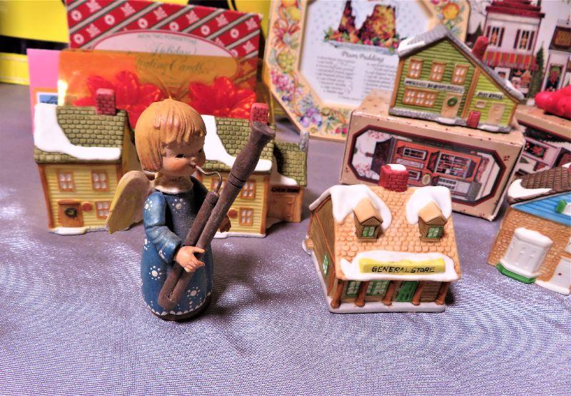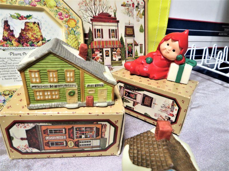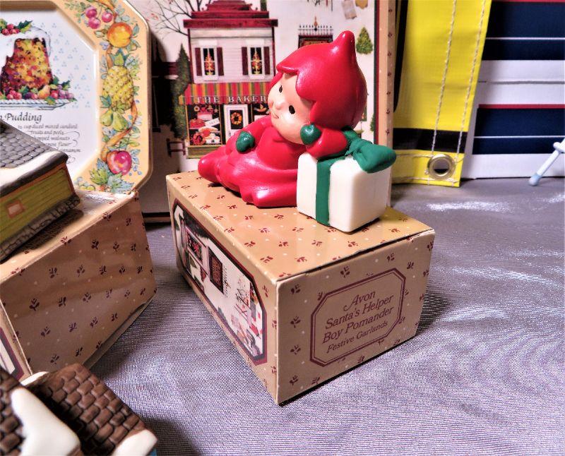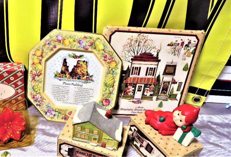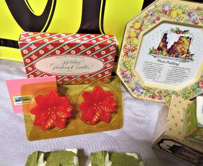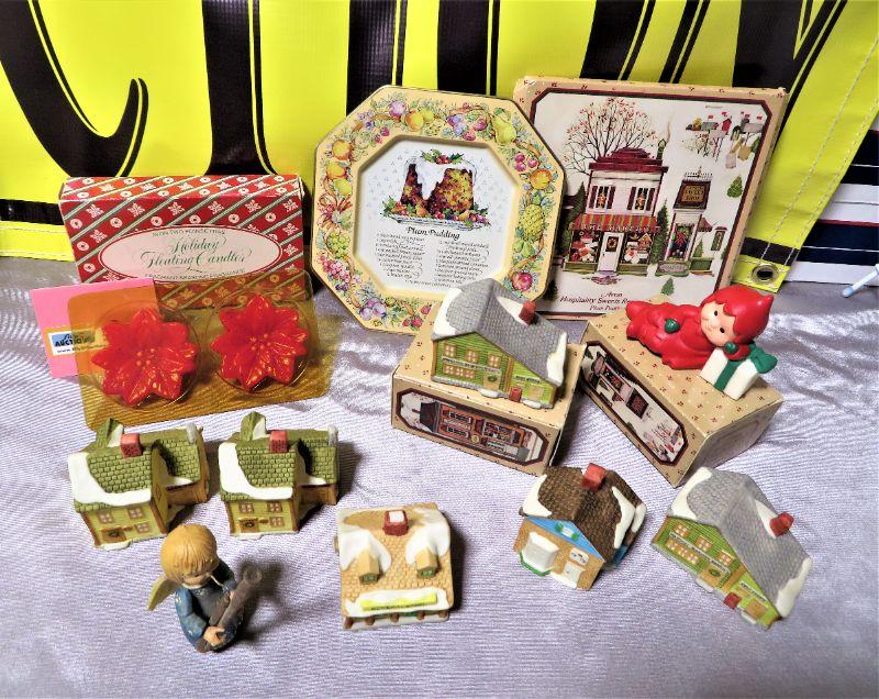 VINTAGE AVON PLUM PUDDING Plate, VINTAGE Floating Poinsettia Candles, Santa's Helper BOY Pomander, more miniature ceramic houses Christmas LOT.
