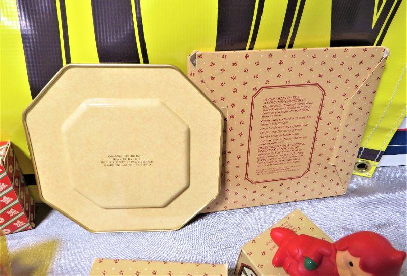 Vintage AVON PLUM PUDDING Plate, Floating Poinsettia Candle, BOY Pomander & Snow Town LOT
