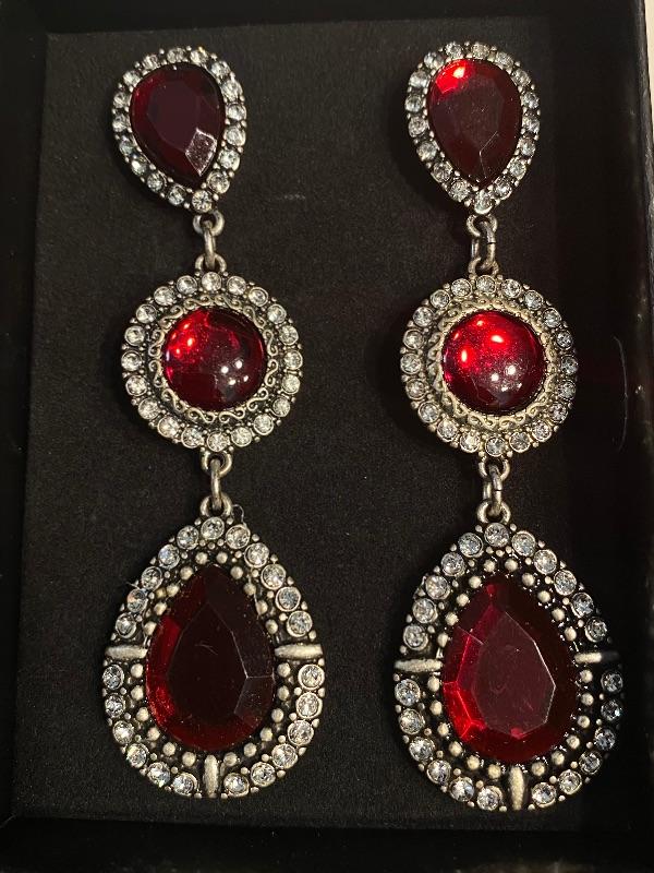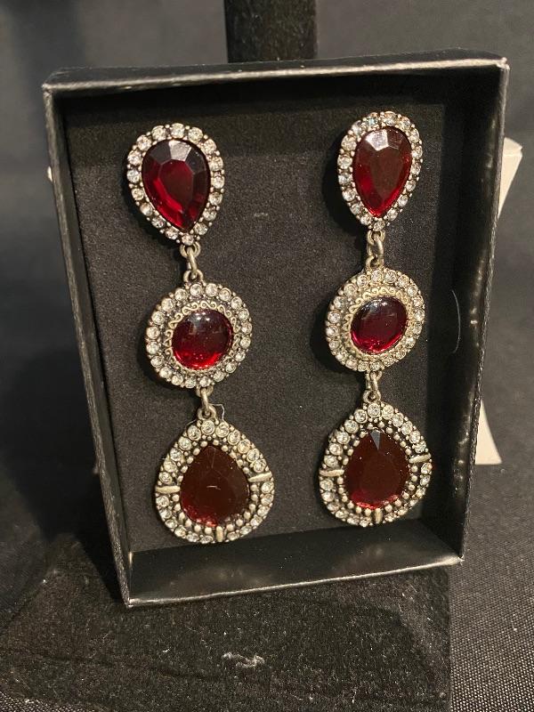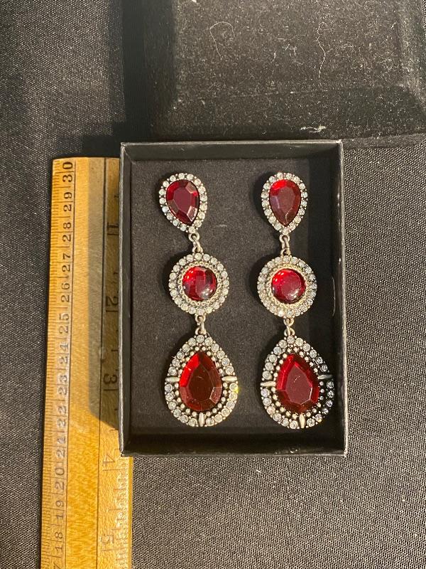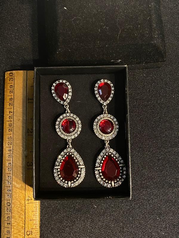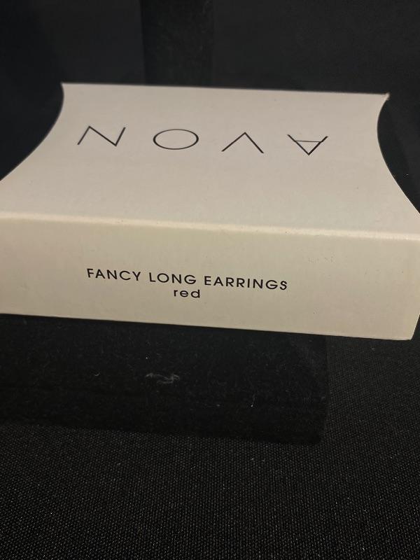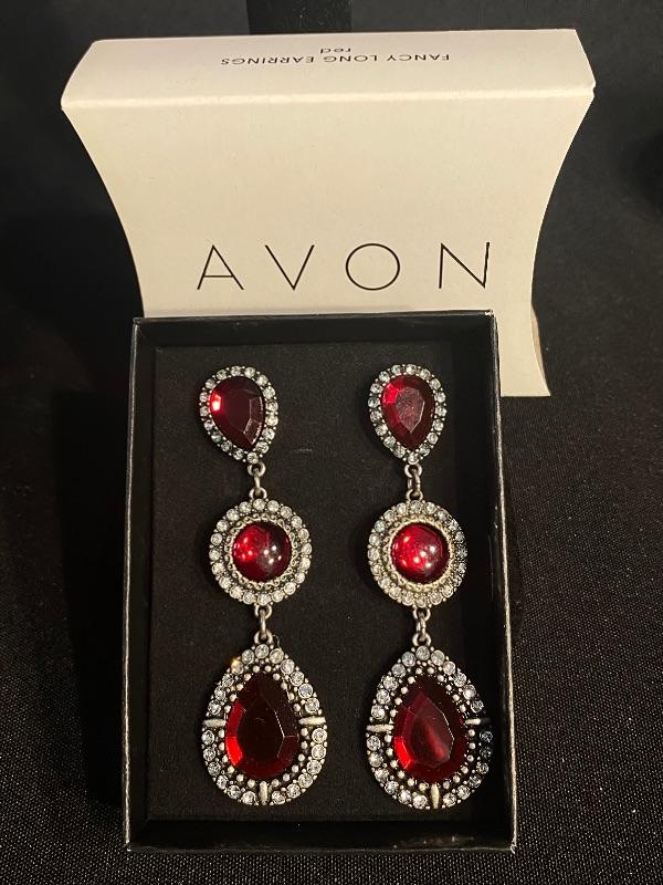 New in Box Avon Fancy Long Earrings. Silvertone setting, red rhinestones surrounded with clear rhinestones. Earrings are for pierced ears and about 3" long. Come in original Avon box.