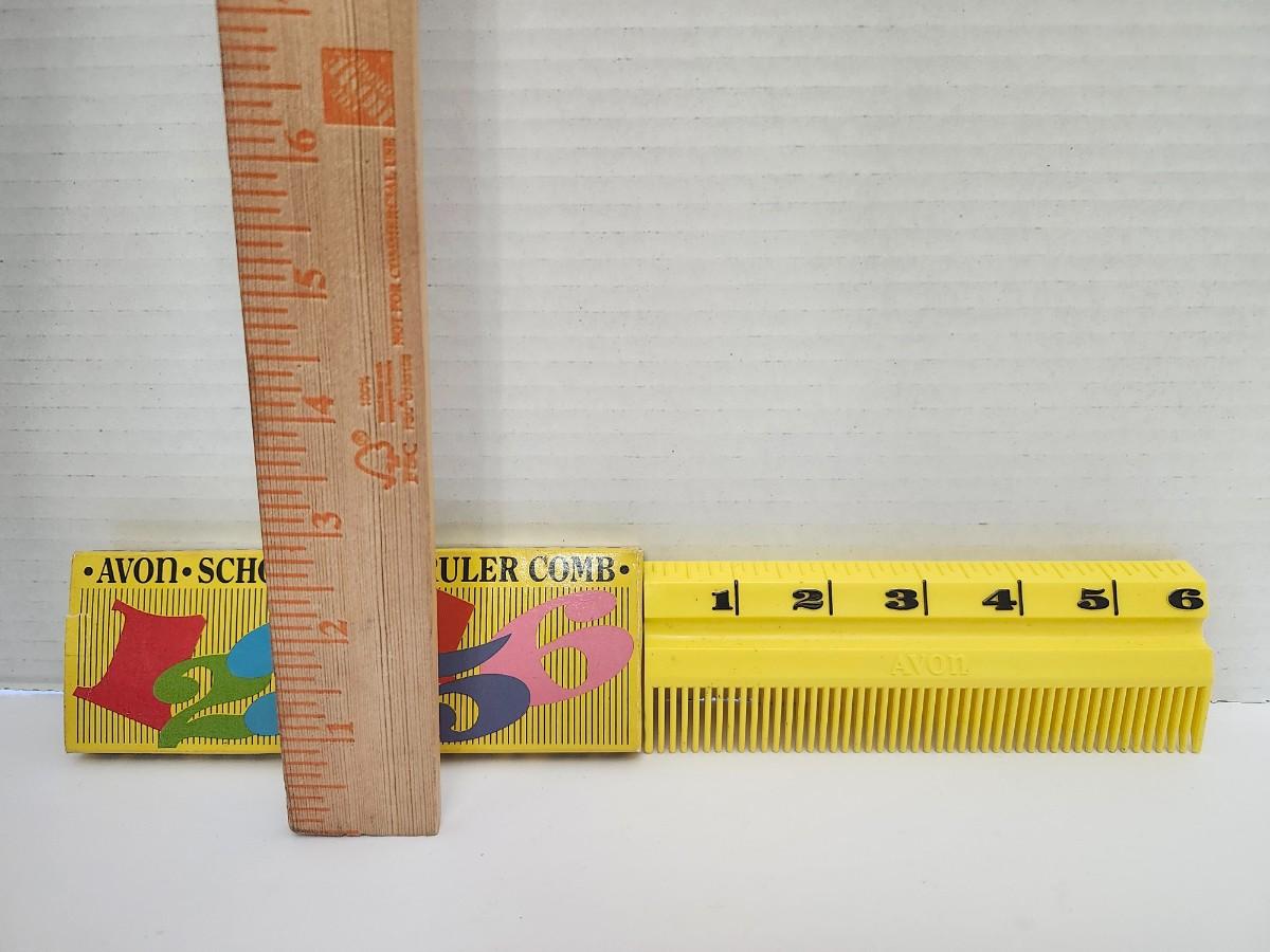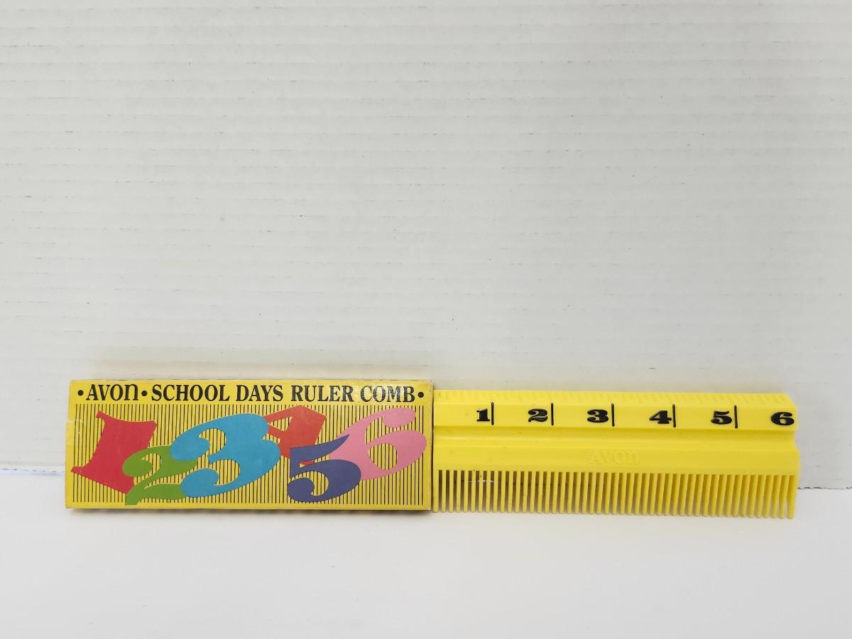 Vintage Avon School Days ruler comb in bright yellow plastic. Comb features inch ruler markings on the top edge and raised alphabet lettering on the reverse side, designed for hair grooming, measuring, and desk use. Original Avon box included, with School Days Ruler Comb branding and printed description text visible. Listing reflects only details shown in the images, with no assumptions beyond visible features.