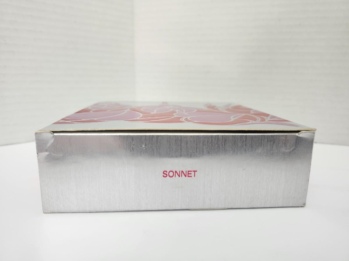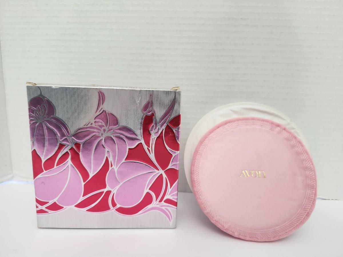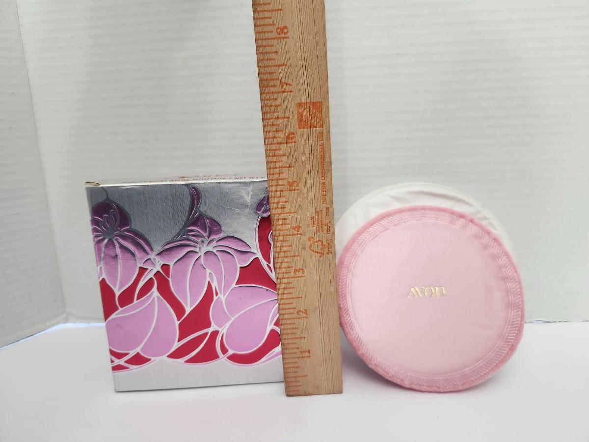 Avon Sonnet beauty dust refill with puff, net weight 6 oz, presented in the original decorative box. Includes round pink Avon powder container with embossed Avon logo on lid. Box features floral design and Sonnet branding. Listing reflects exactly what is shown, with no assumptions made about contents or use.