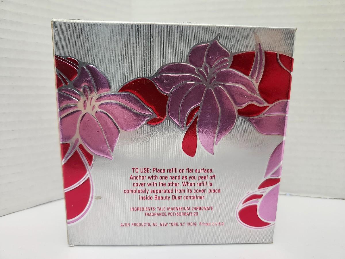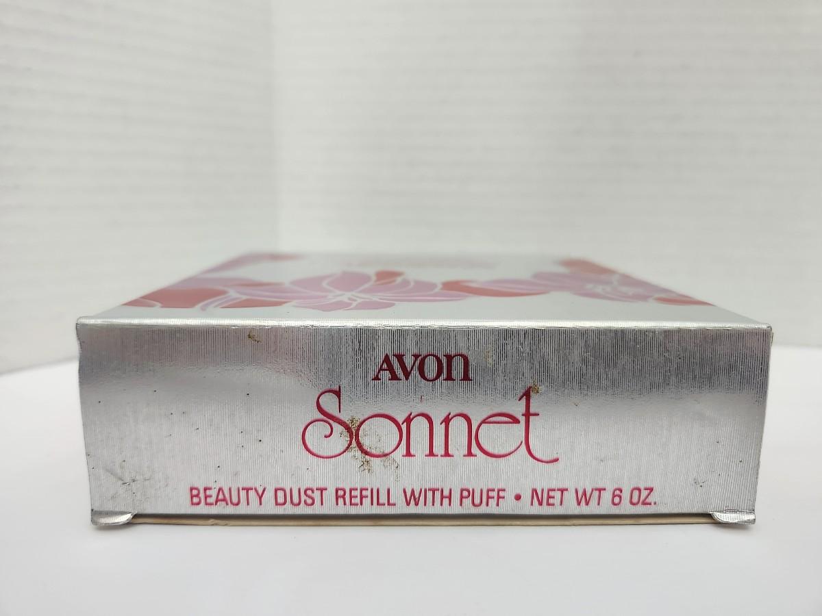 Avon Sonnet beauty dust refill with puff, net weight 6 oz, presented in the original decorative box. Includes round pink Avon powder container with embossed Avon logo on lid. Box features floral design and Sonnet branding. Listing reflects exactly what is shown, with no assumptions made about contents or use.