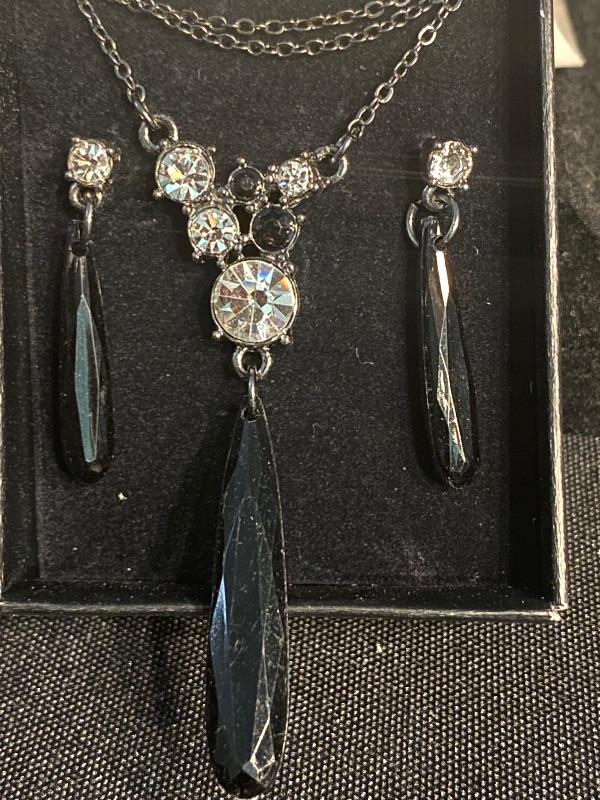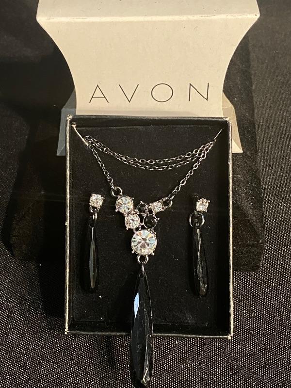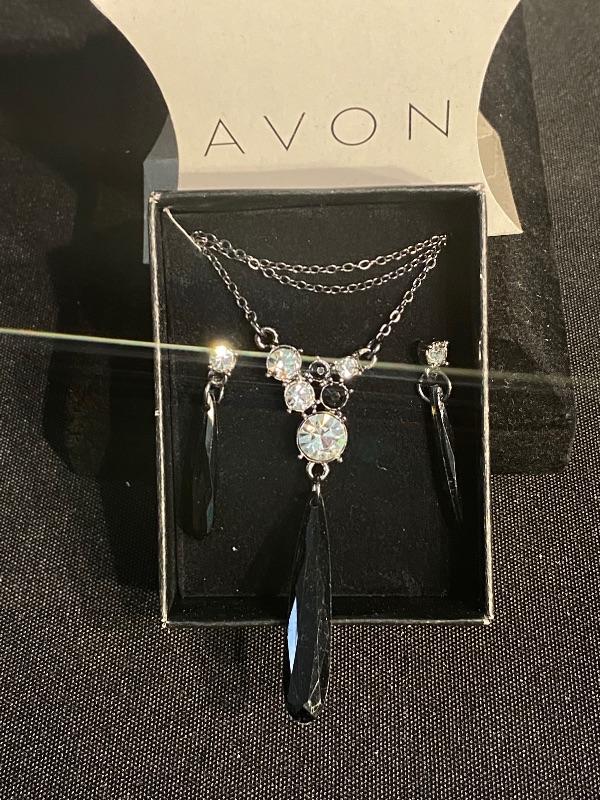 AVON Teardrop Bead Y Necklace Gift Set. Necklace with matching earrings in original box, never used. Faceted black beads with clear rhinestones.