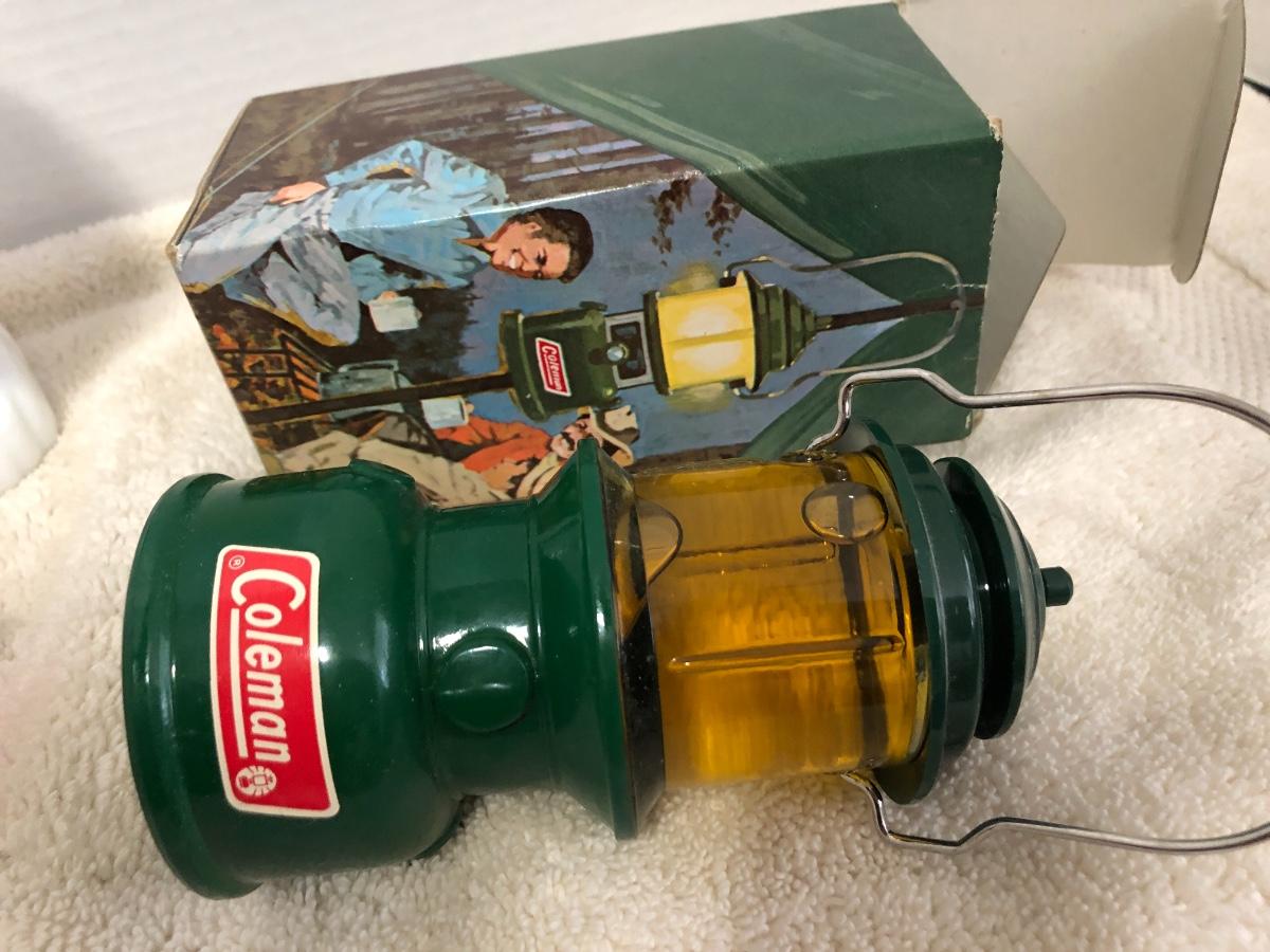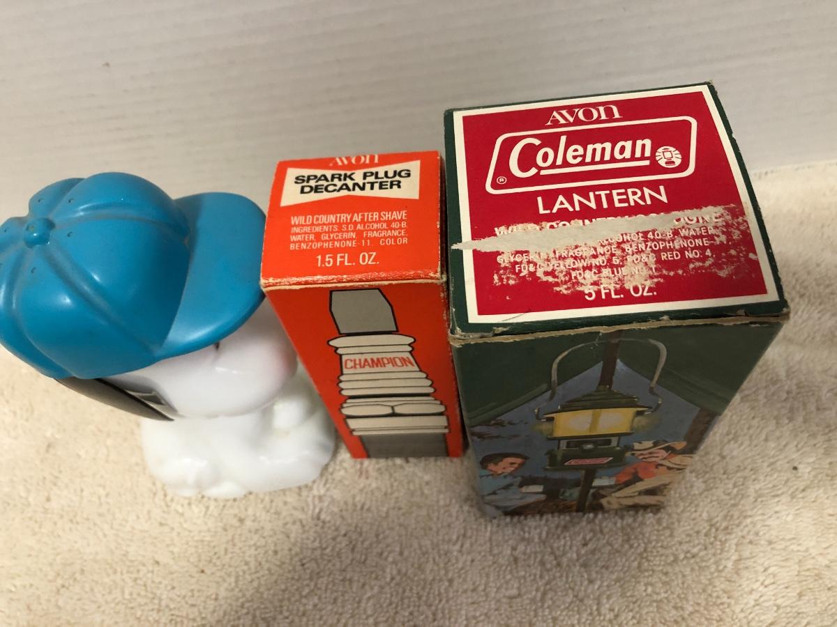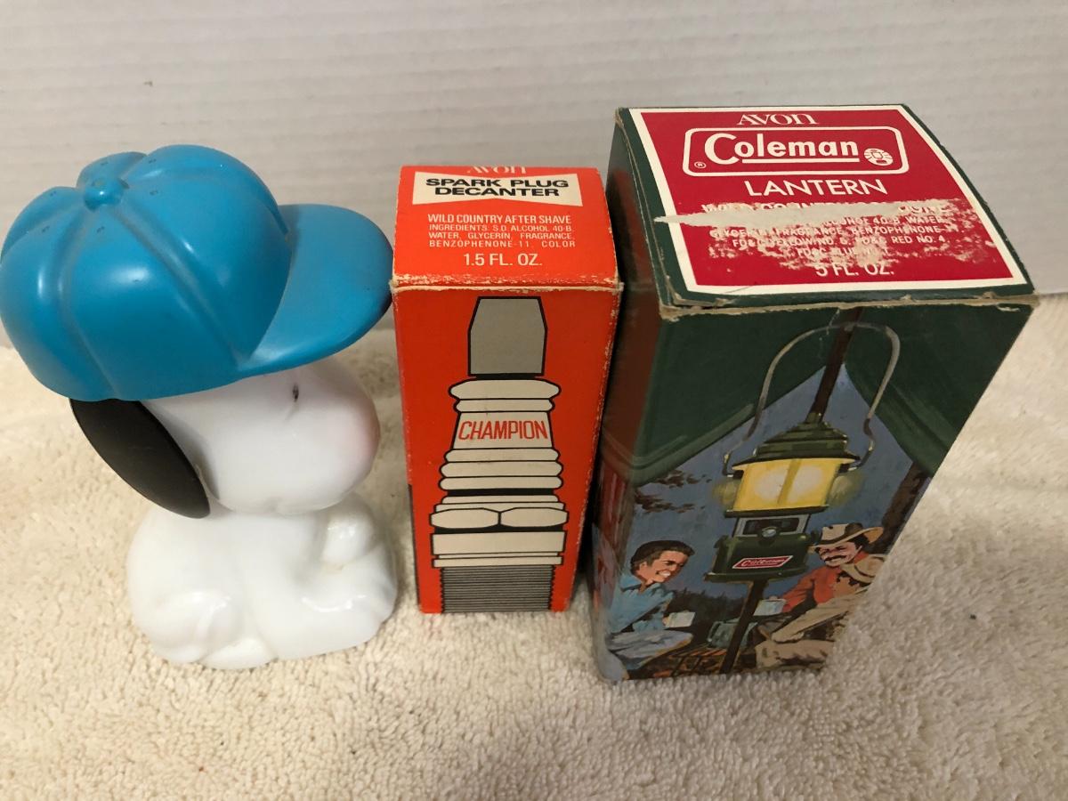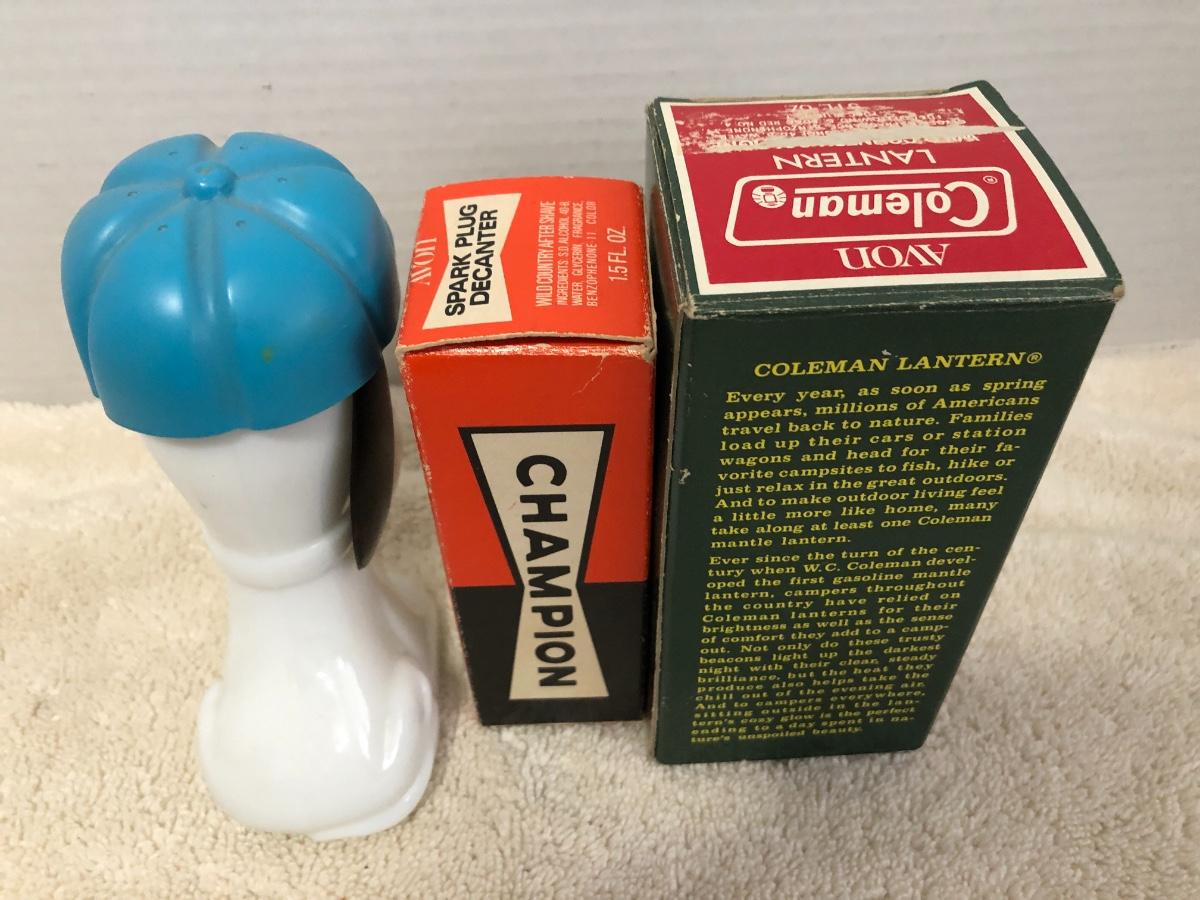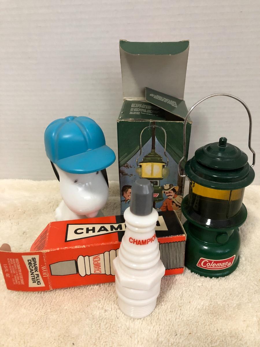 All items are sold as is, as found in the estate. Please see all photos for content, measurements and condition. The Spark Plug and Coleman Lantern are both full. The Snoopy decanter is empty.