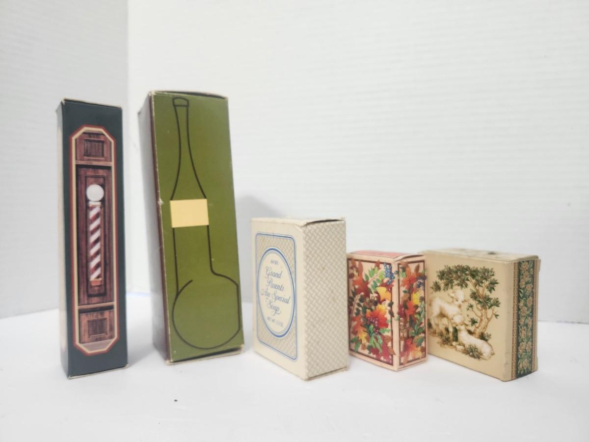 This vintage Avon lot of five showcases classic Avon grooming and gift items from their mid century era, all presented in their original boxes. Included is the Avon Pipe Full Tai Winds after shave, an Avon Gentlemen’s Regiment shaving brush, the sentimental Grand Parents Are Special soap, Autumn Sentry miniature cologne Charisma, and an Avon Topaze cologne. The varied box art and nostalgic branding reflect Avon’s long history of turning everyday toiletries into collectible keepsakes, making this an appealing group for Avon collectors or vintage packaging enthusiasts.