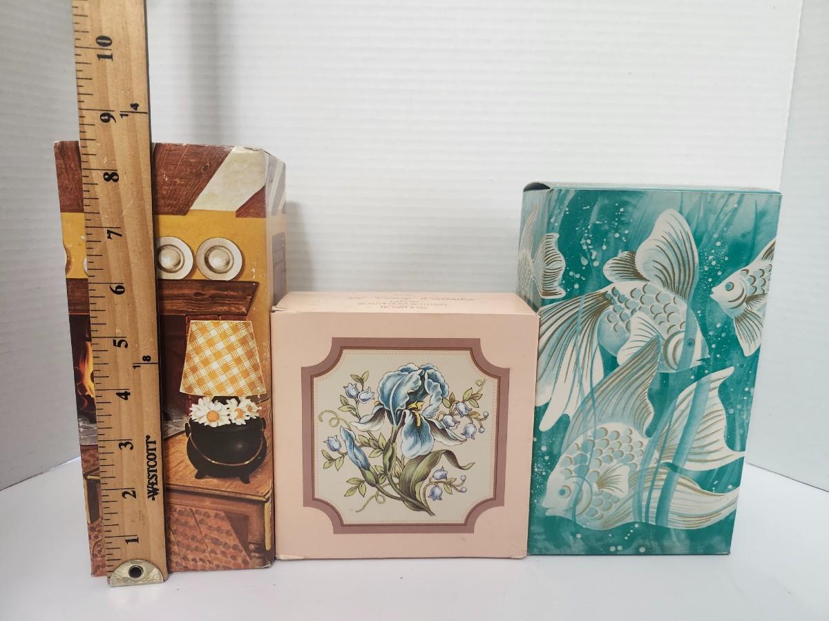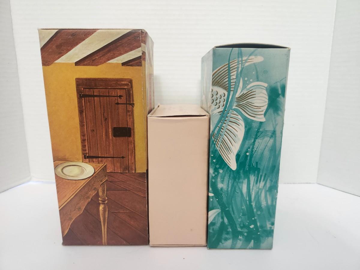 This vintage Avon lot of three captures the golden era of Avon’s beautifully boxed fragrance gifts and decorative vanity pieces. Included are Sea Spirit Topaze Foaming Bath Oil in its ocean themed box, The Vanity Collection Candid Beauty Dust with puff in classic pastel packaging, and the Avon Hearth Lamp Roses Roses Cologne housed in its cozy cottage style box. Each piece reflects Avon’s talent for pairing scent with charming artwork and display worthy containers, making this lot perfect for collectors, nostalgic décor lovers, or anyone drawn to vintage Avon presentation and design. A wonderful mix of fragrance history and retro visual appeal.