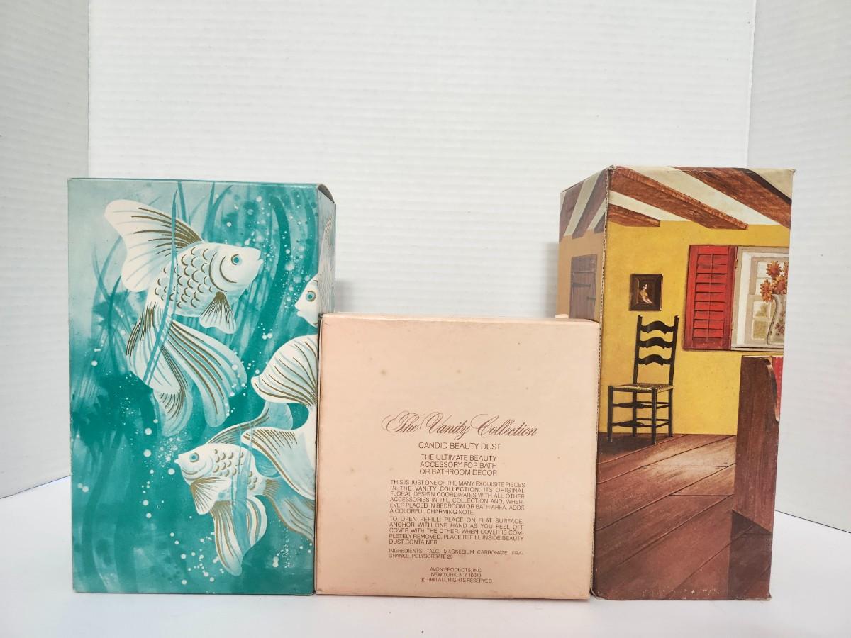 Avon vintage lot, Avon fragrance gift set, Sea Spirit Topaze, Avon Vanity Collection, Candid beauty dust, Avon Hearth Lamp, Roses Roses cologne, vintage Avon boxes