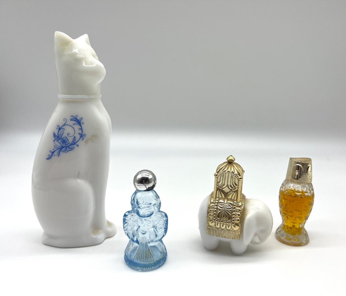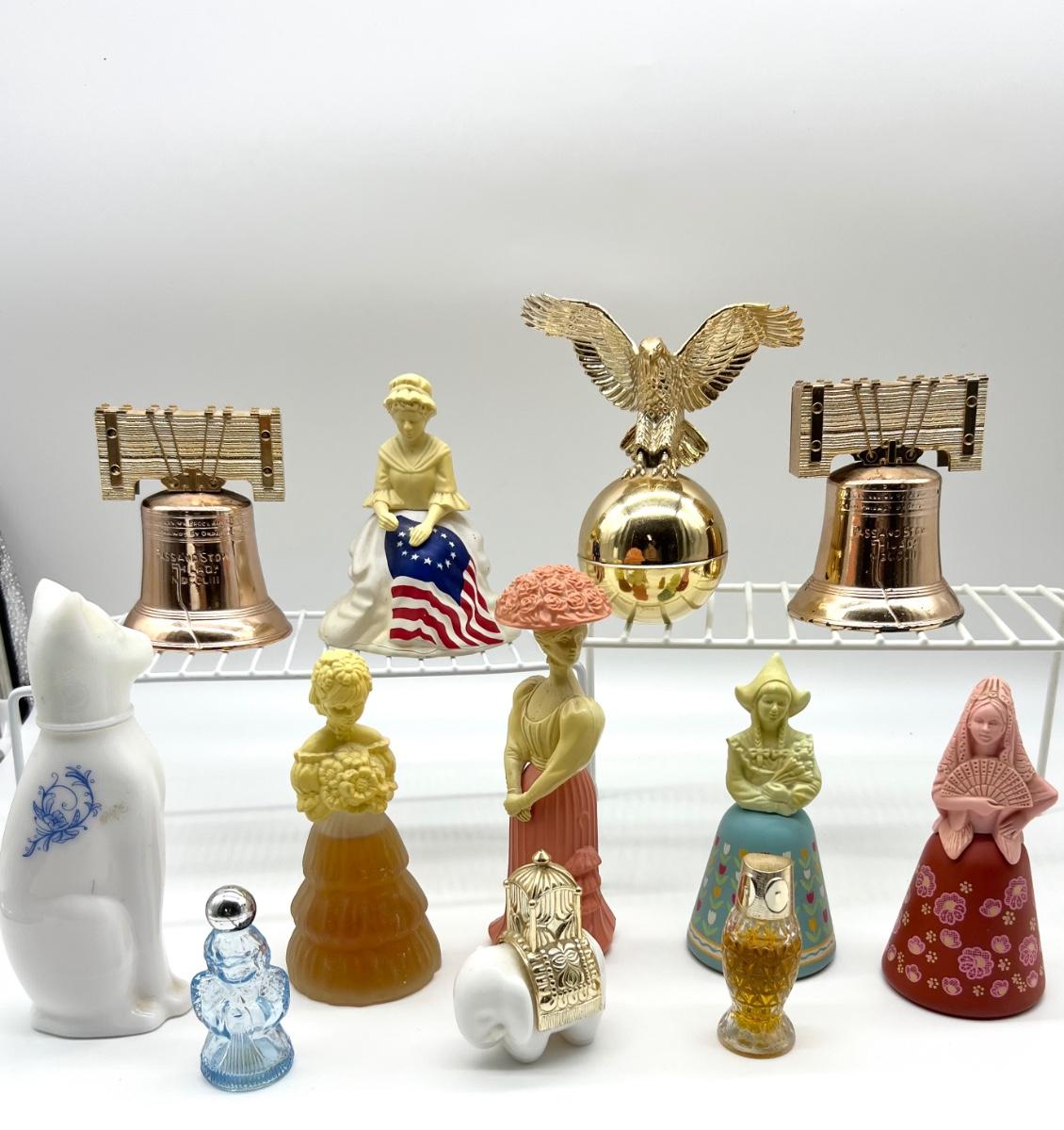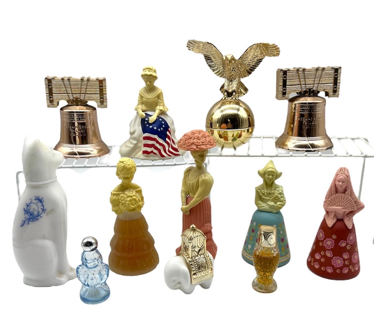 Lot of 12 AVON perfume bottles. Most have perfume still in them. Range of Largest Measuring 7 inches tall and smallest measuring 3 inches.