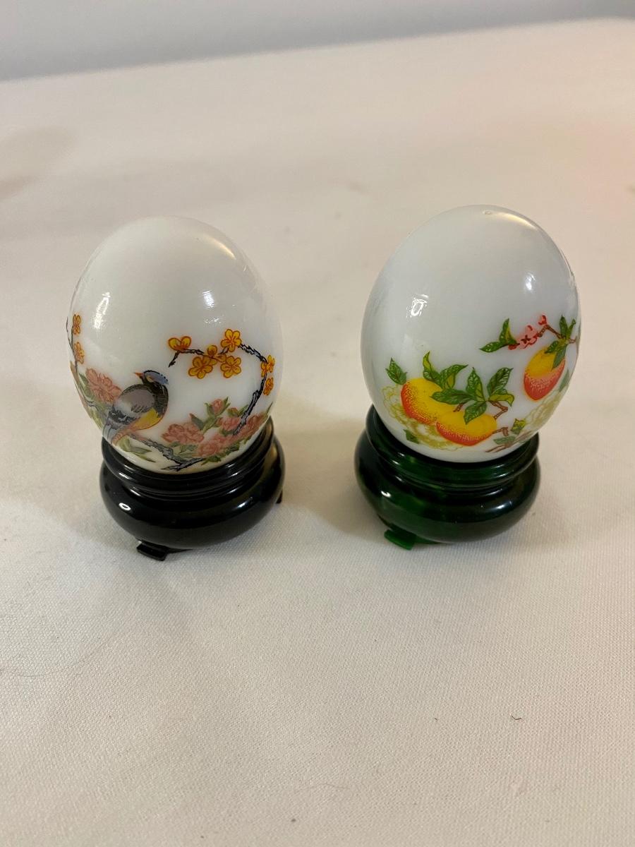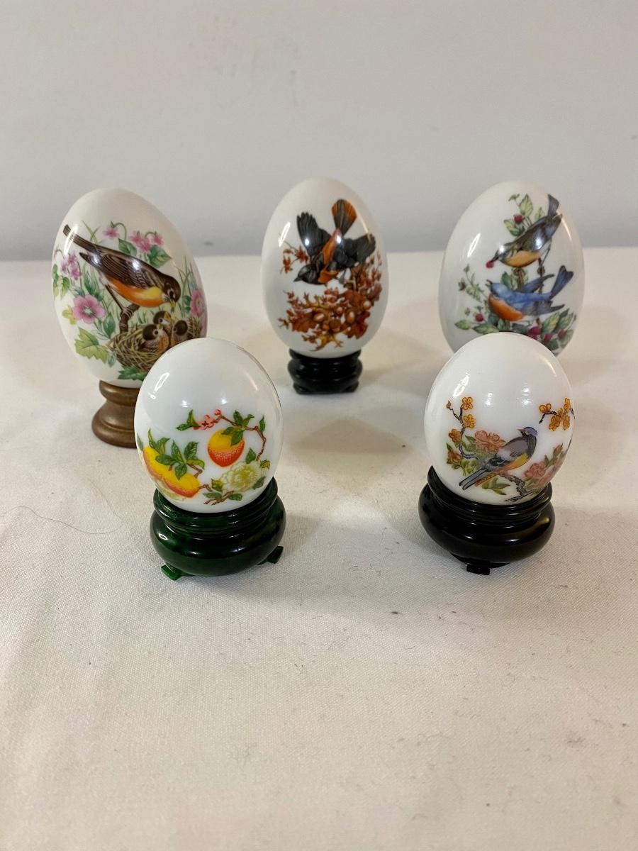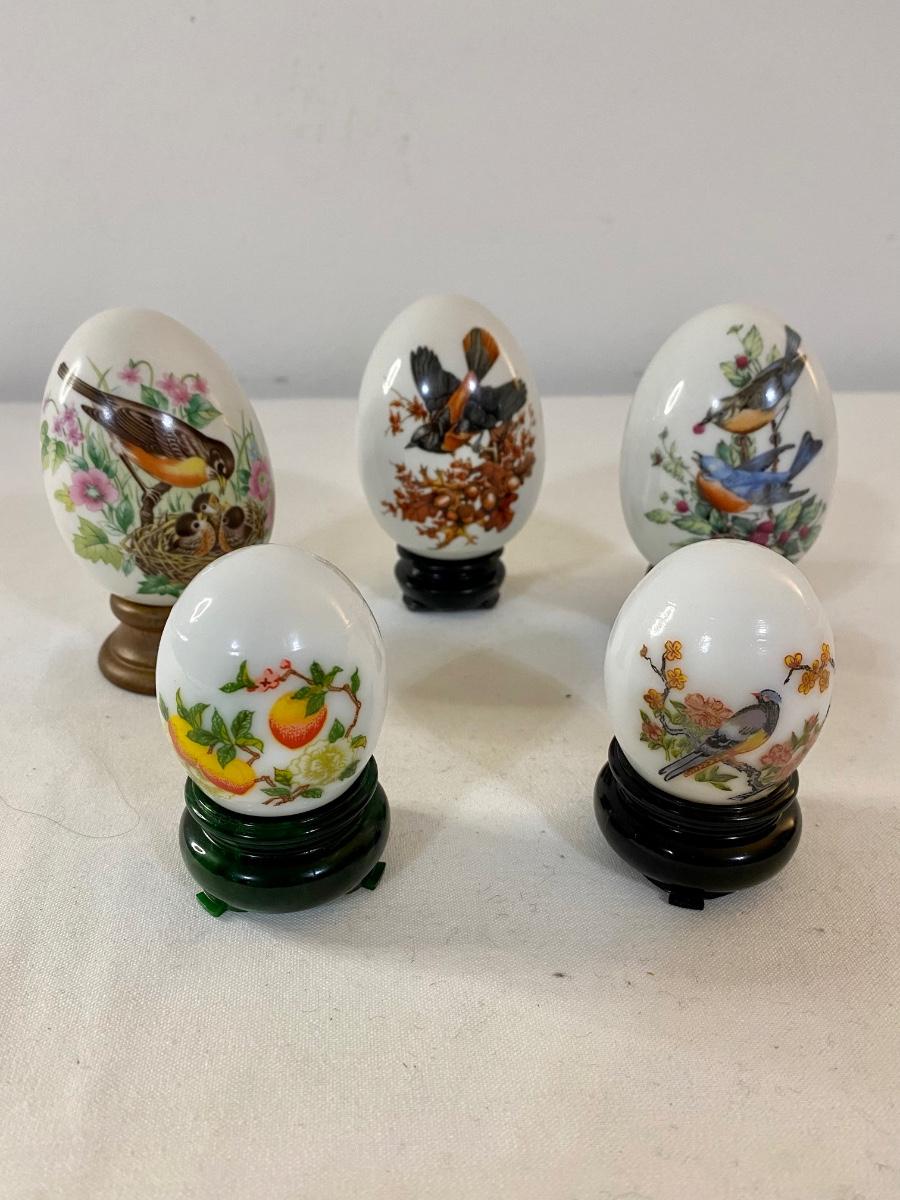 Set of 5 Porcelain eggs. 2 smaller eggs have cologne in them.
