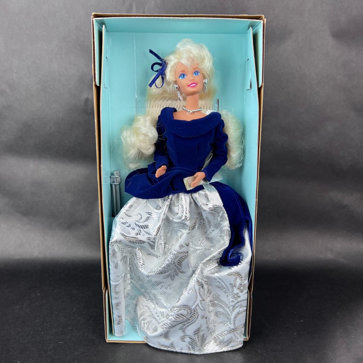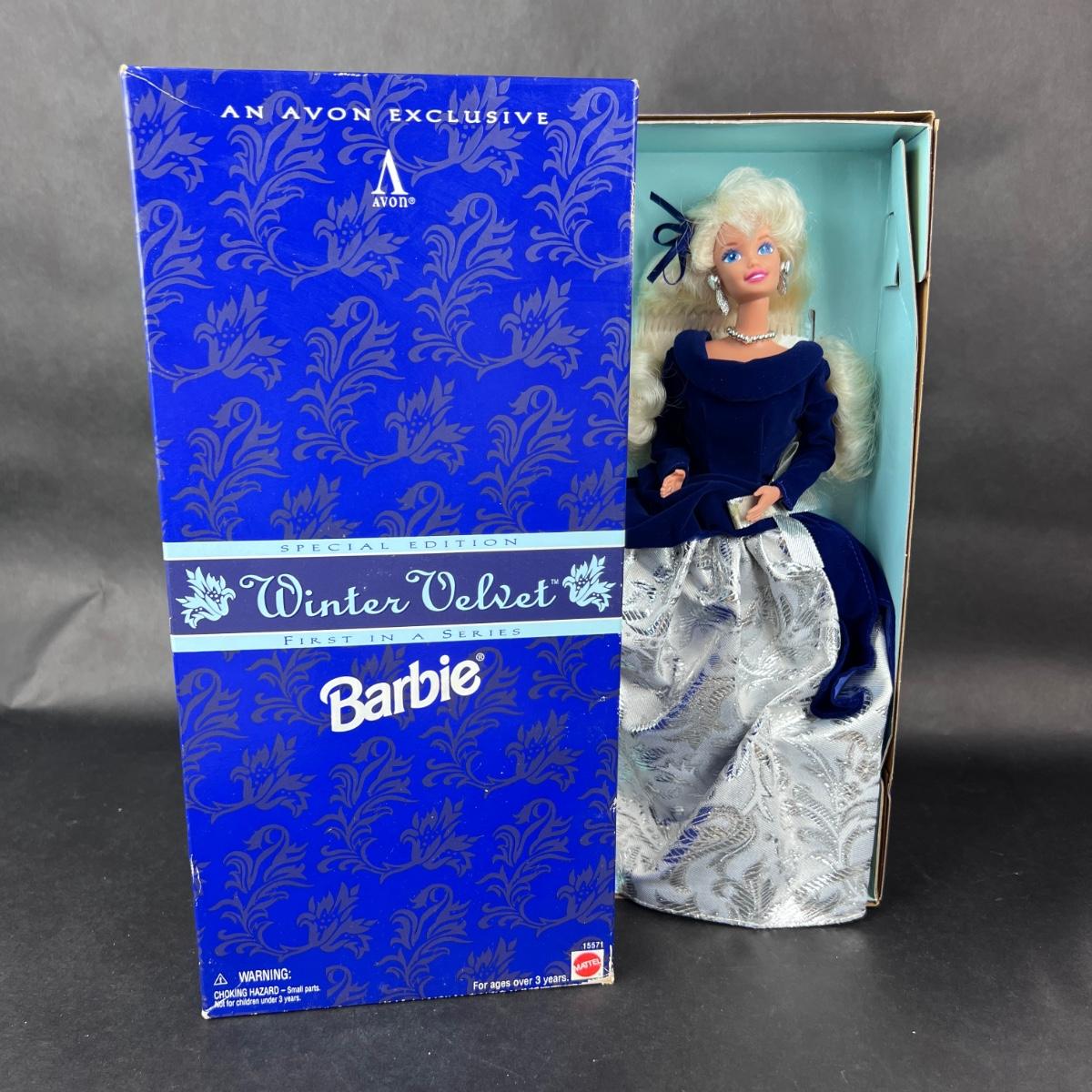 This Winter Velvet Barbie was produced in partnership with Avon and Mattel in 1995. This doll is wearing a silver skirted dress with a blue velvet top. This doll has not been out of its box. **|** Please see photos for details and condition. ::: Shipping is available on this lot. If you require shipping you must let us know at the close of the auction. We will coordinate with you after the item has been won. Shipping fees will include insurance up to or exceeding the value of all items being mailed. If you have any questions regarding this lot please contact the auctioneer either via this website, by direct email or by phone. PICK UP TIMES and other important information can be found in the TERMS and DESCRIPTION of the auction. Please take a look for pertinent information. Thanks!
