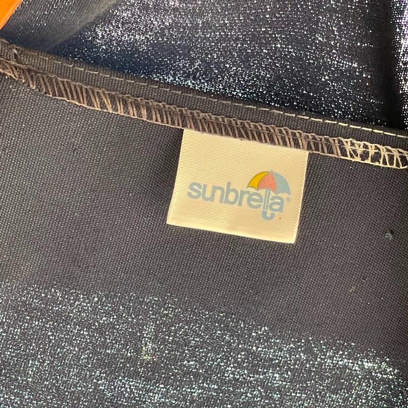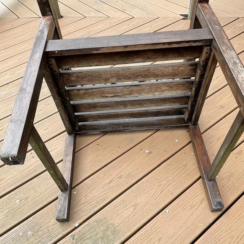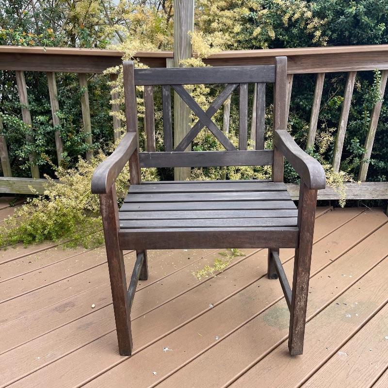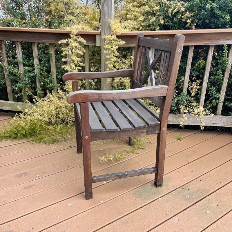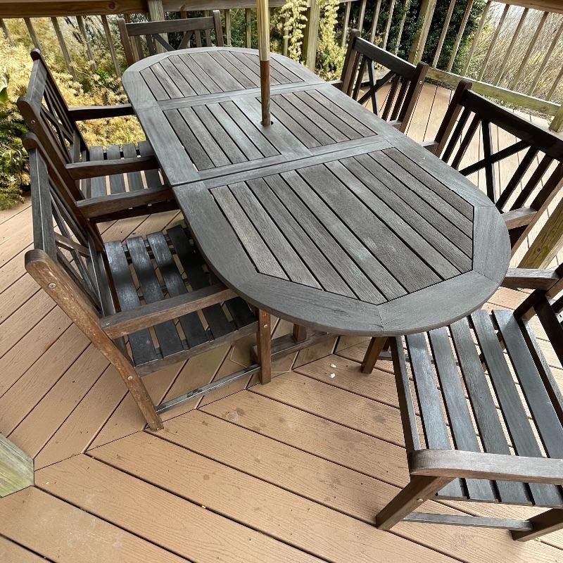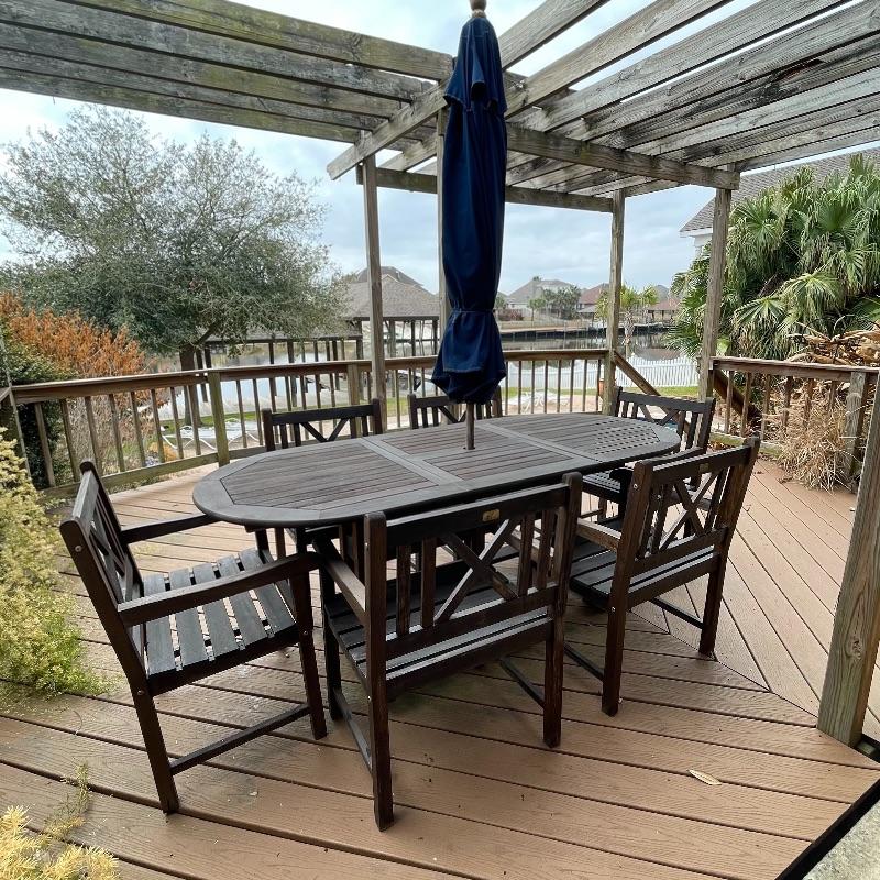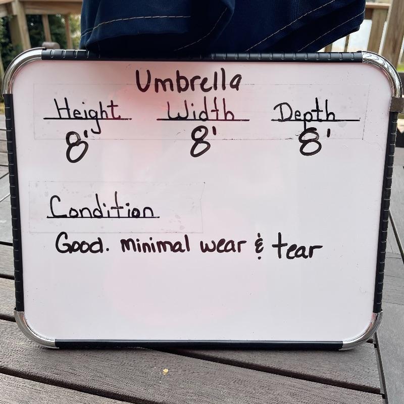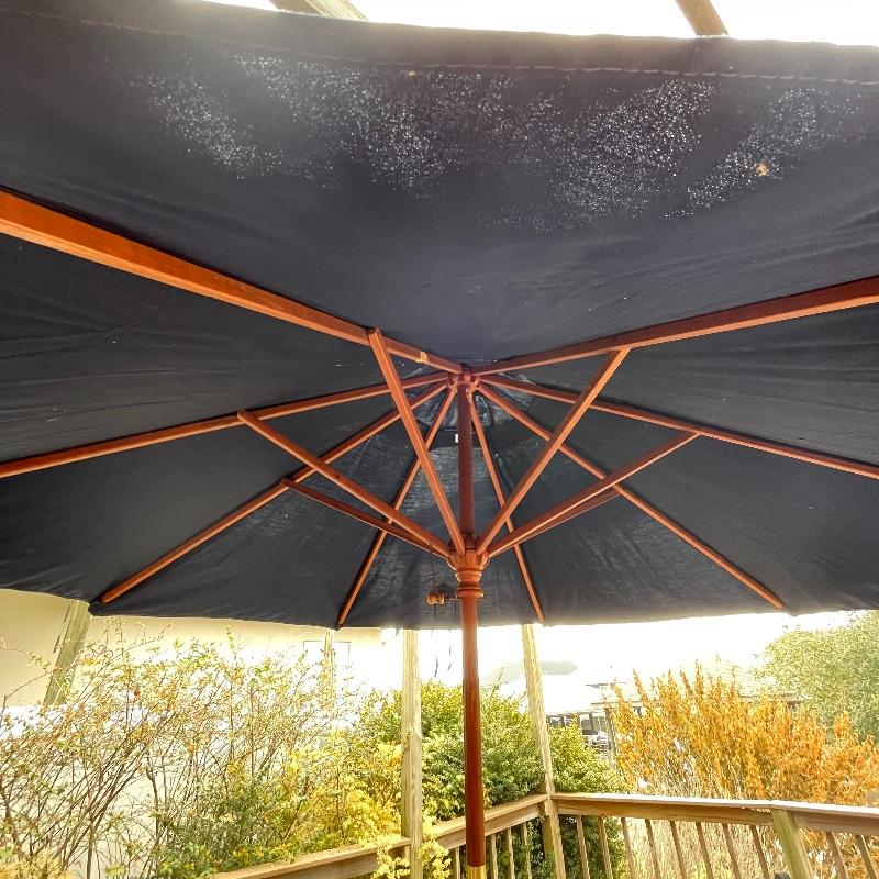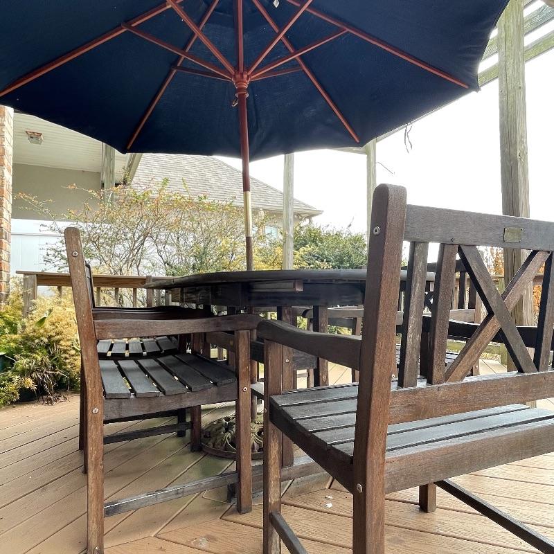 Teak chairs and table. 8’ umbrella in Navy Blue Sunbrella fabric & brass hardware