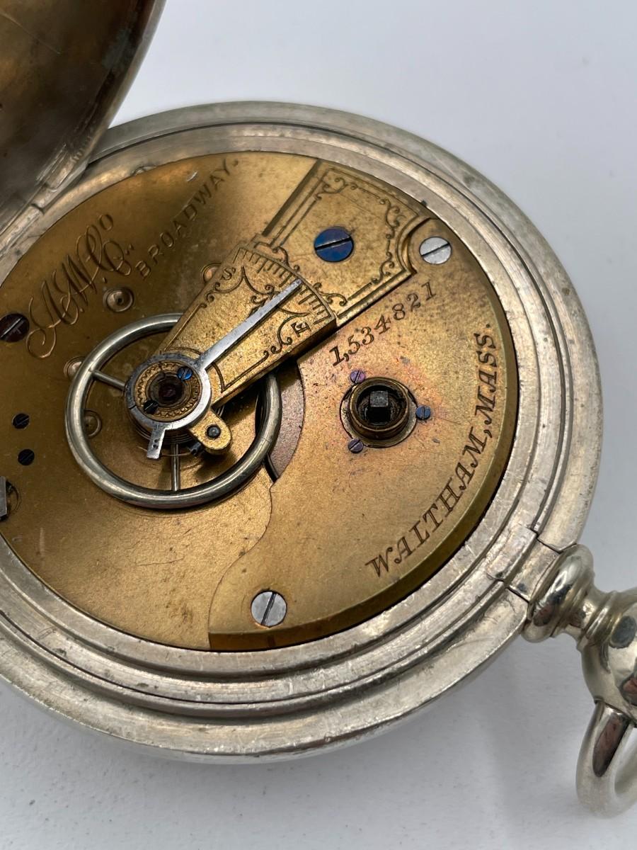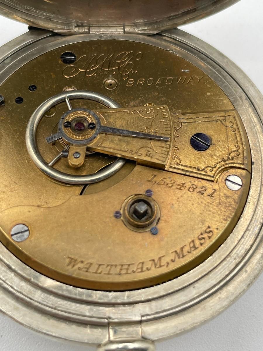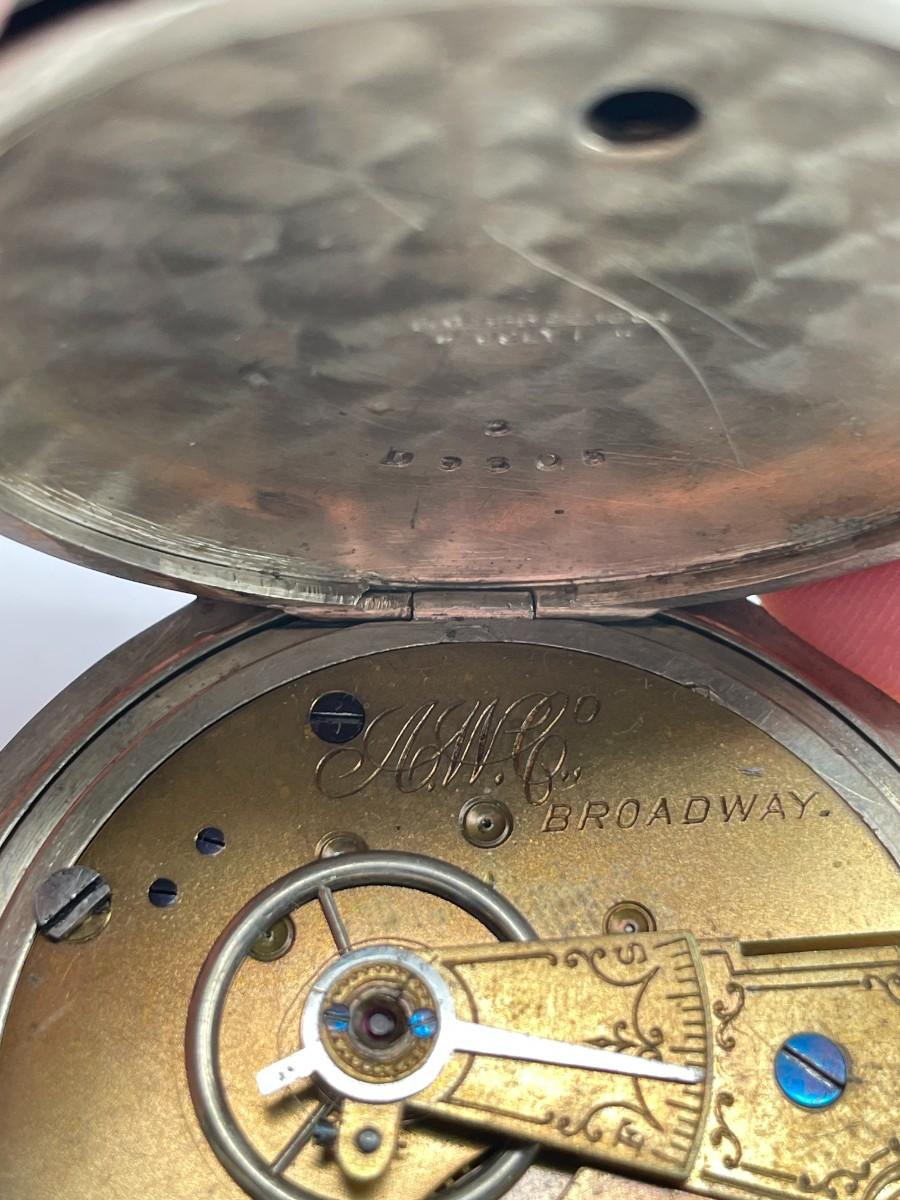 AWC Co. Broadway Pocket Watch, No. 1534821, Size 18s, Prod. Yr. 1881. Case: No. D9305, Fahys Silver Coin No. 1. Condition - Winder & watch are in working order. This is not a guarantee that all parts are original nor is the watch autheniticated.