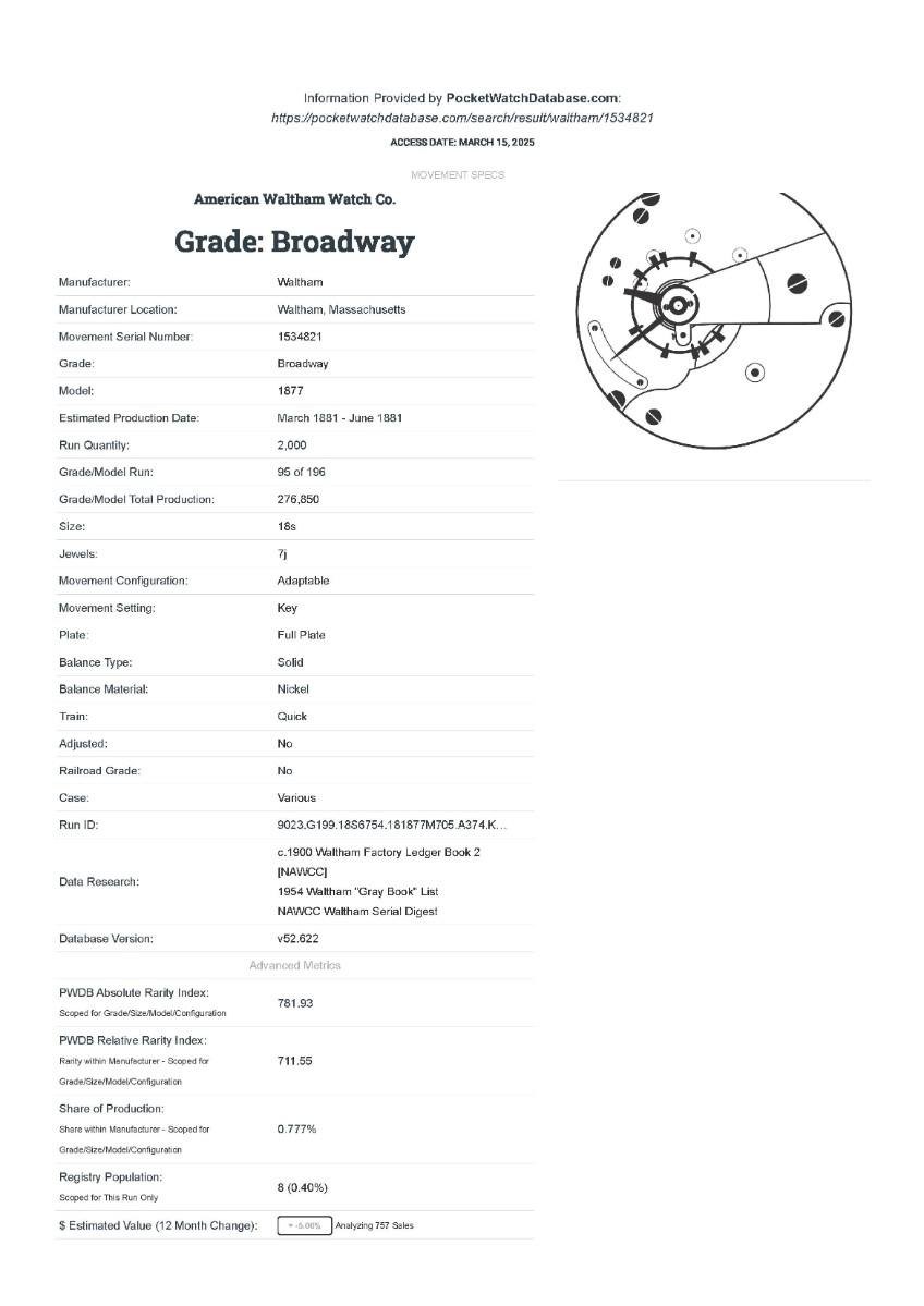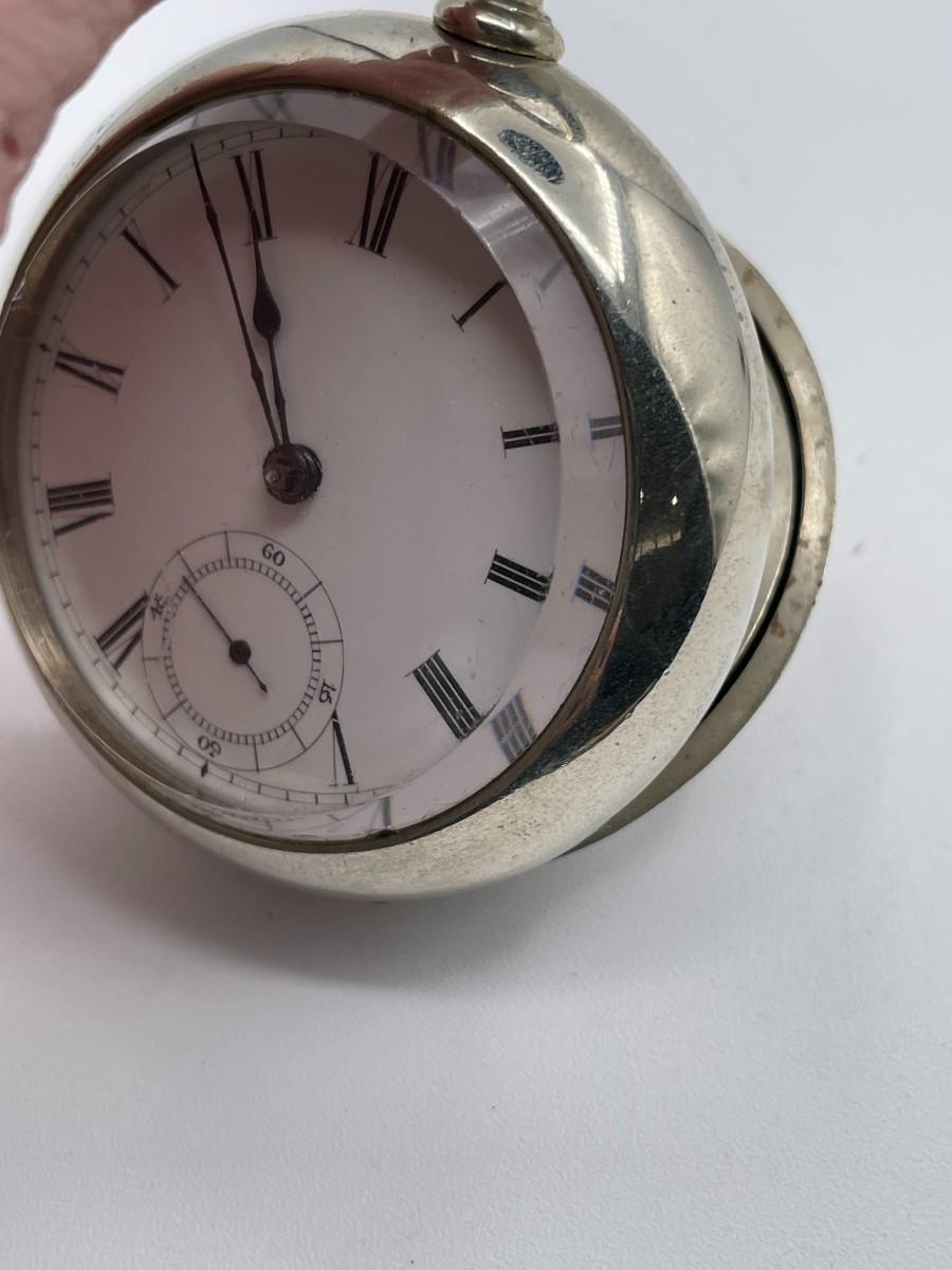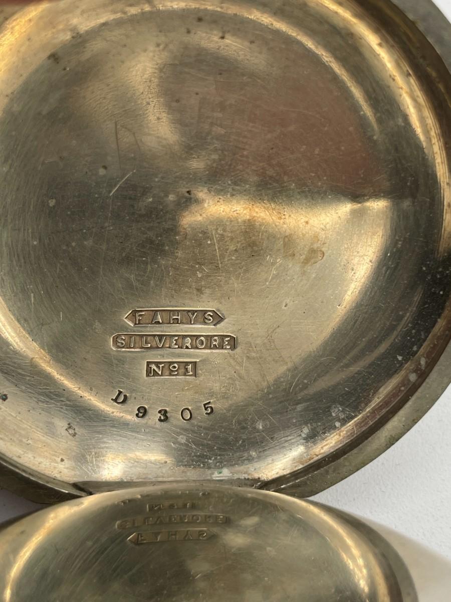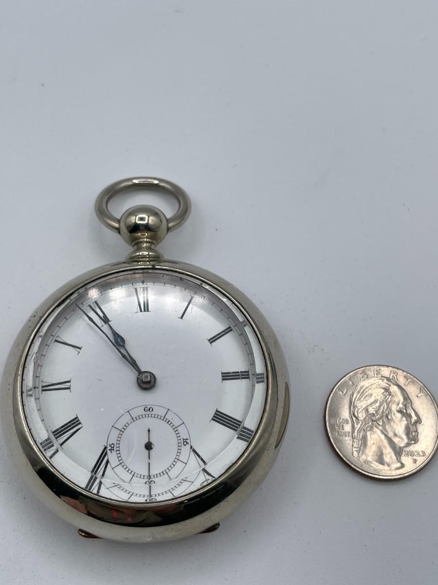 AWC Co. Broadway Pocket Watch, No. 1534821, Size 18s, Prod. Yr. 1881. Case: No. D9305, Fahys Silver Coin No. 1. Condition - Winder & watch are in working order. This is not a guarantee that all parts are original nor is the watch autheniticated.