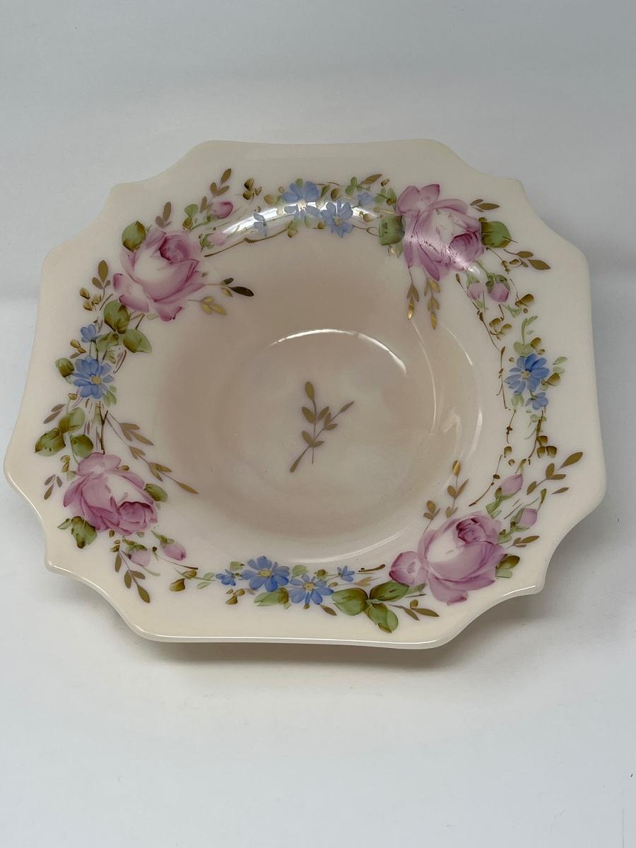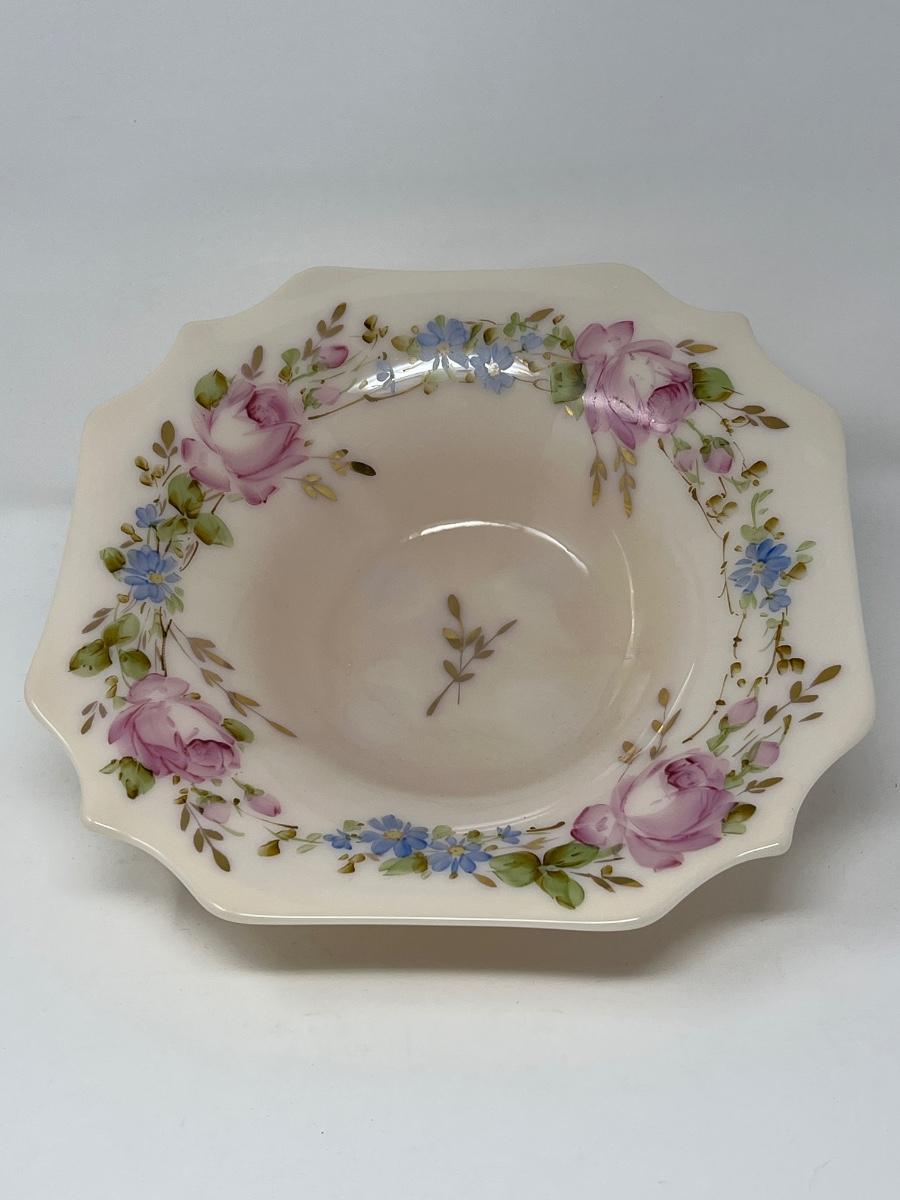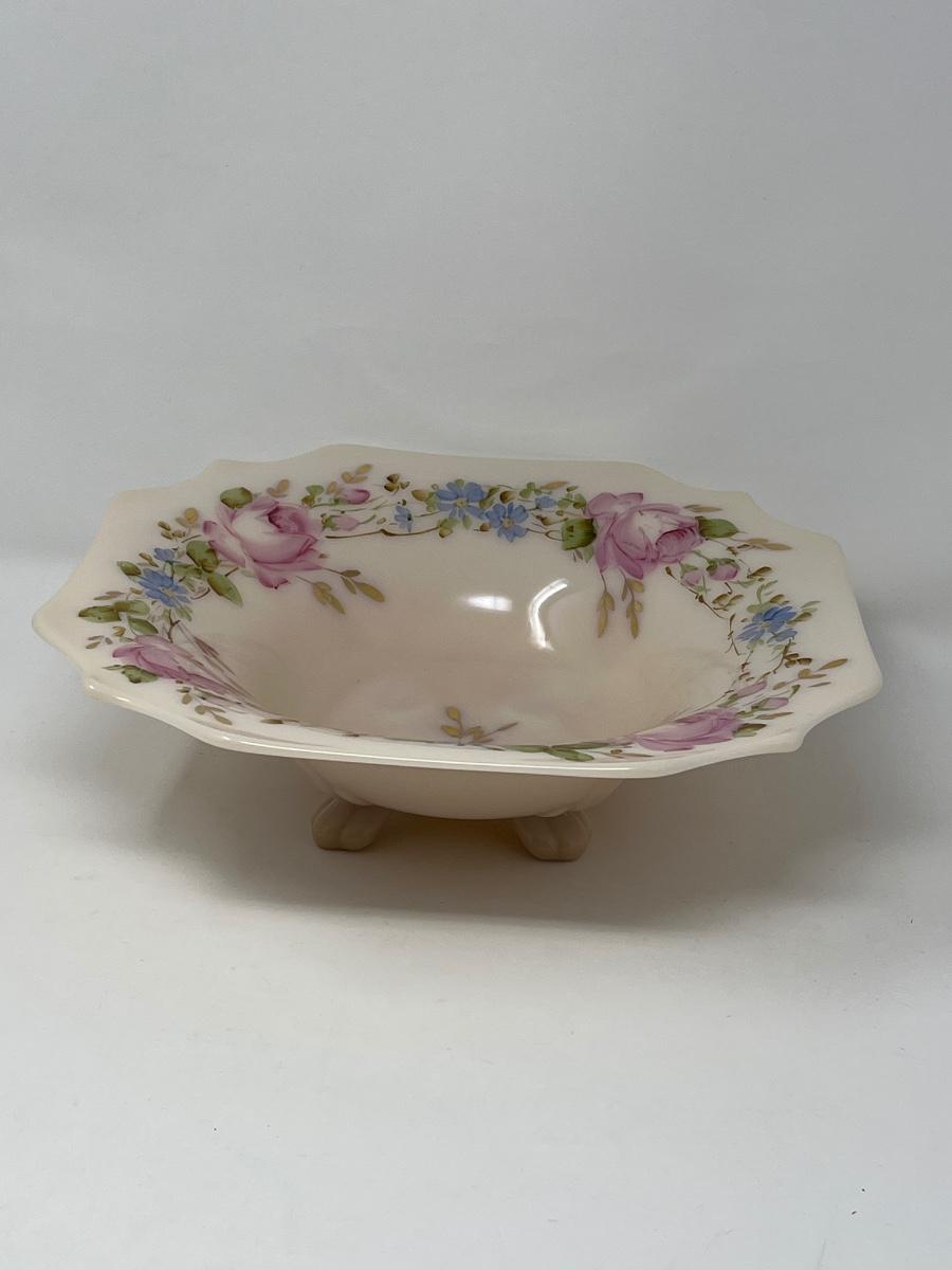 12” x 12” Vintage Charleton Glass bowl with handpainted floral design. Pink glass and blue and rose flowers with green leaves painted design. Four footed.