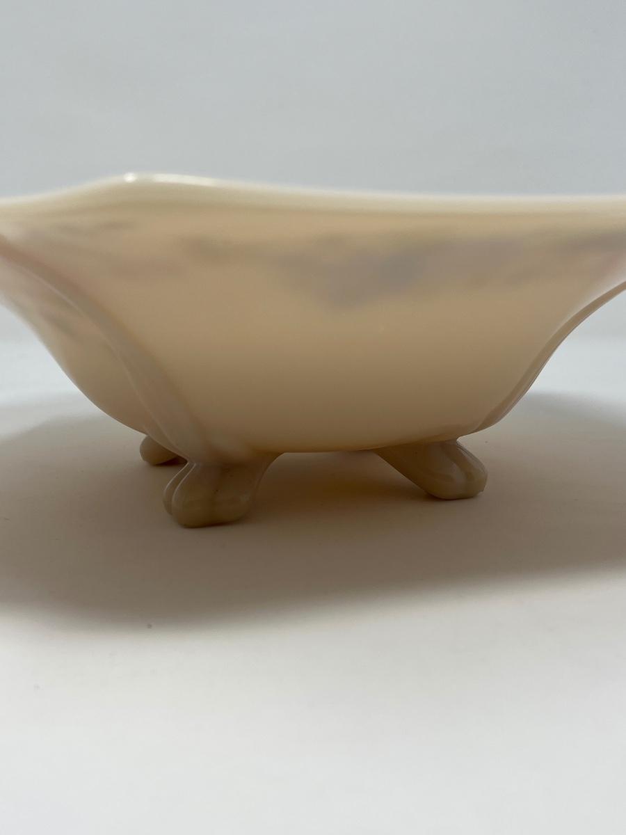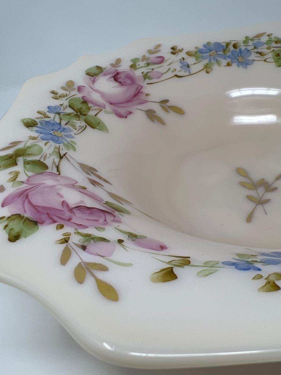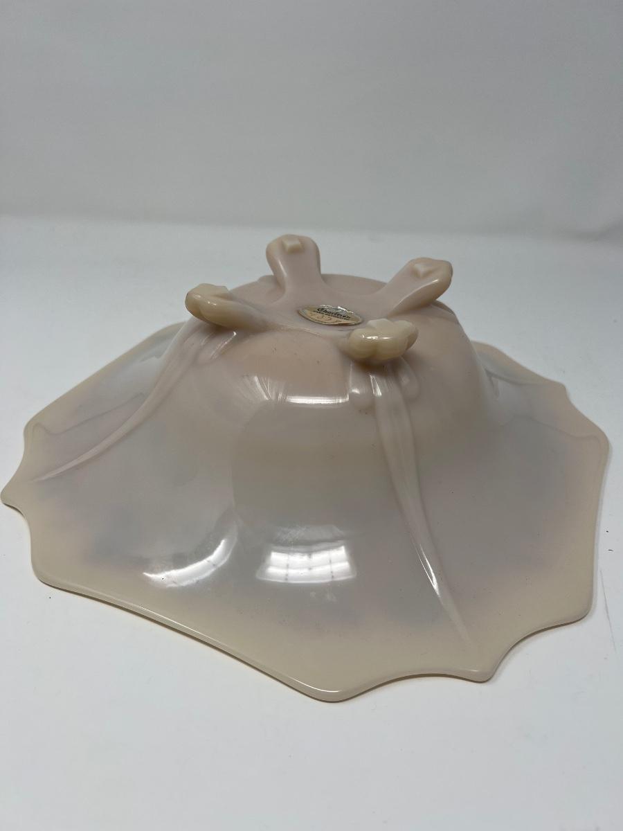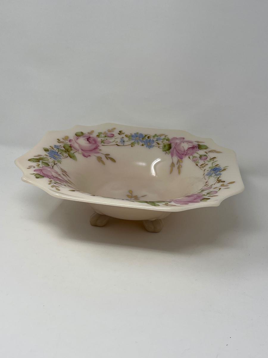 12” x 12” Vintage Charleton Glass bowl with handpainted floral design. Pink glass and blue and rose flowers with green leaves painted design. Four footed.
