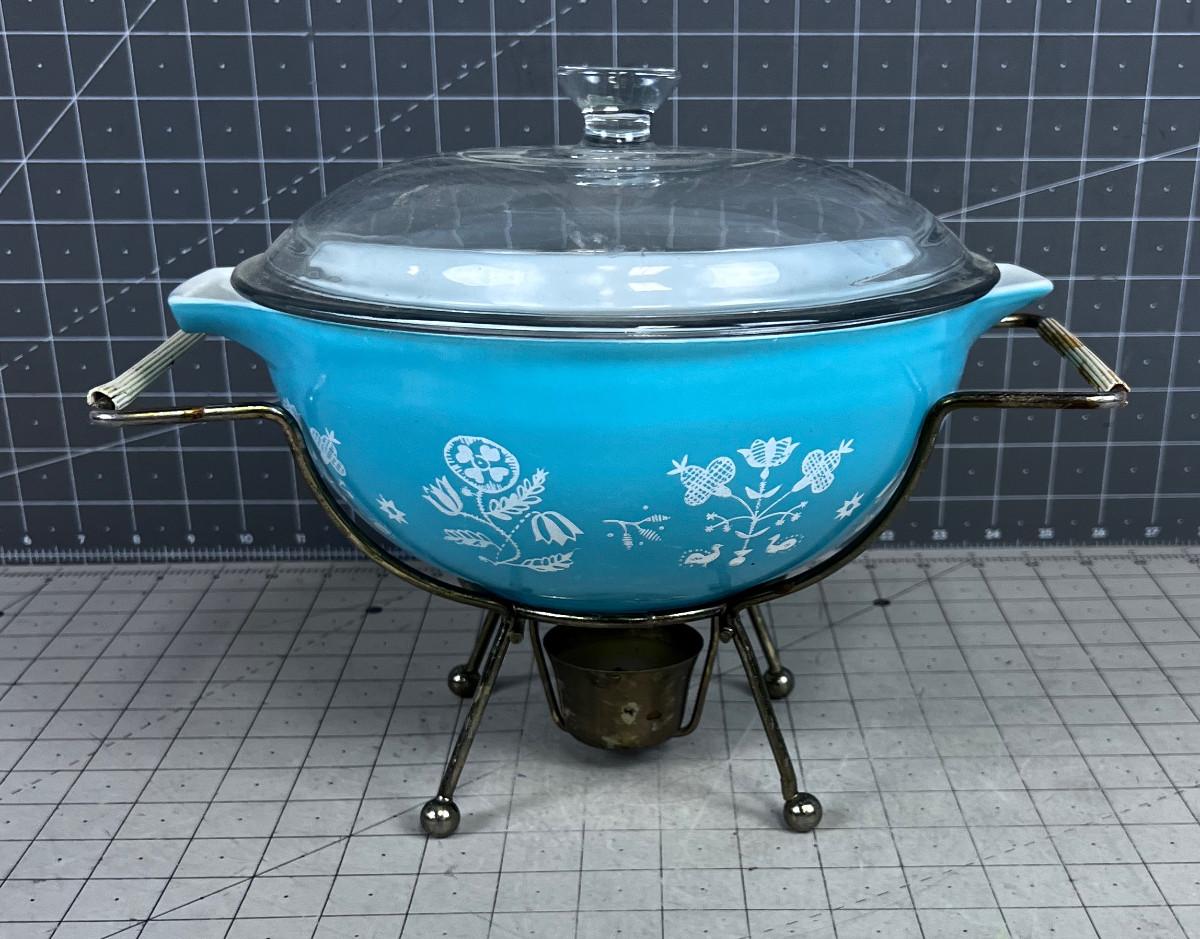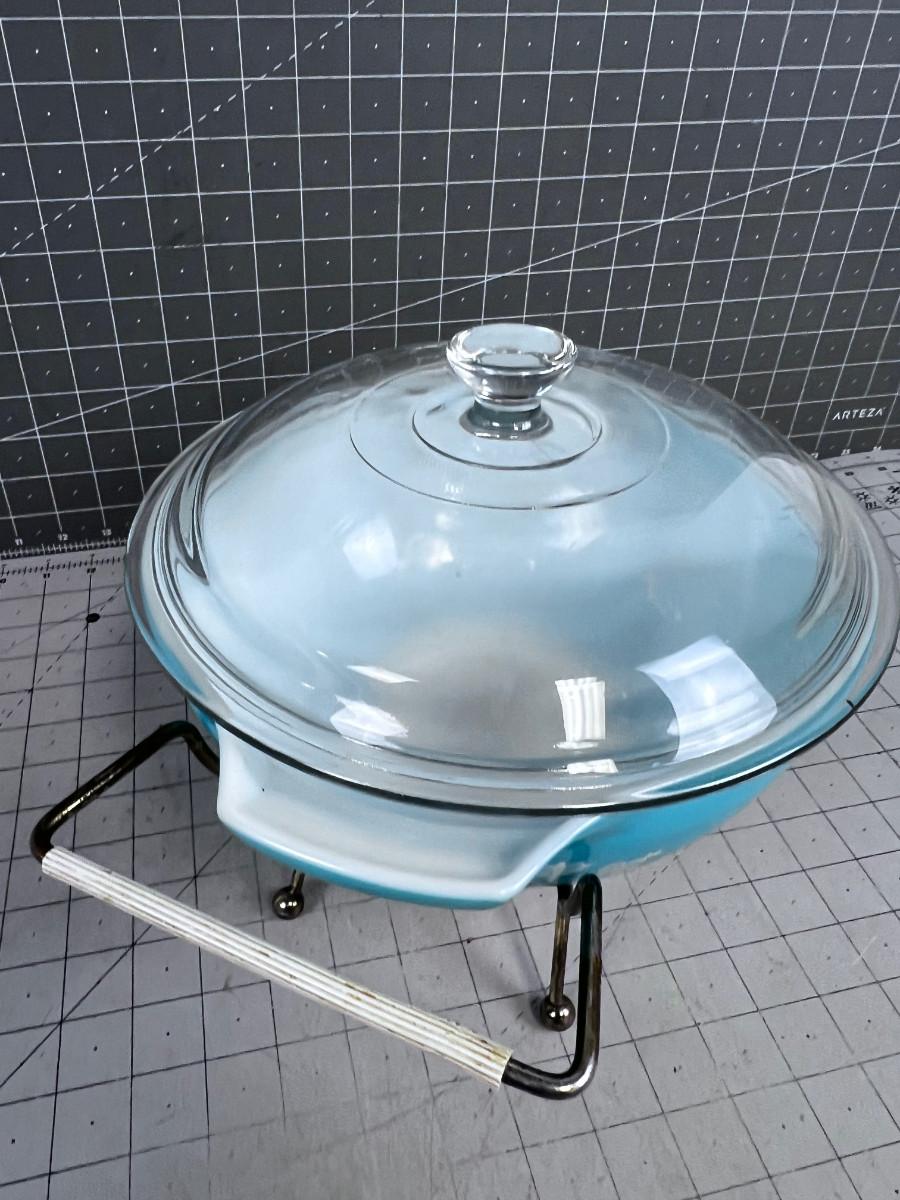 AWESOME! Blue 1957 Embroidery PYREX With Cradle. OLD!