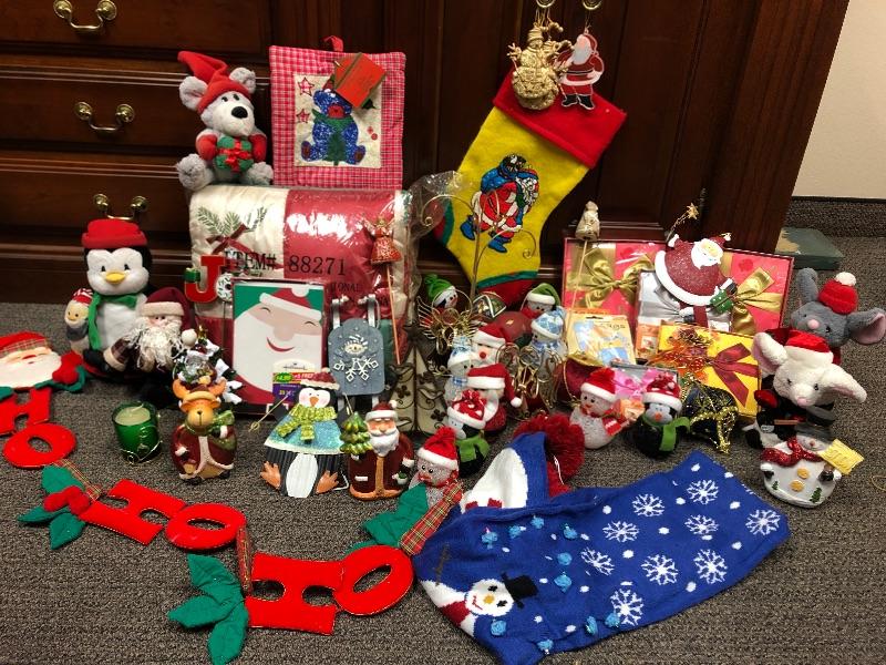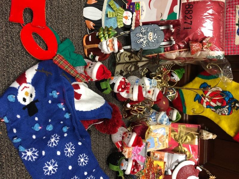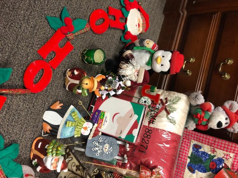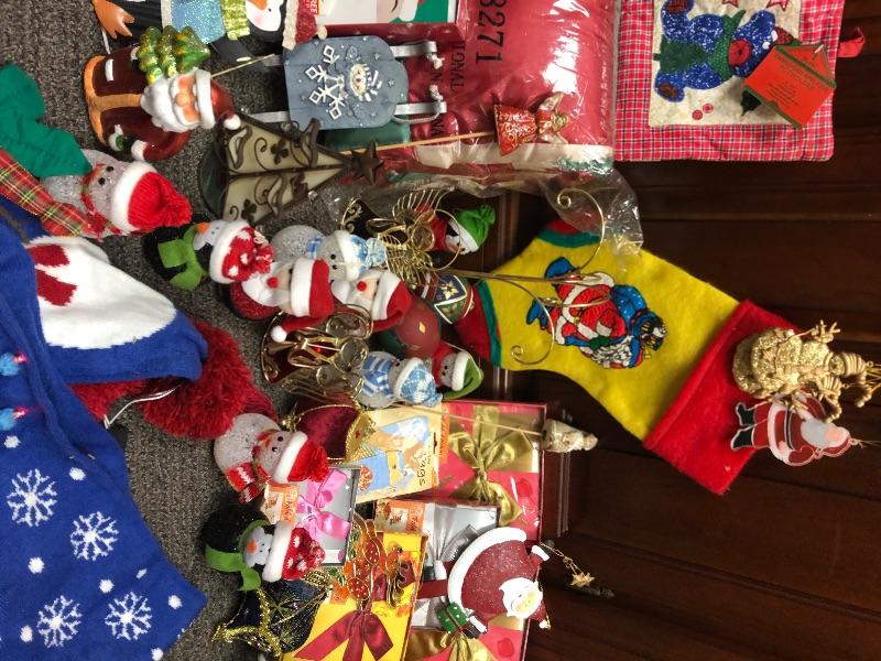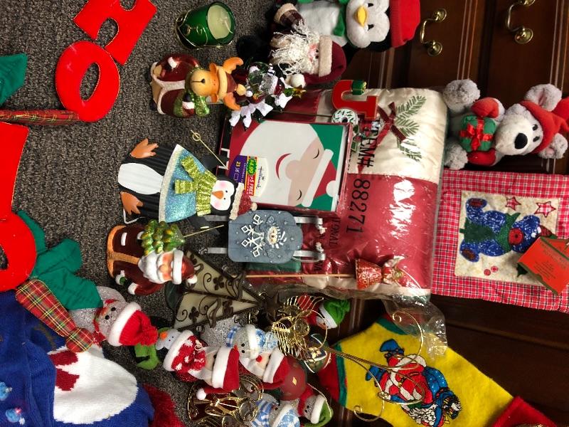 Quilt, ornaments, Decour, Light up Scarf, ornament hangar, potholder, candle holder, Christmas cards, Christmas wrap boxes, stocking, figurines, plush animals, etc. All in good condition