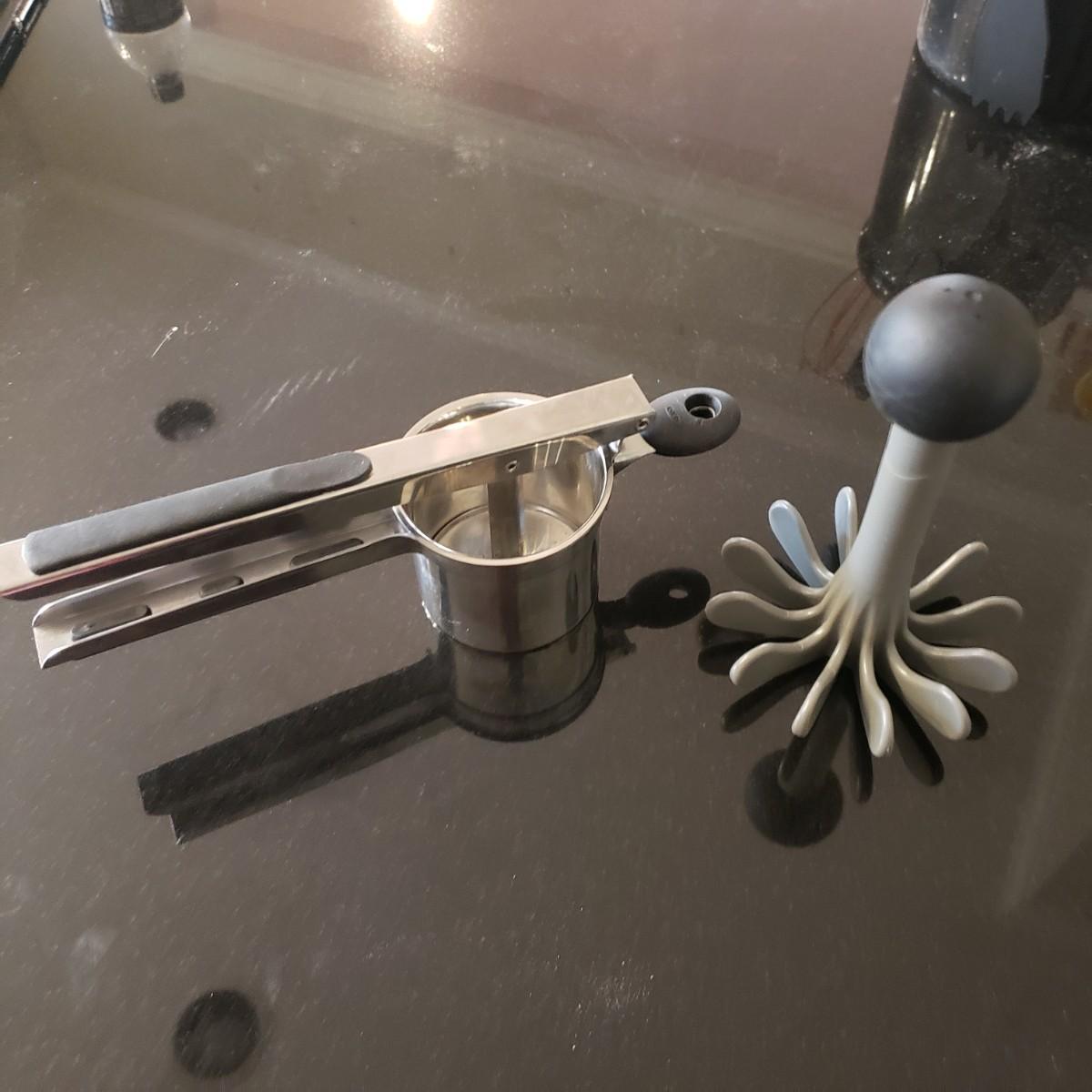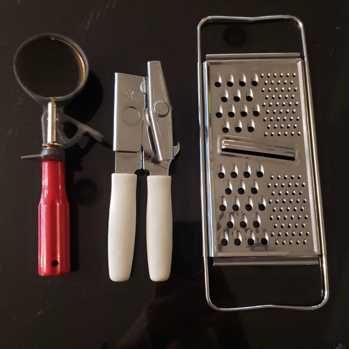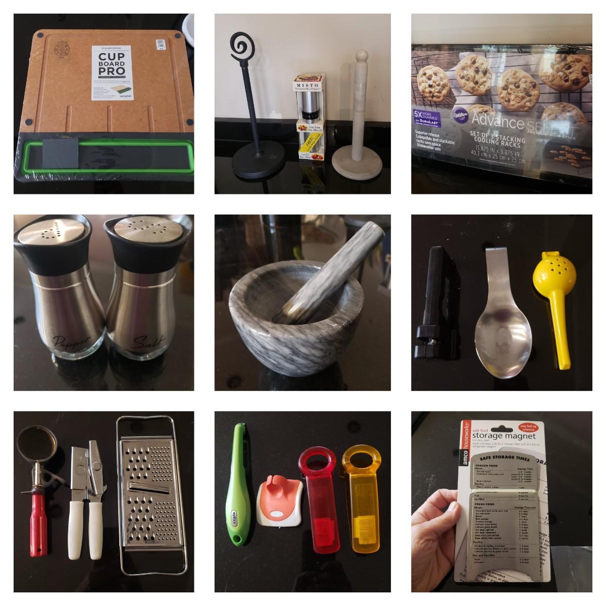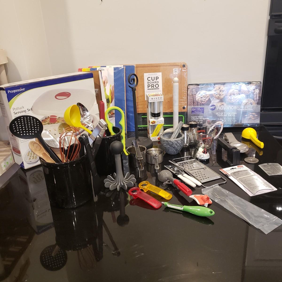 There are some very handy kitchen utensils in this lot!! Who doesn't need a chicken timer? Some items are still in packaging. Williams Sonoma cutting board measures 15" x 16". See pictures for all details.
