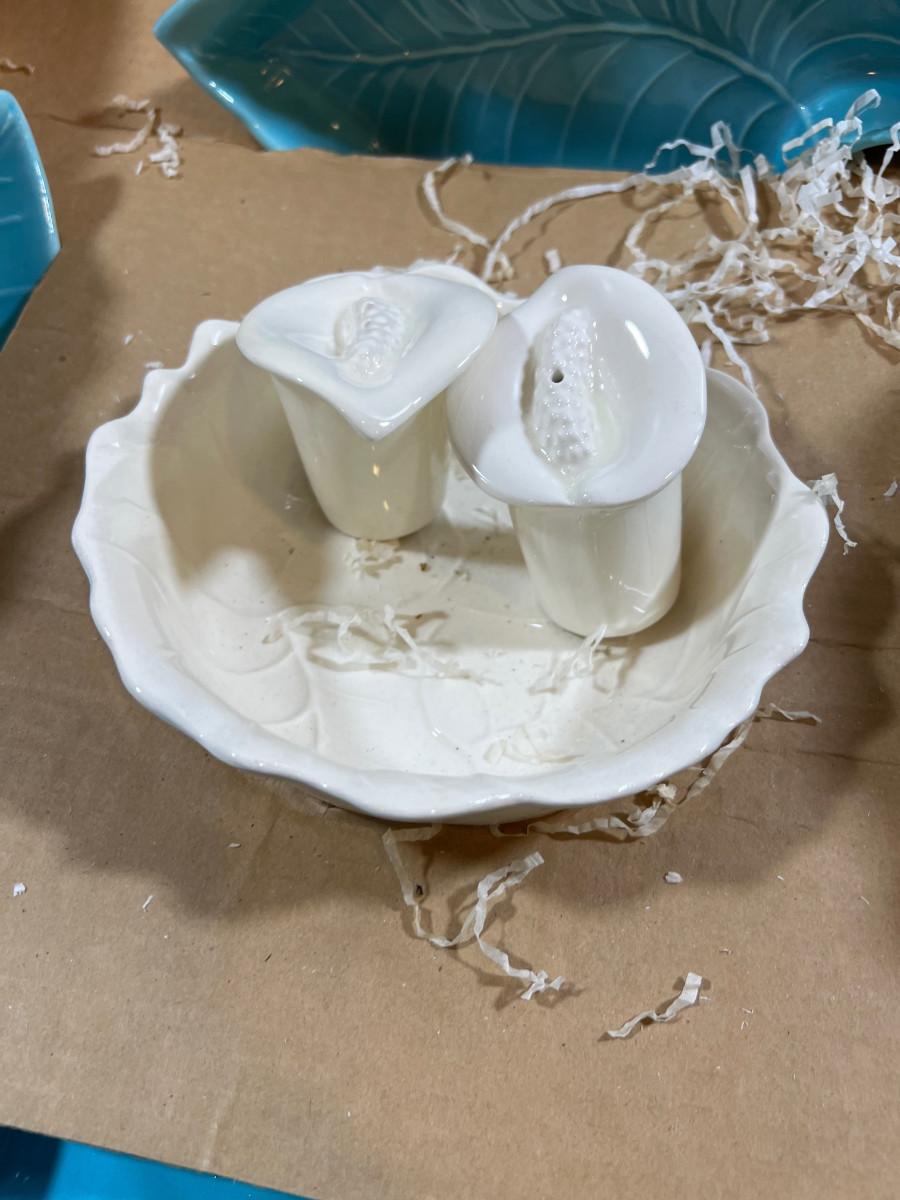 Awesome, Lazy Susan with Salt and Pepper, Turquoise Leaf, Never Used.