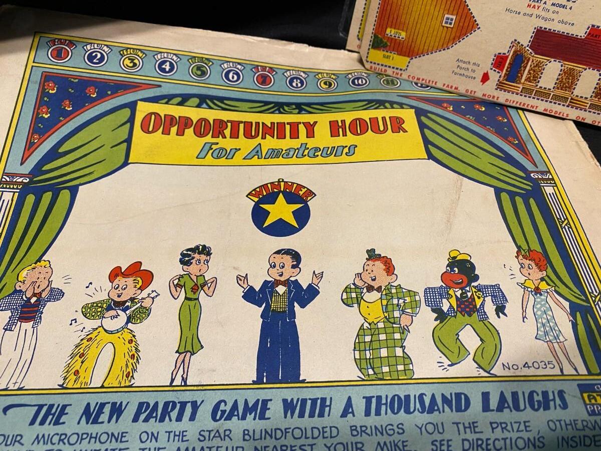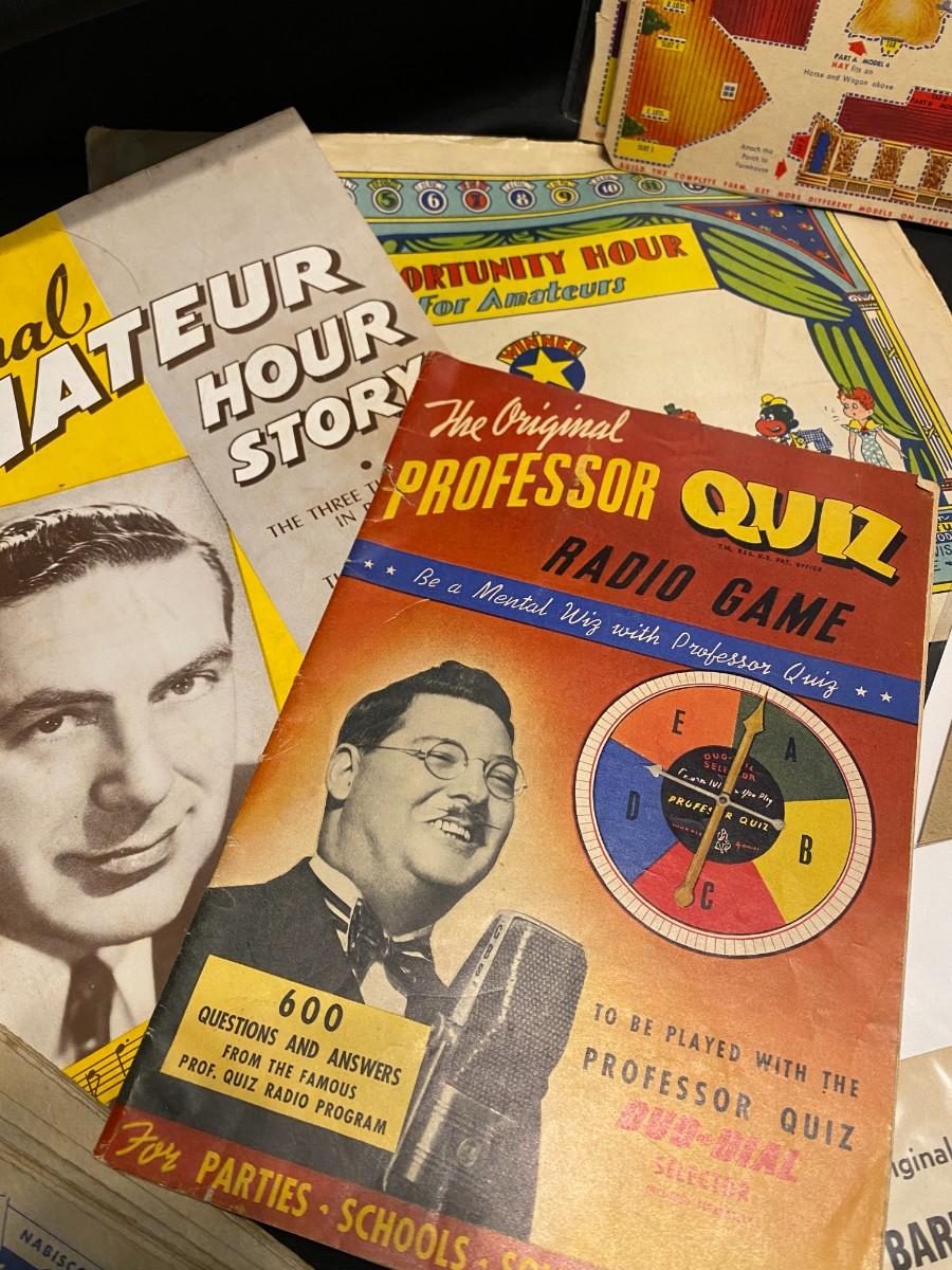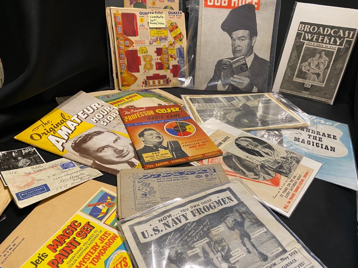 Awesome Lot of Vintage and Antique Radio Broadcasting Entertainment Ephemera from the 1930s, 1940s, 1950s, and 1960s. Includes a 1936 scrapbook, 1948 Nabisco Cards, Mandrake, Amateur Hour Story, 1969 Bob Hope, Professor Quiz radio game, 10 cent Broadcast Weekly. Condition as shown.