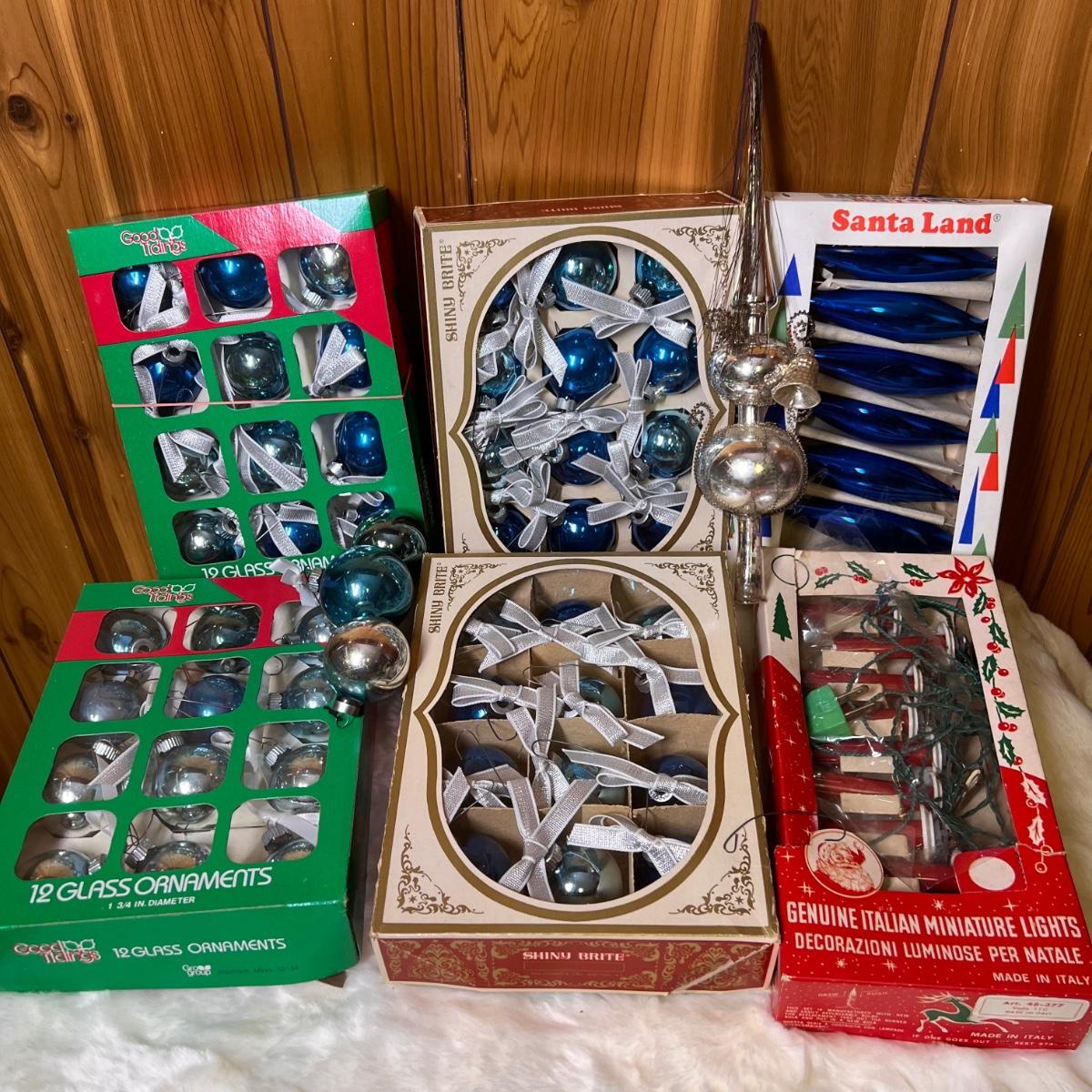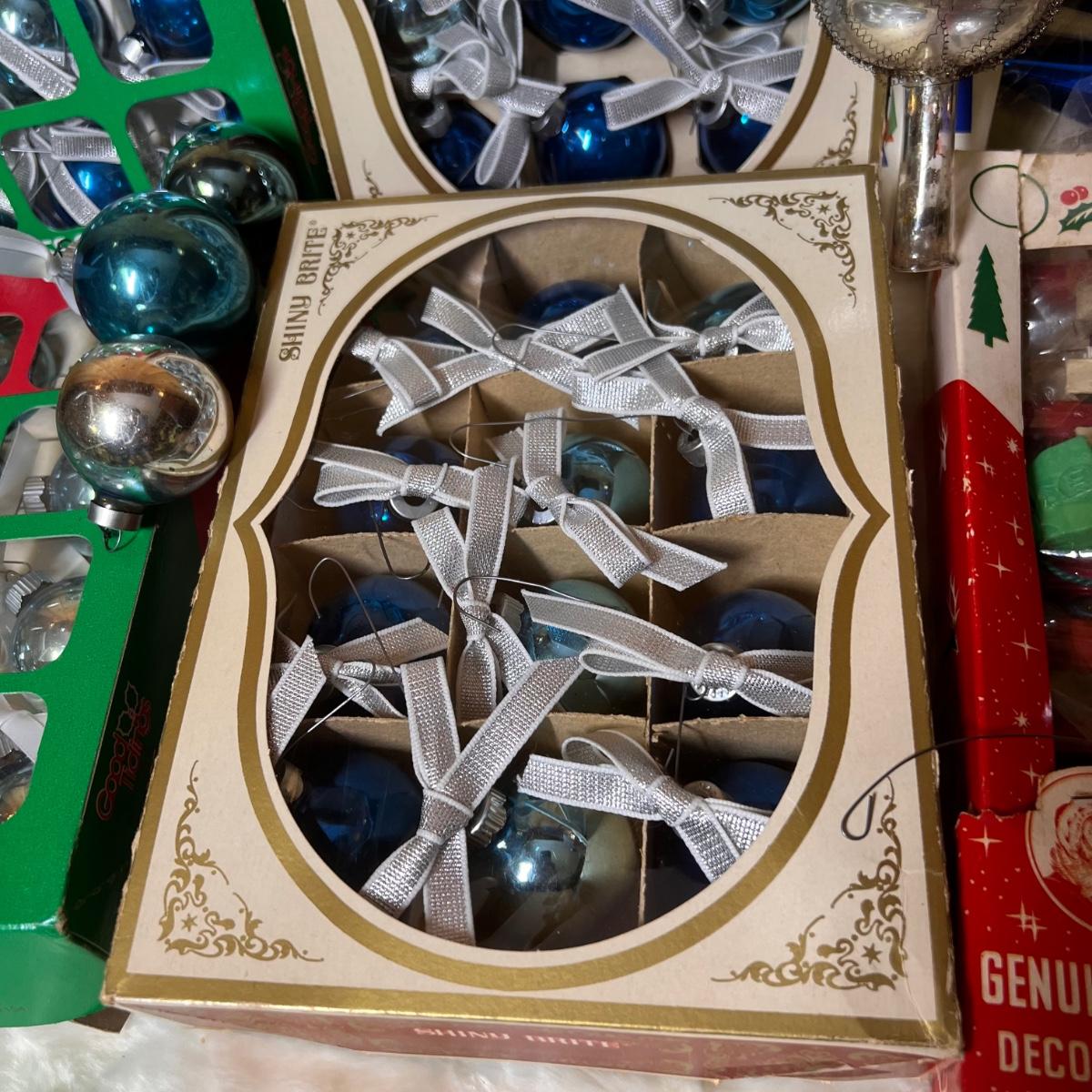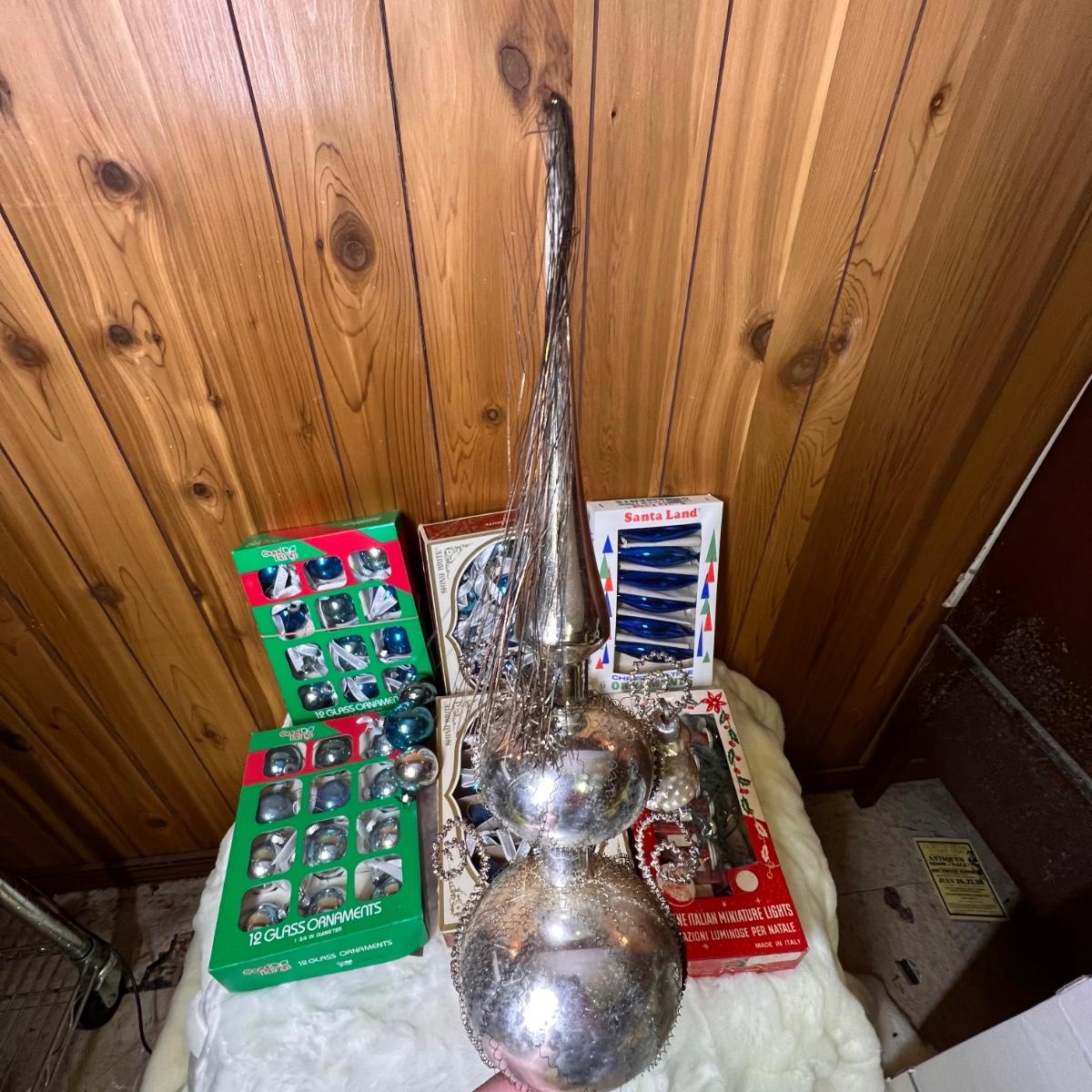 New old stock 5 boxes of vintage mcm ornaments, 1 box of Italian miniature lights (untested), 1 tree topper, and 3 ornaments without box