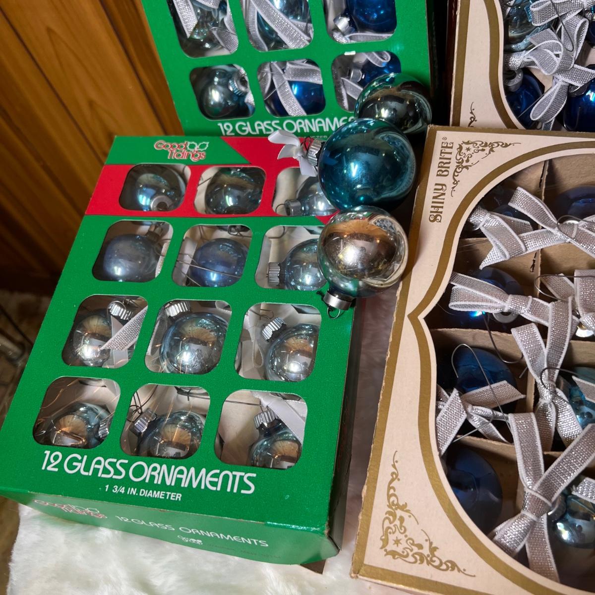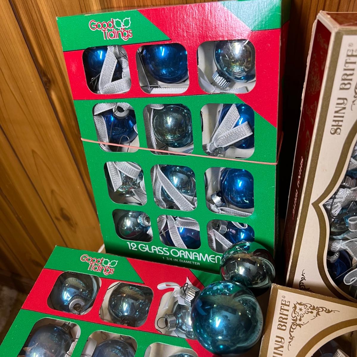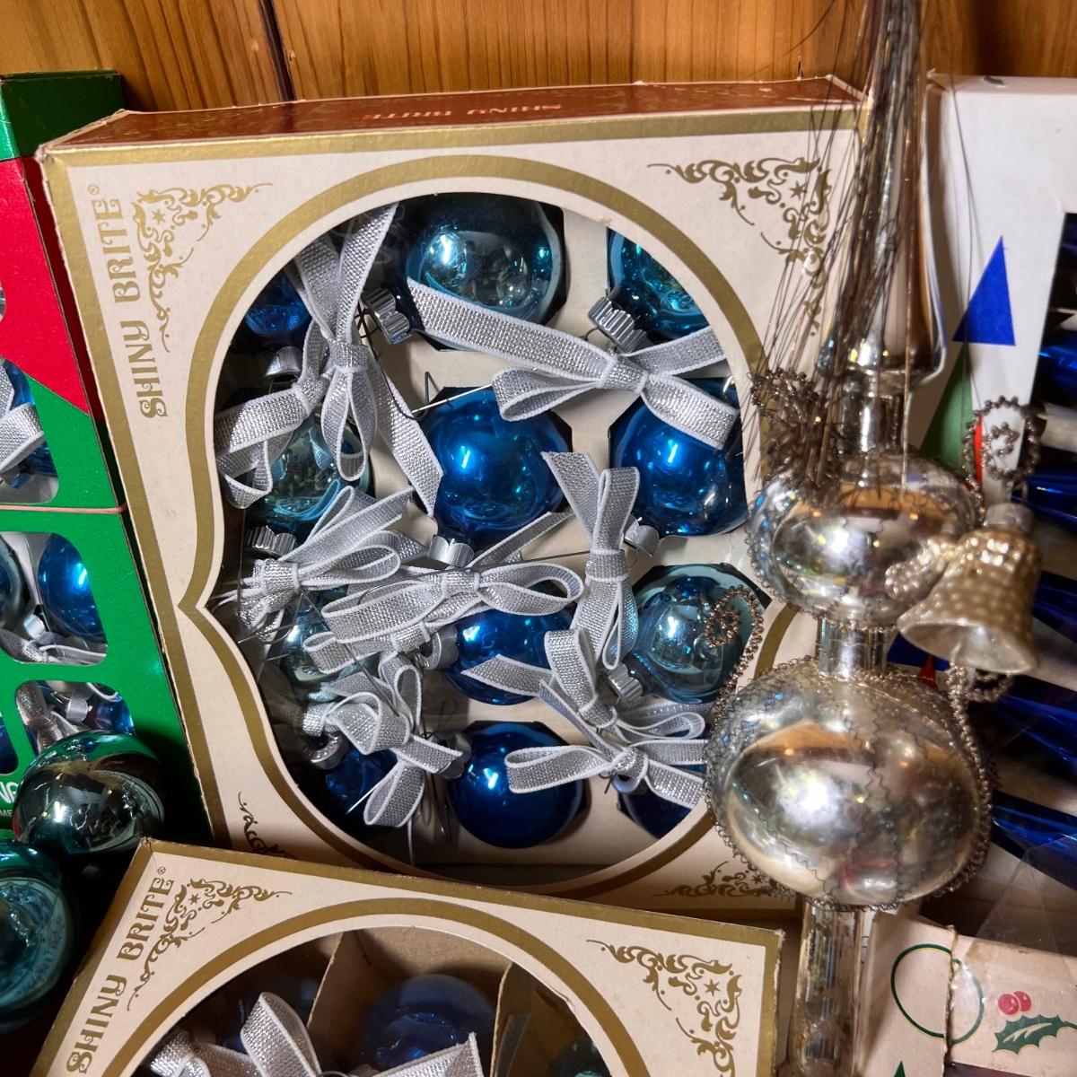 New old stock 5 boxes of vintage mcm ornaments, 1 box of Italian miniature lights (untested), 1 tree topper, and 3 ornaments without box