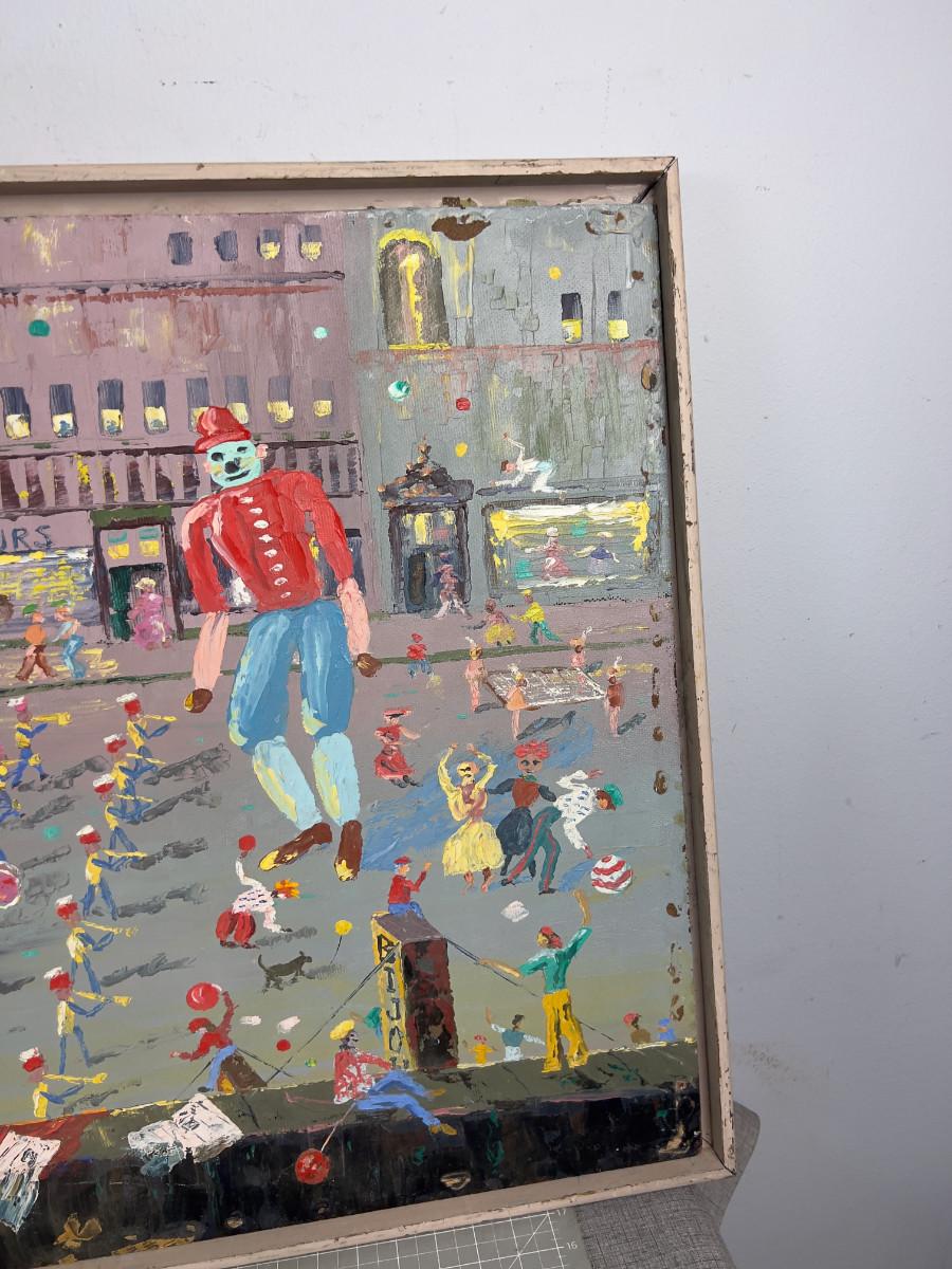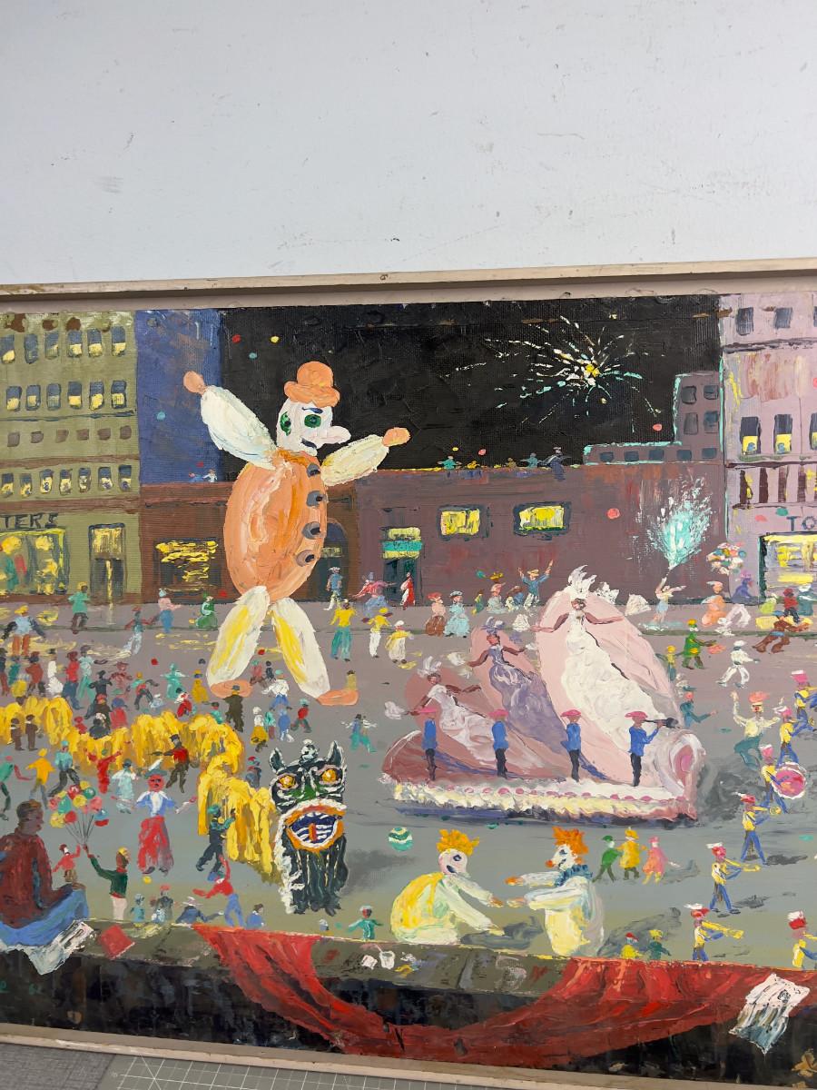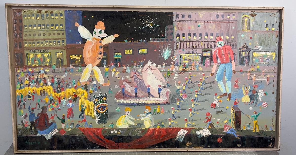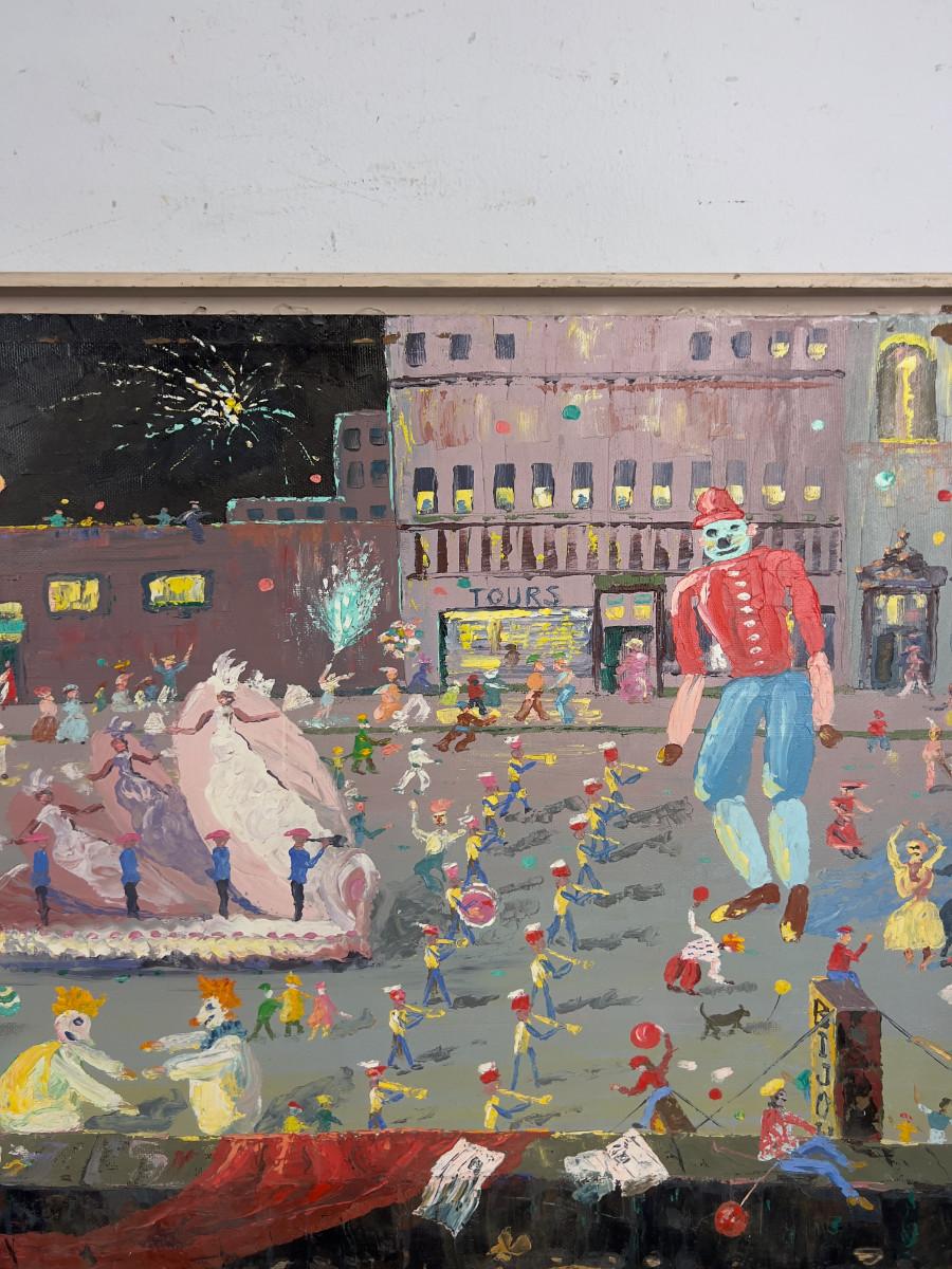 Awesome Outsider Art Mardi Gras Parade Oil on Board 48x24" Hazelle '62