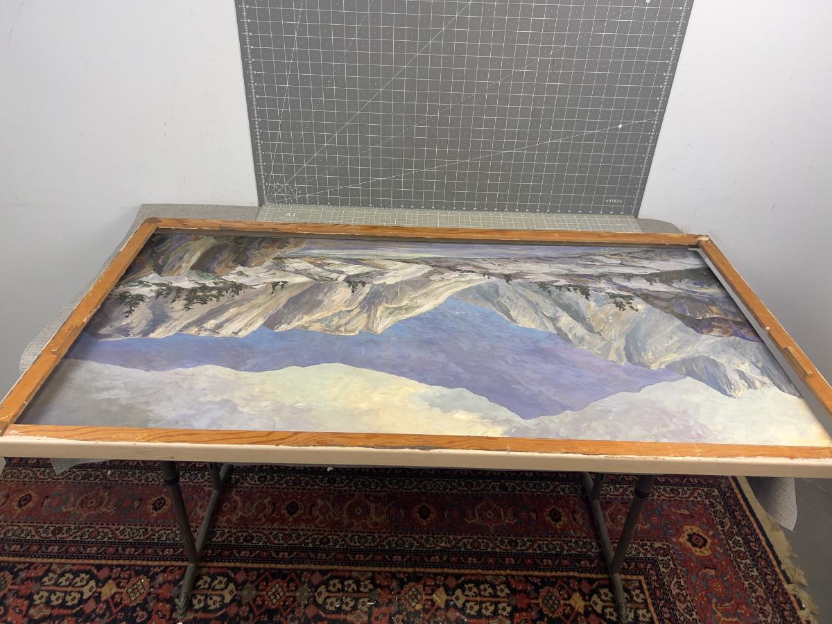 Great vintage outsider art painting so festive and colorful, Signed "Hazelle" '62. approximate 4' by 2' on board, homemade frame with a mountain scene painted on the reverse side.