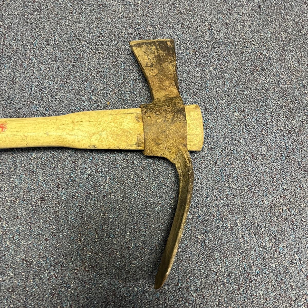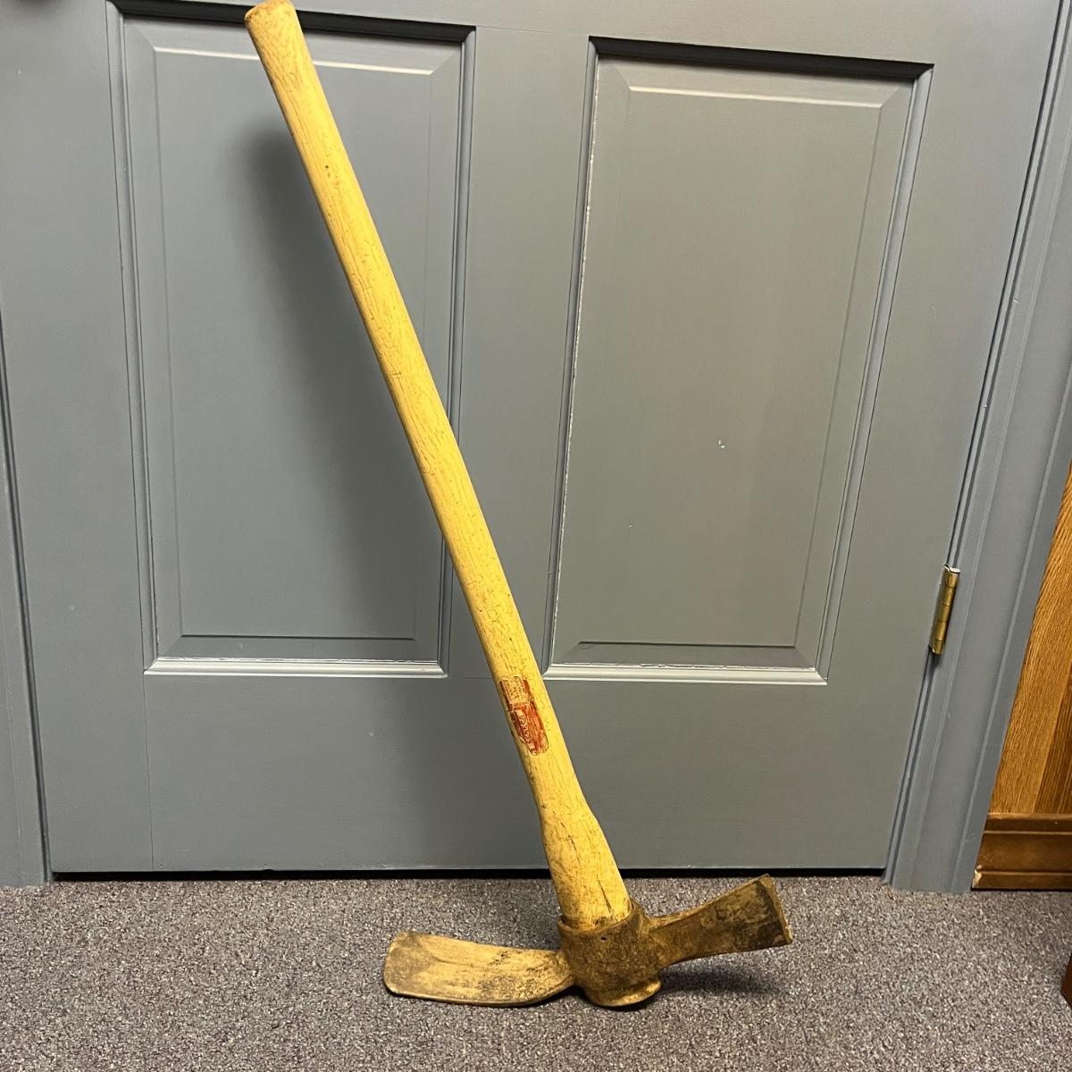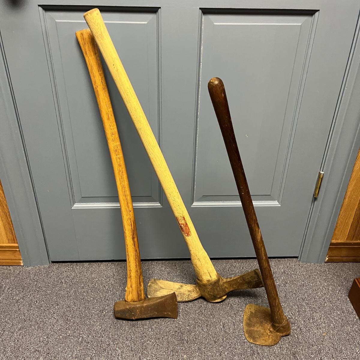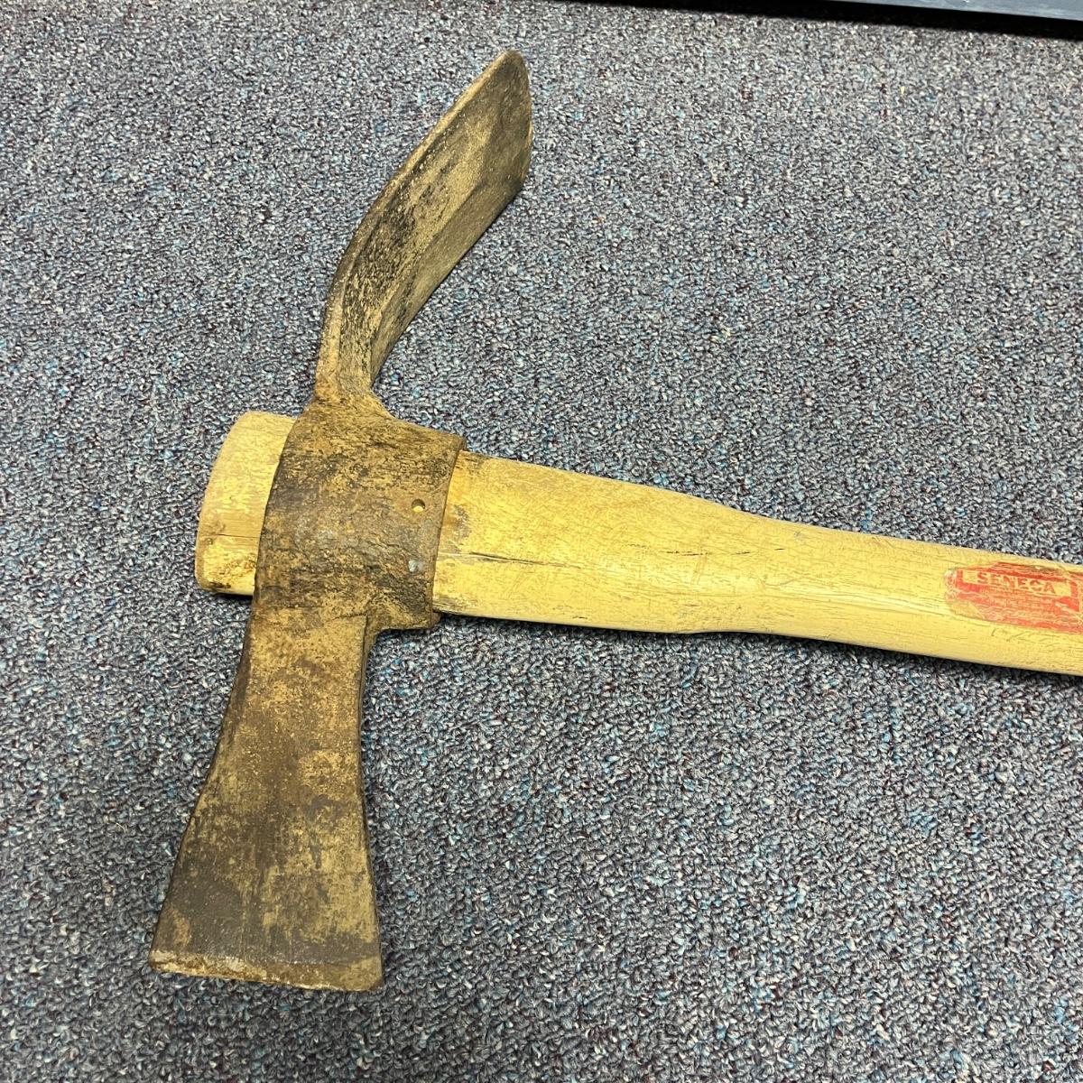 Lot includes a Seneca pickaxe, ax and a short handled hoe, all with wooden handles. Pickaxe measures 15” x 3.5” x 36” long.