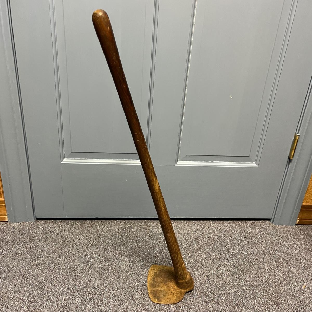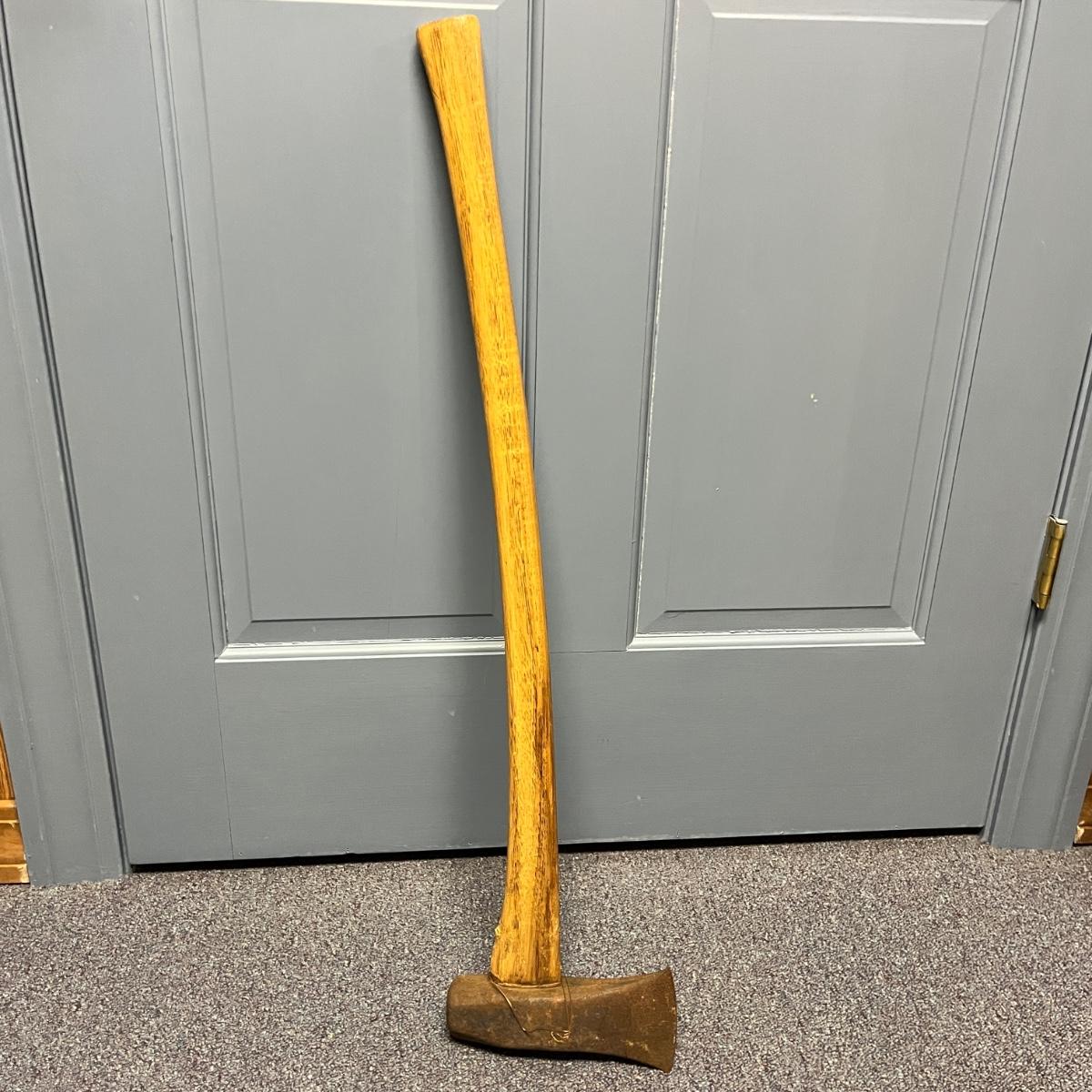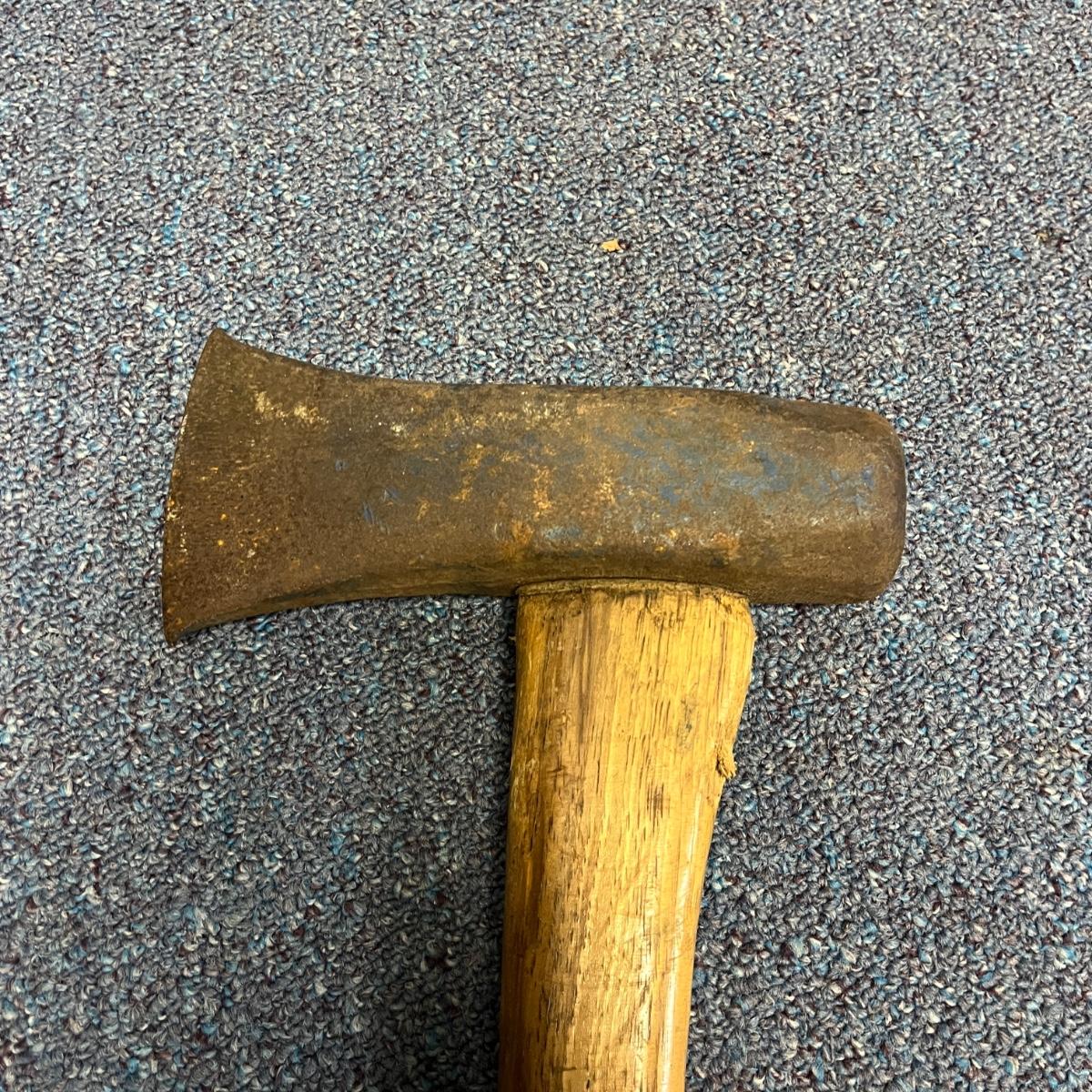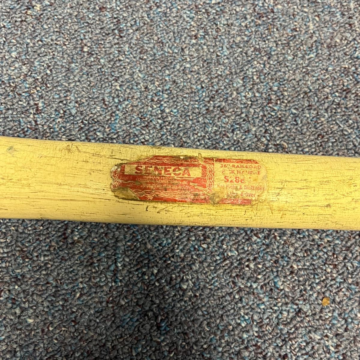 Lot includes a Seneca pickaxe, ax and a short handled hoe, all with wooden handles. Pickaxe measures 15” x 3.5” x 36” long.