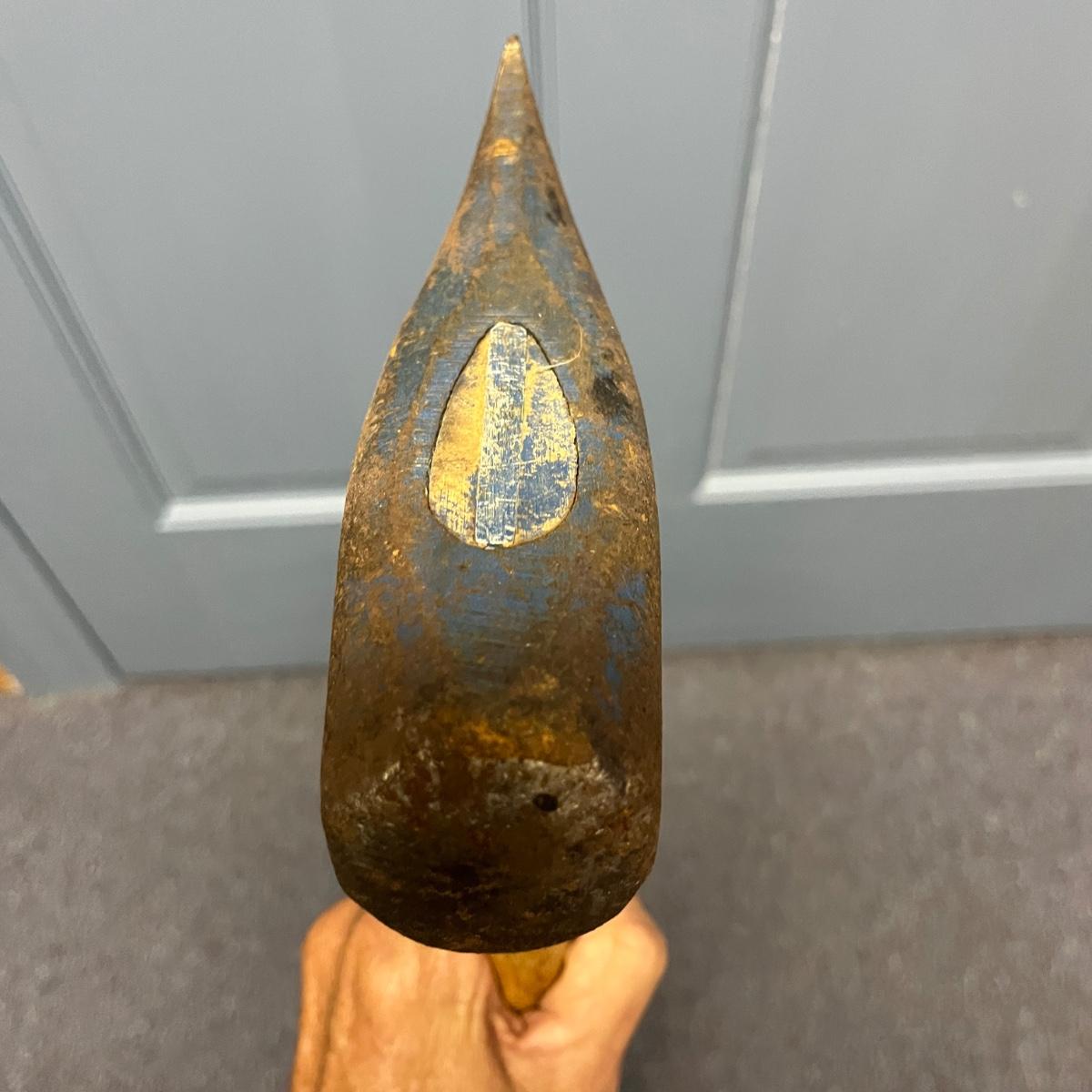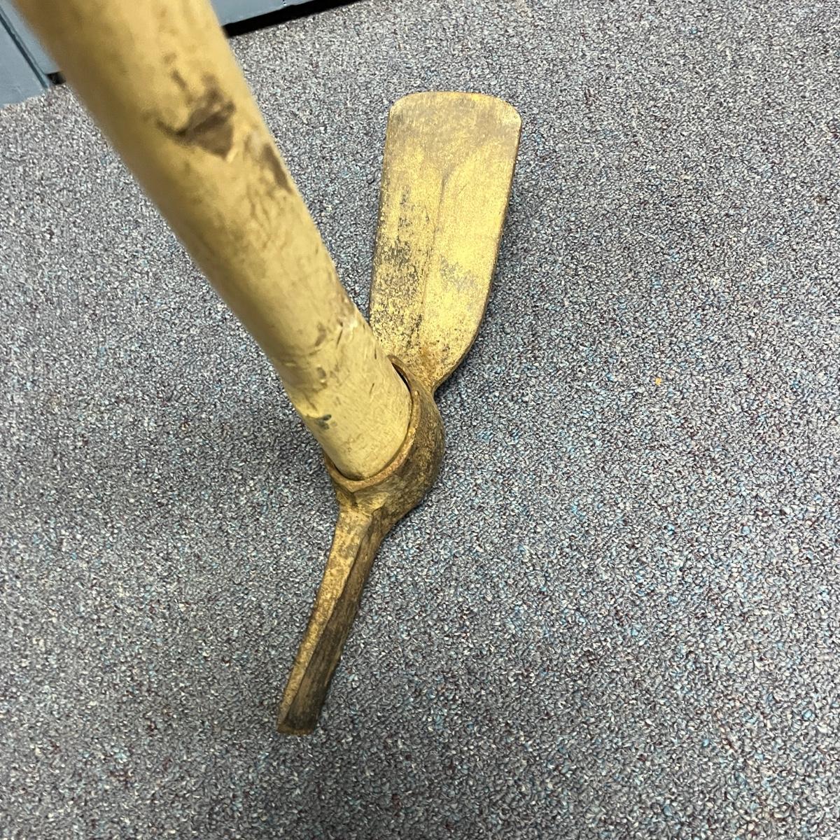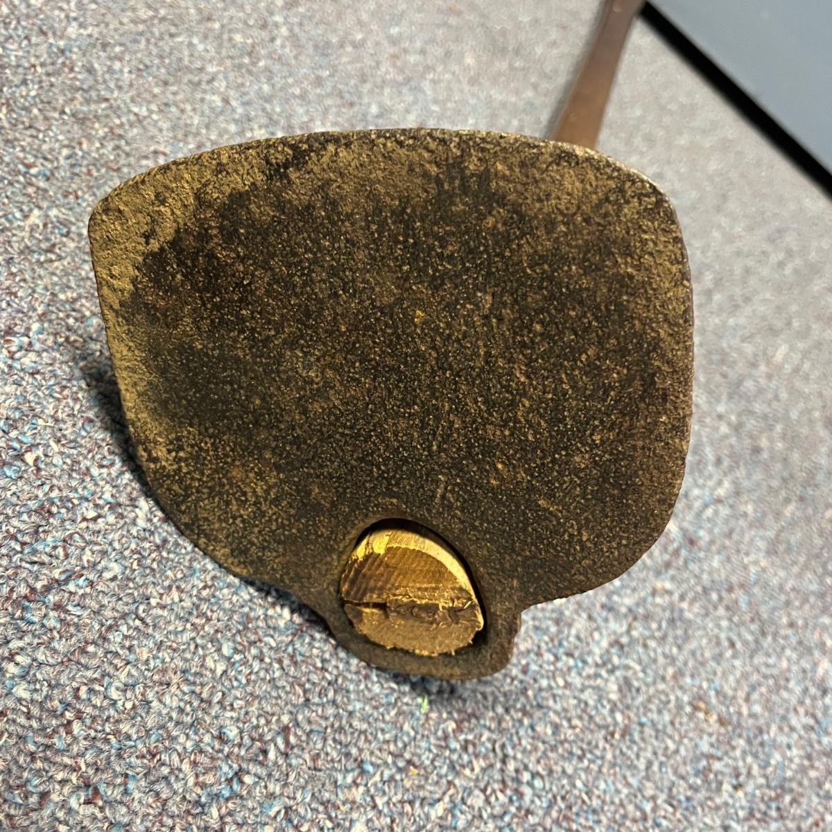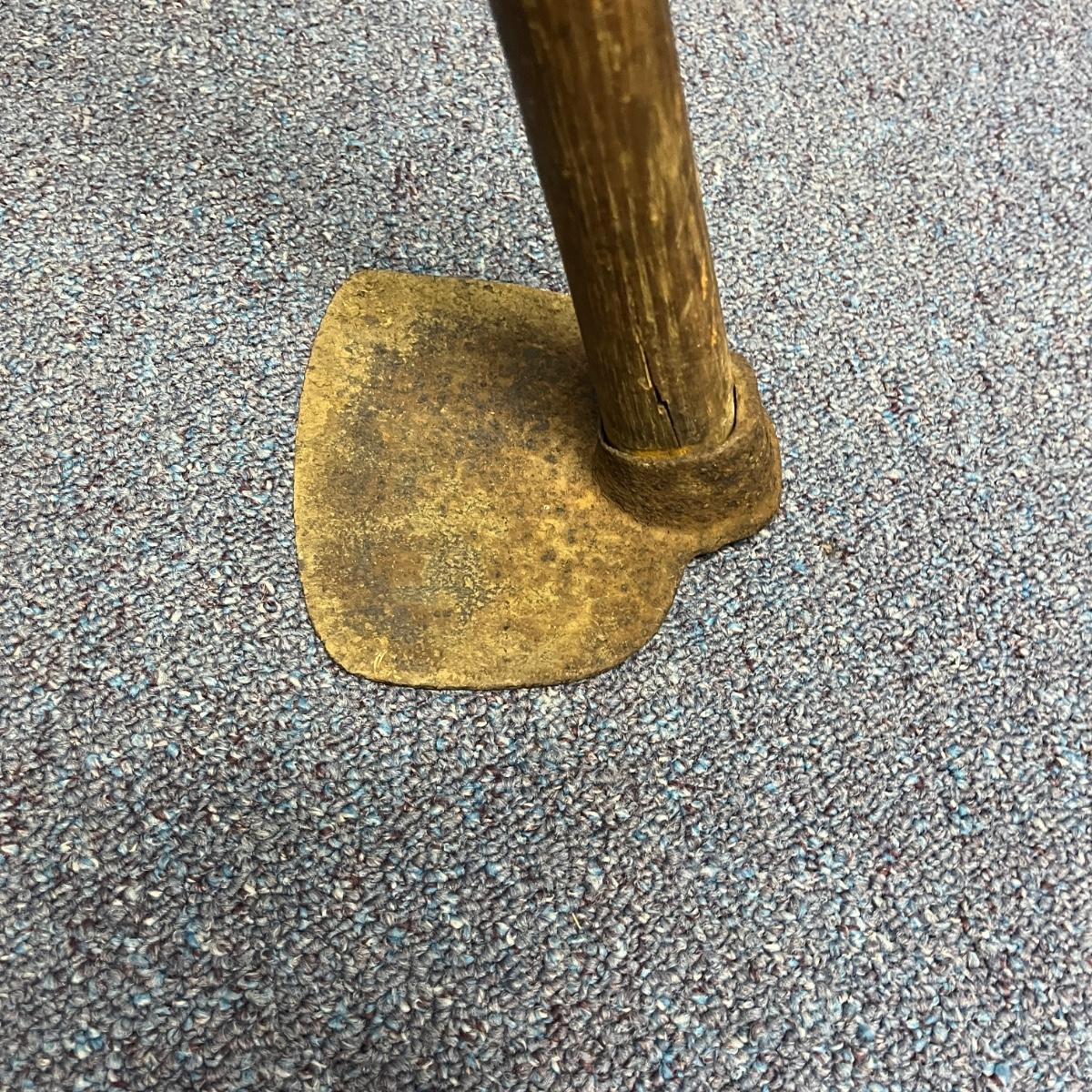 Lot includes a Seneca pickaxe, ax and a short handled hoe, all with wooden handles. Pickaxe measures 15” x 3.5” x 36” long.