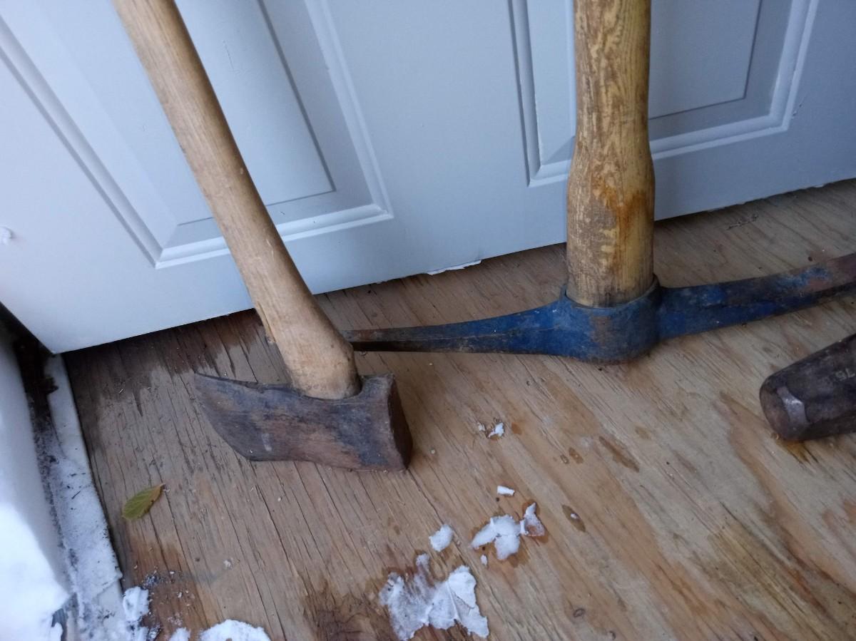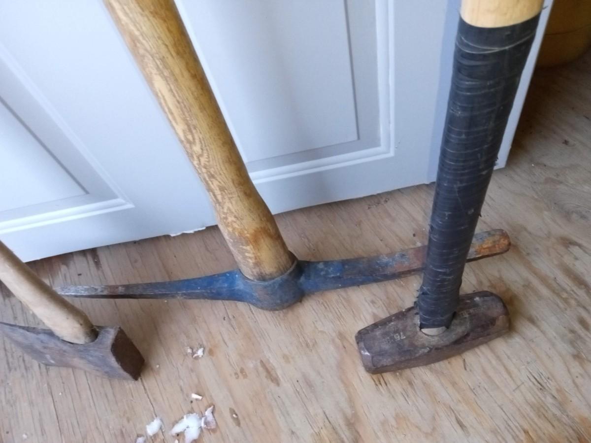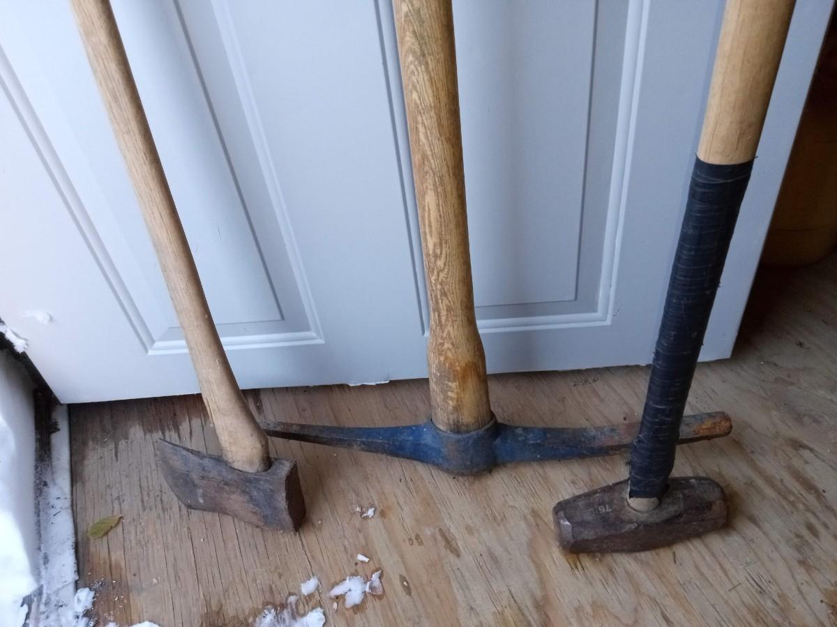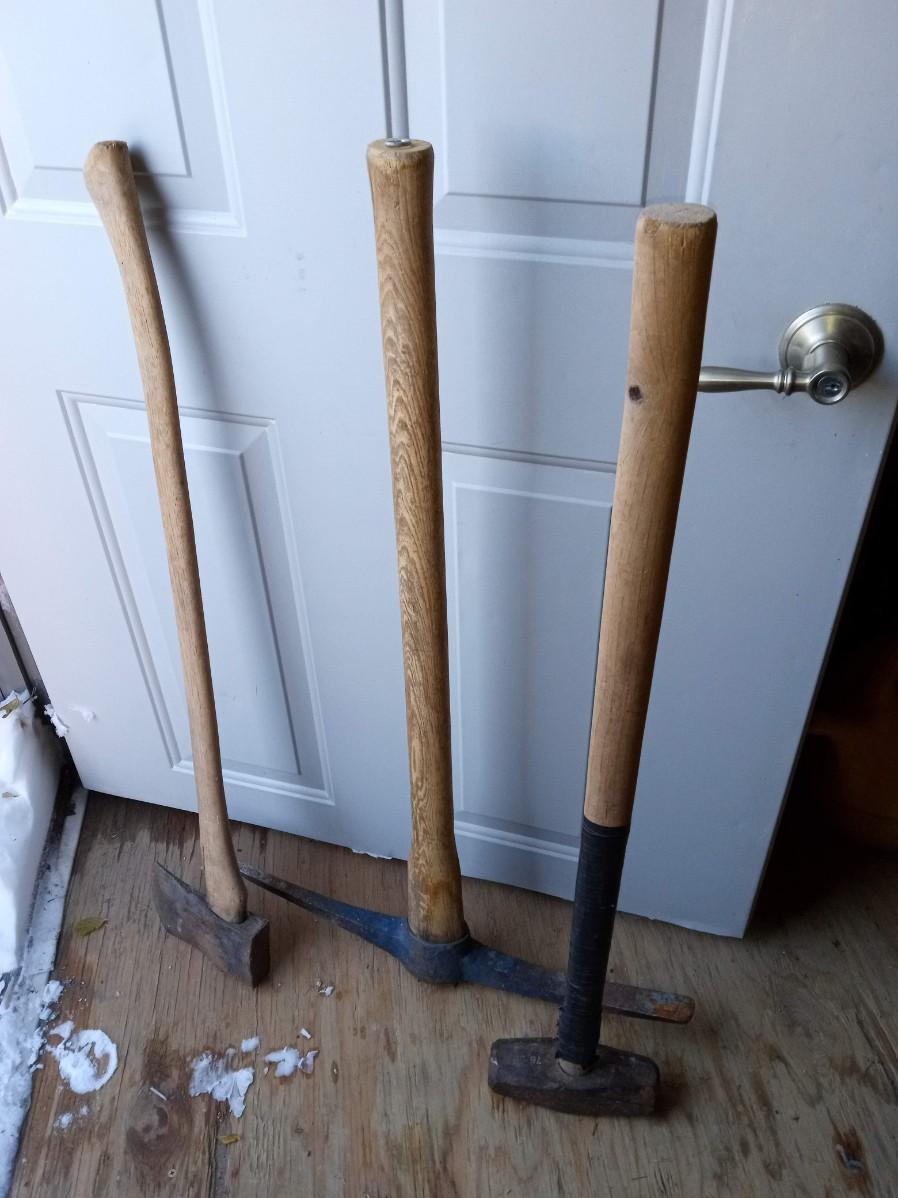 AXE, SLEDGE HAMMER AND A PICK AXE