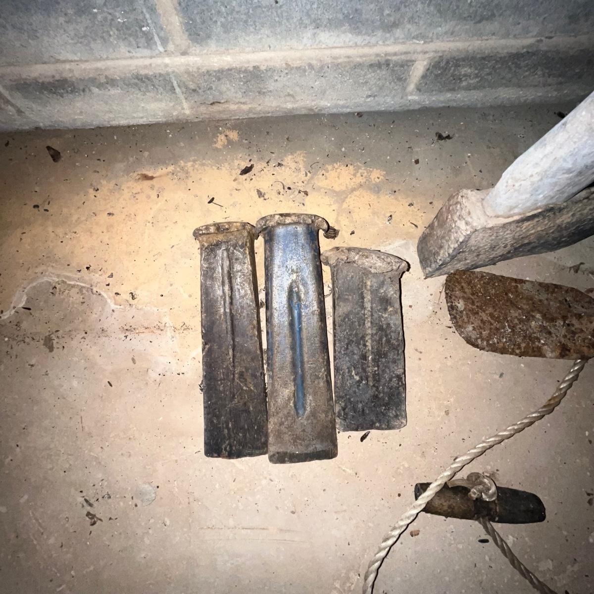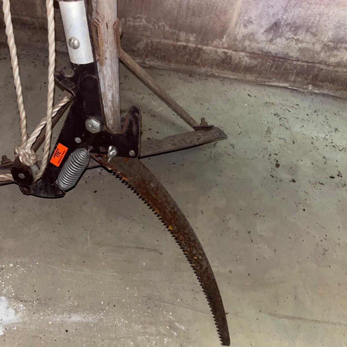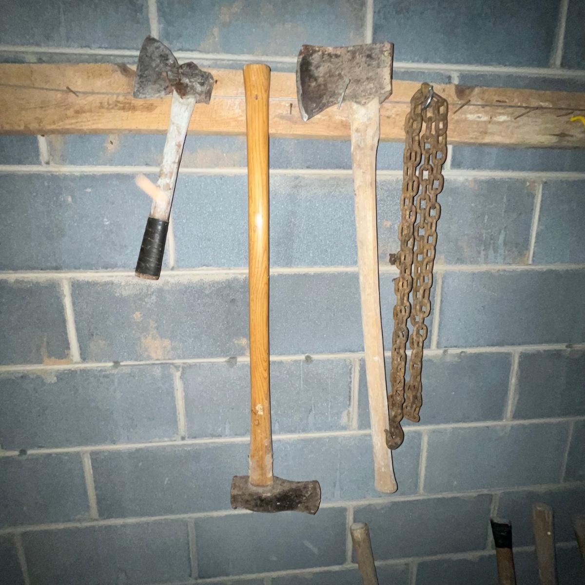 Lot includes three wedges, two axes, one axe/sledge combo, hatchet, three pick axes, pole saw, chain and more. Tallest axe measures 37”. Pole saw with blue handle is 60”. Local Pickup Only